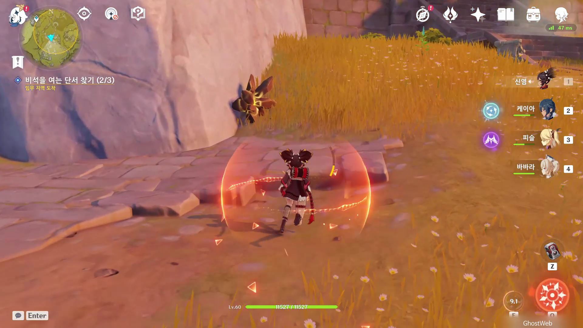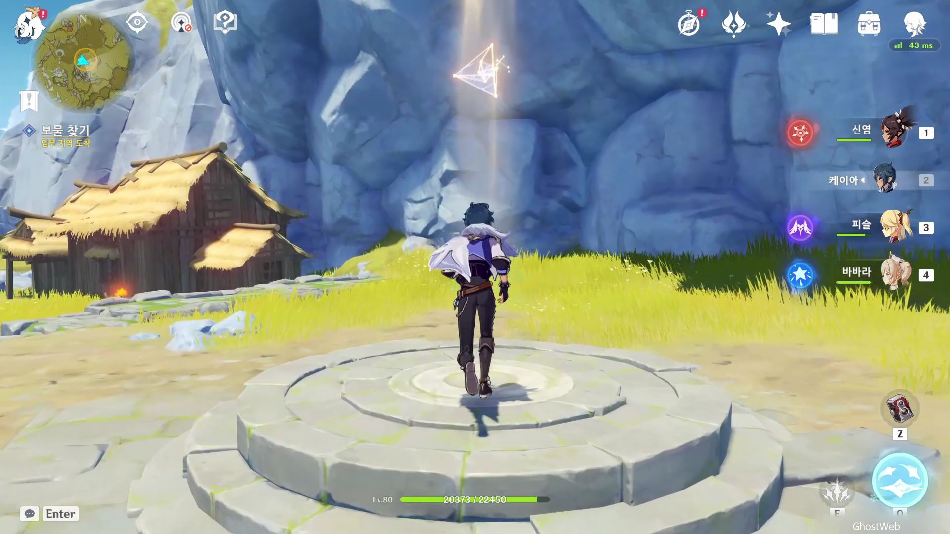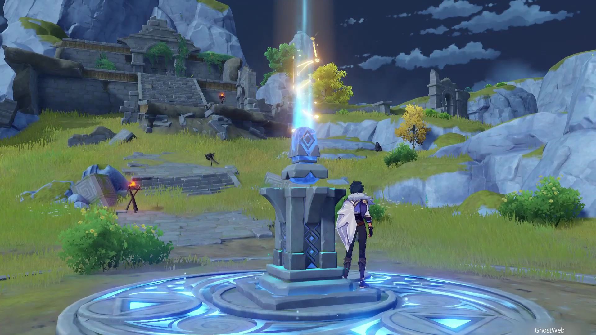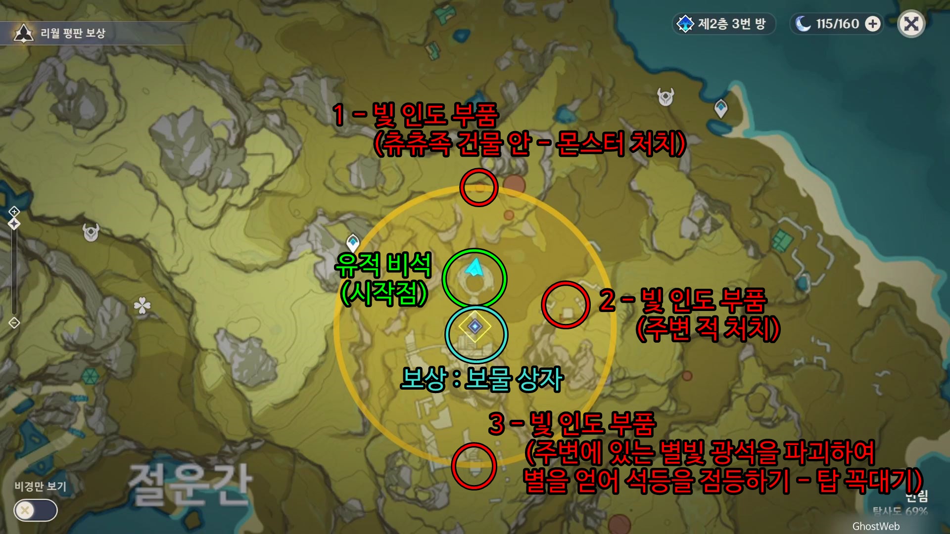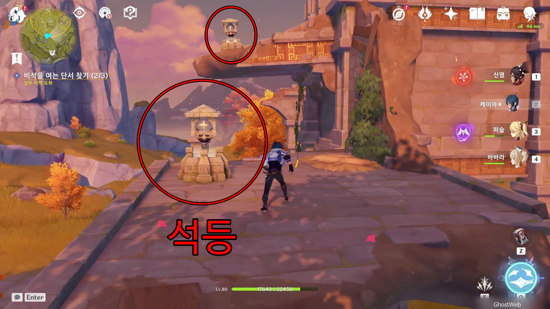 유적 비석 기준 지도 상 6시 방향에 있는 유적지로 가서 주변에 있는 빛나는 광석을 파괴하여 빛을 얻은 후 유적지 2층, 3층에 있는 2개의 석등에 다가가 등을 점등 시키면 돼요.