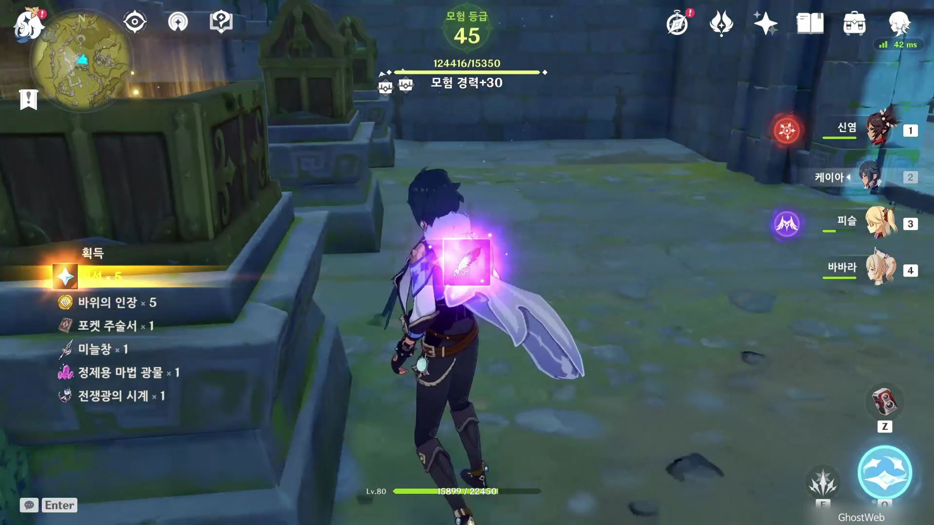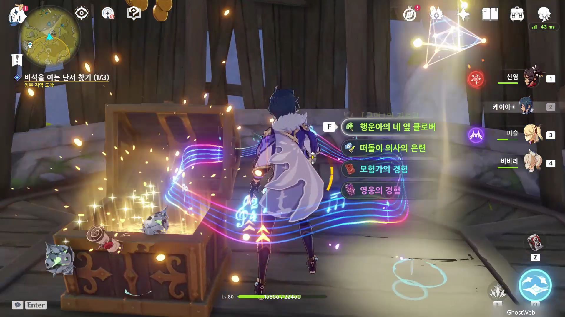 모든 빛 인도 부품을 모으면 원석 보상을 얻고 앞에 있는 유적지로 달려가 보물 상자 3개를 열려 보상을 획득하면 돼요.
