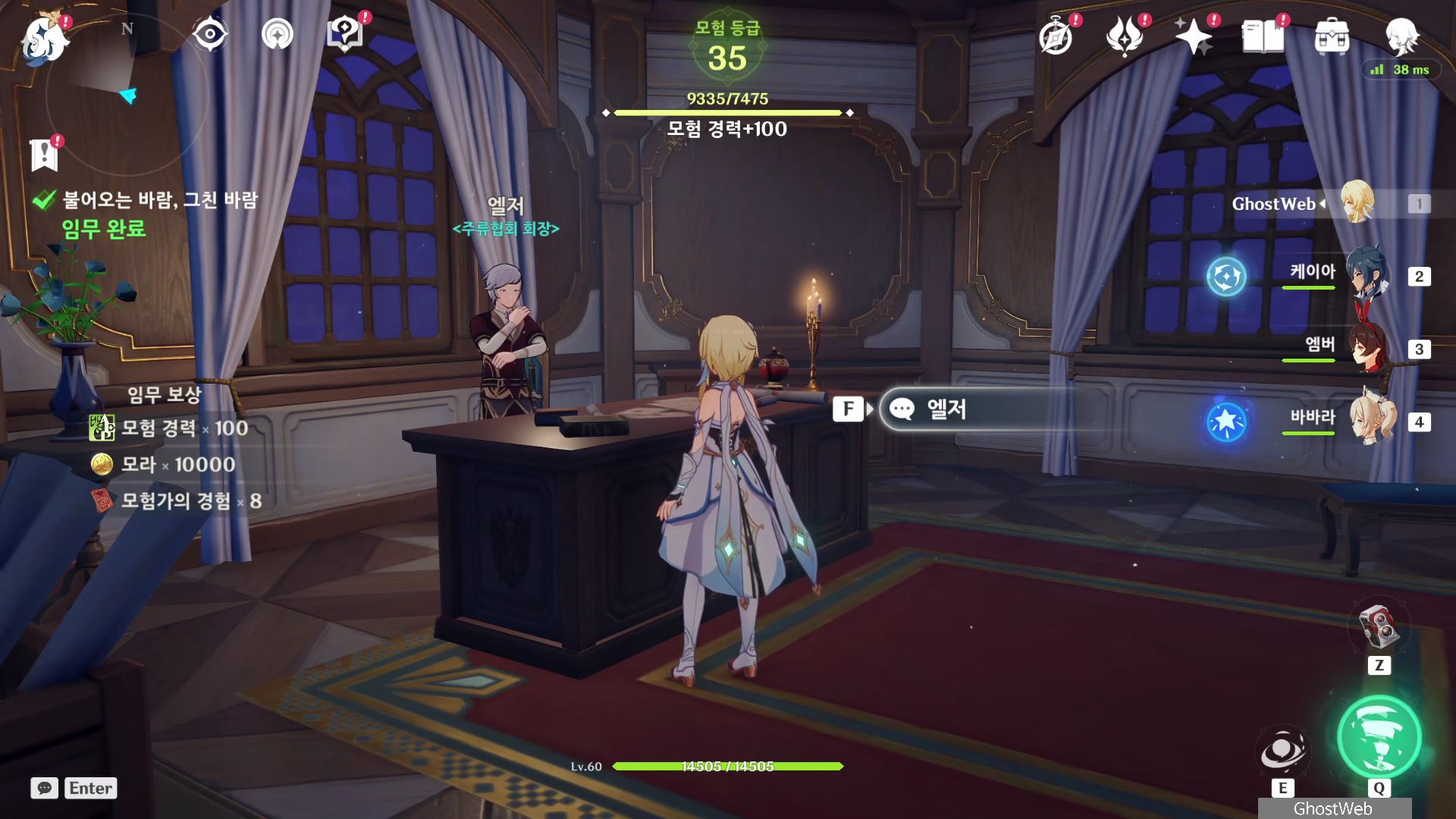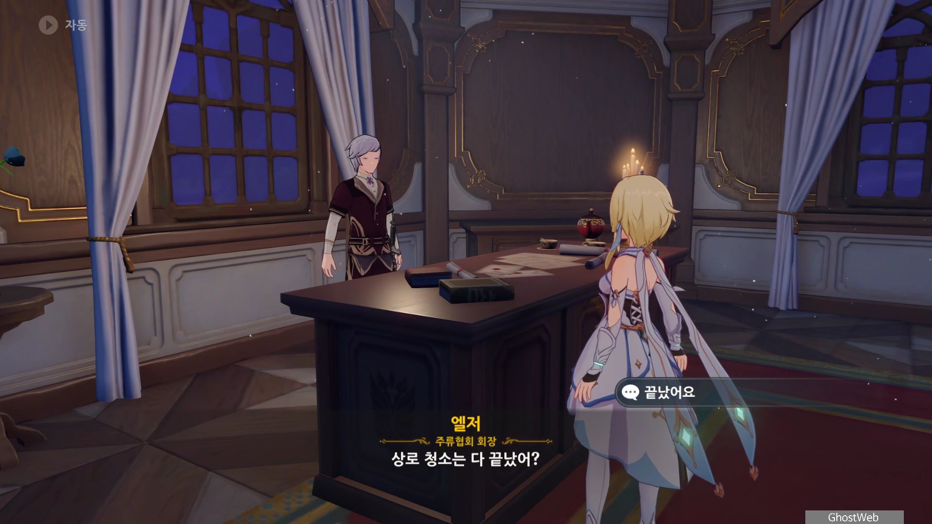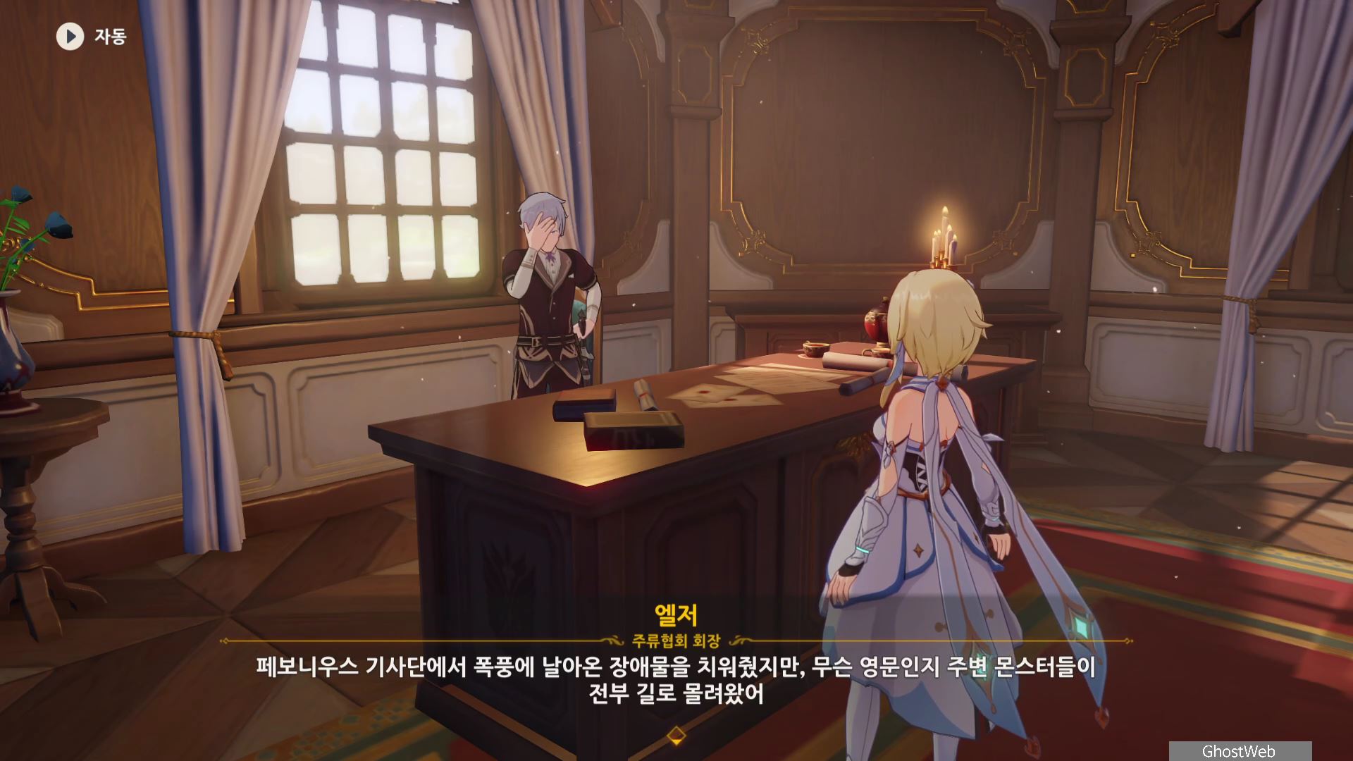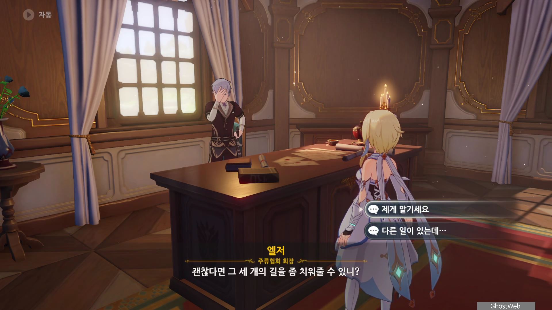 <불어오는 바람, 그친 바람> 임무는 몬드성 아래에 있는 <다운 와이너리>에 있는 저택안으로 들어가 바로 왼쪽에 있는 주류협회 회장 <엘저>에게 말을 걸면 임무를 시작할 수 있어요.