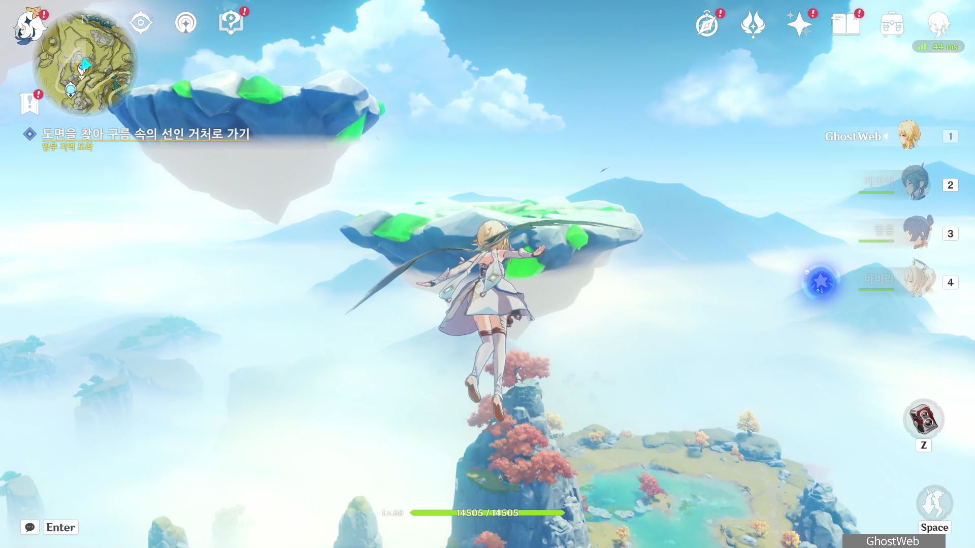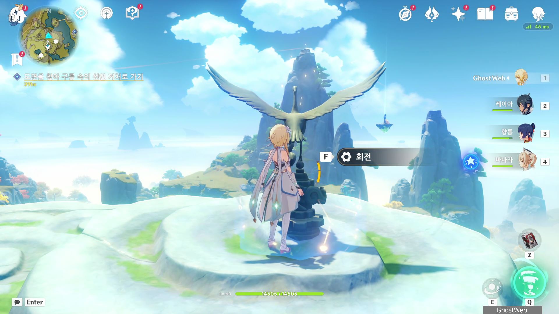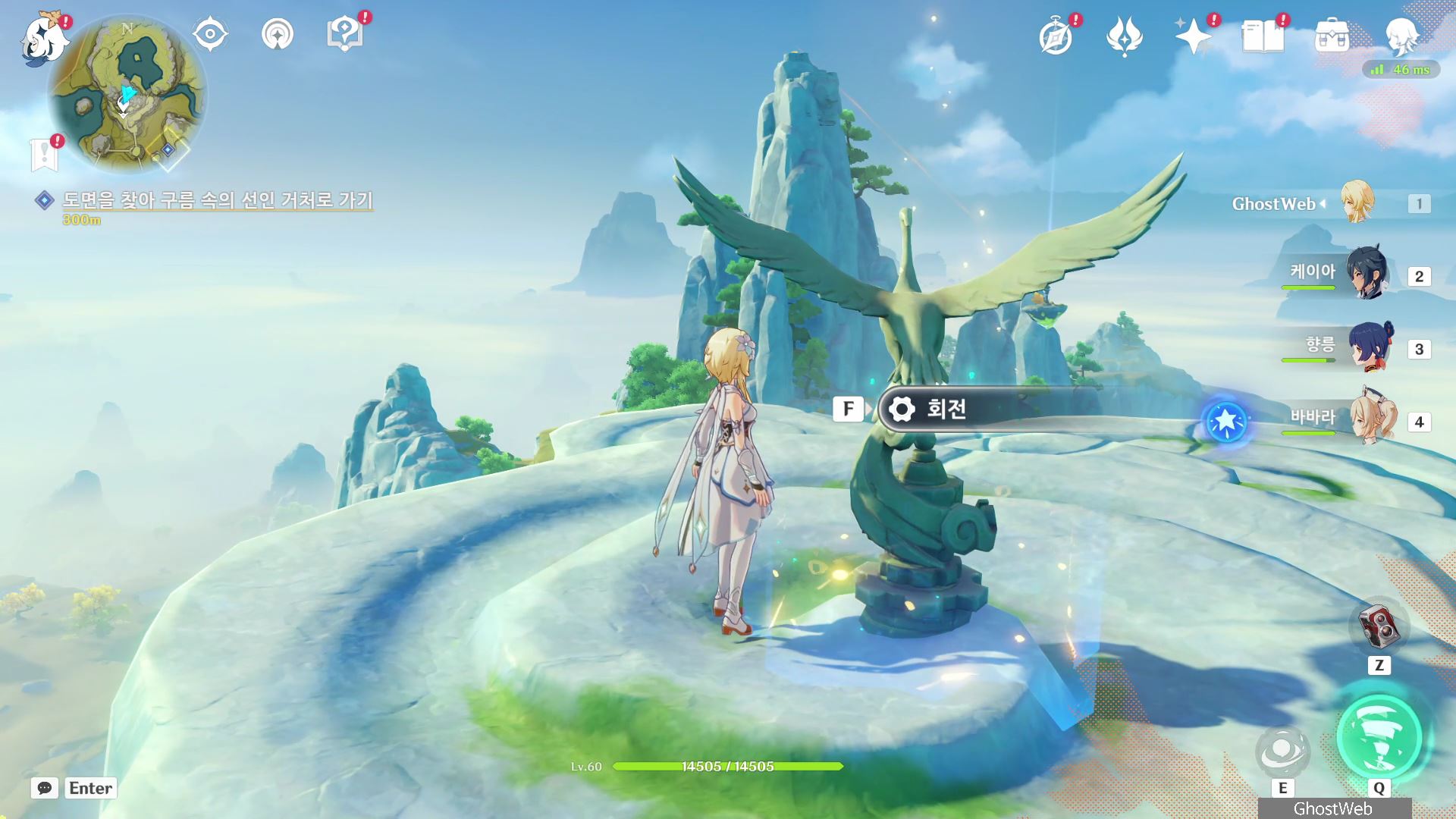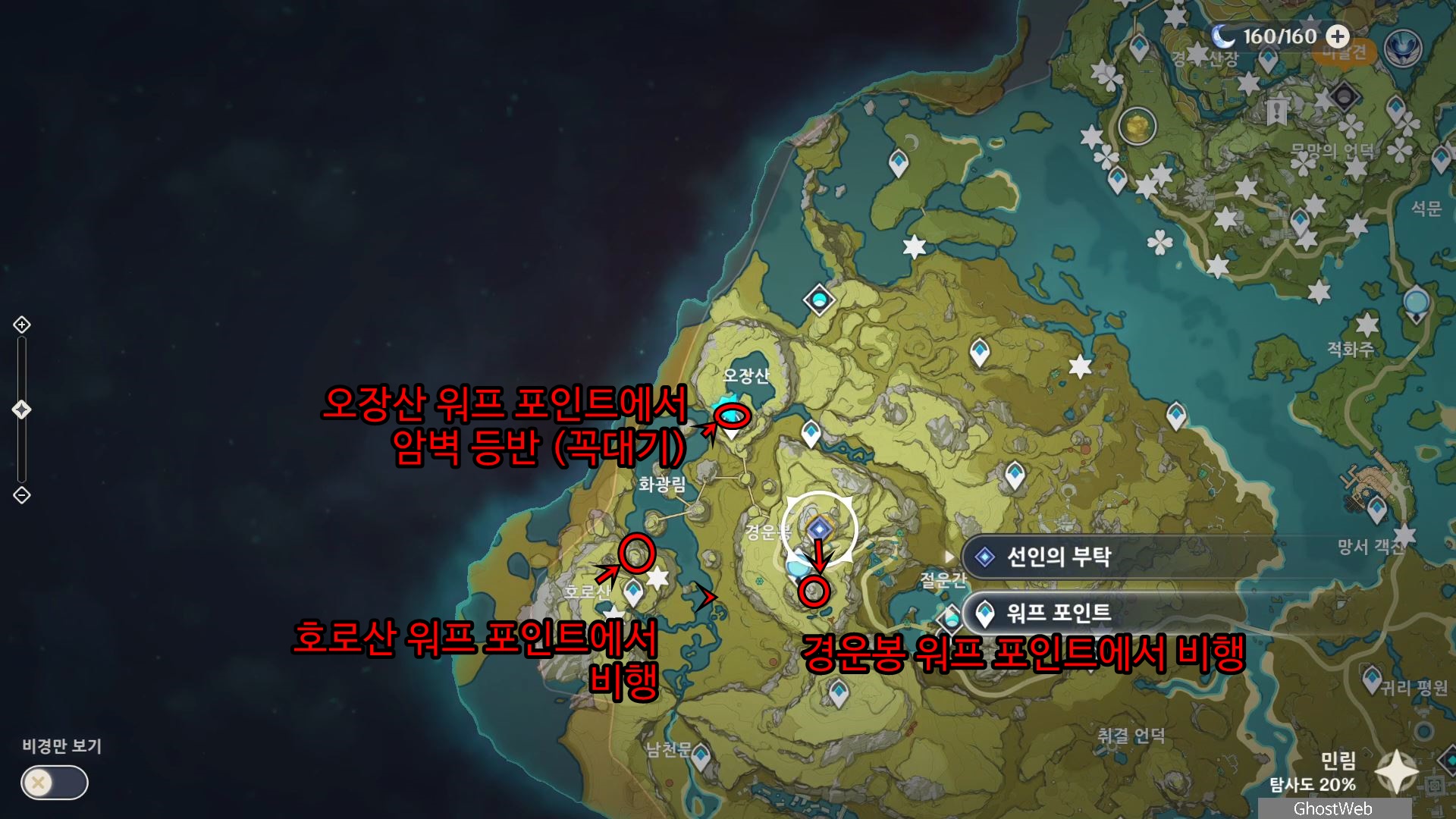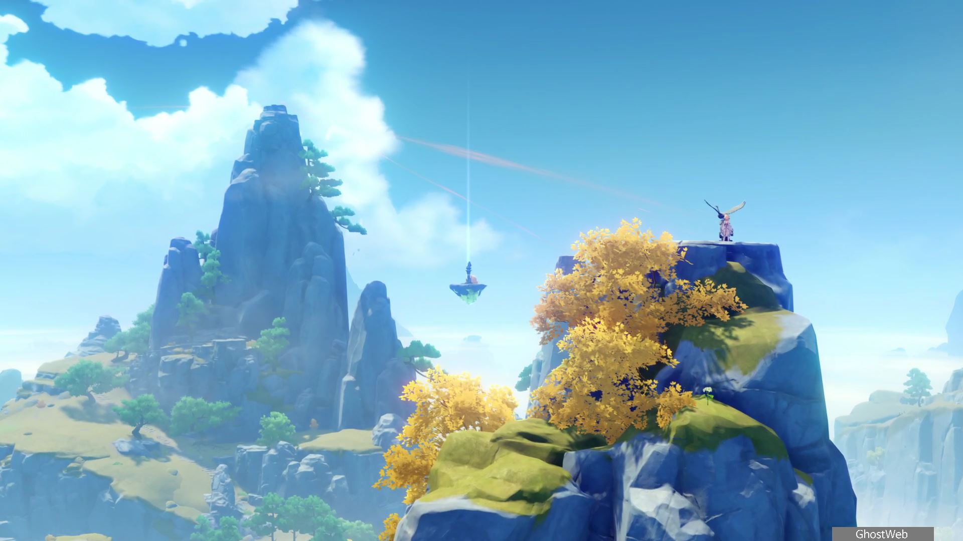 세 개의 산봉우리에 있는 새 동상이 경운봉을 봐라보게 만든 후 다시 경운봉에 있는 장치로 돌아와 장치를 활성화하면 윈드 필드가 생성되는데, 이 윈드 필드를 타로 위로 올라가면 공중에 떠 있는 <구름 속의 선인 거처>에 도착할 수 있으며 <풍경 감상> 업적을 달성과 바위 신의 눈동자를 획득 할 수 있어요.