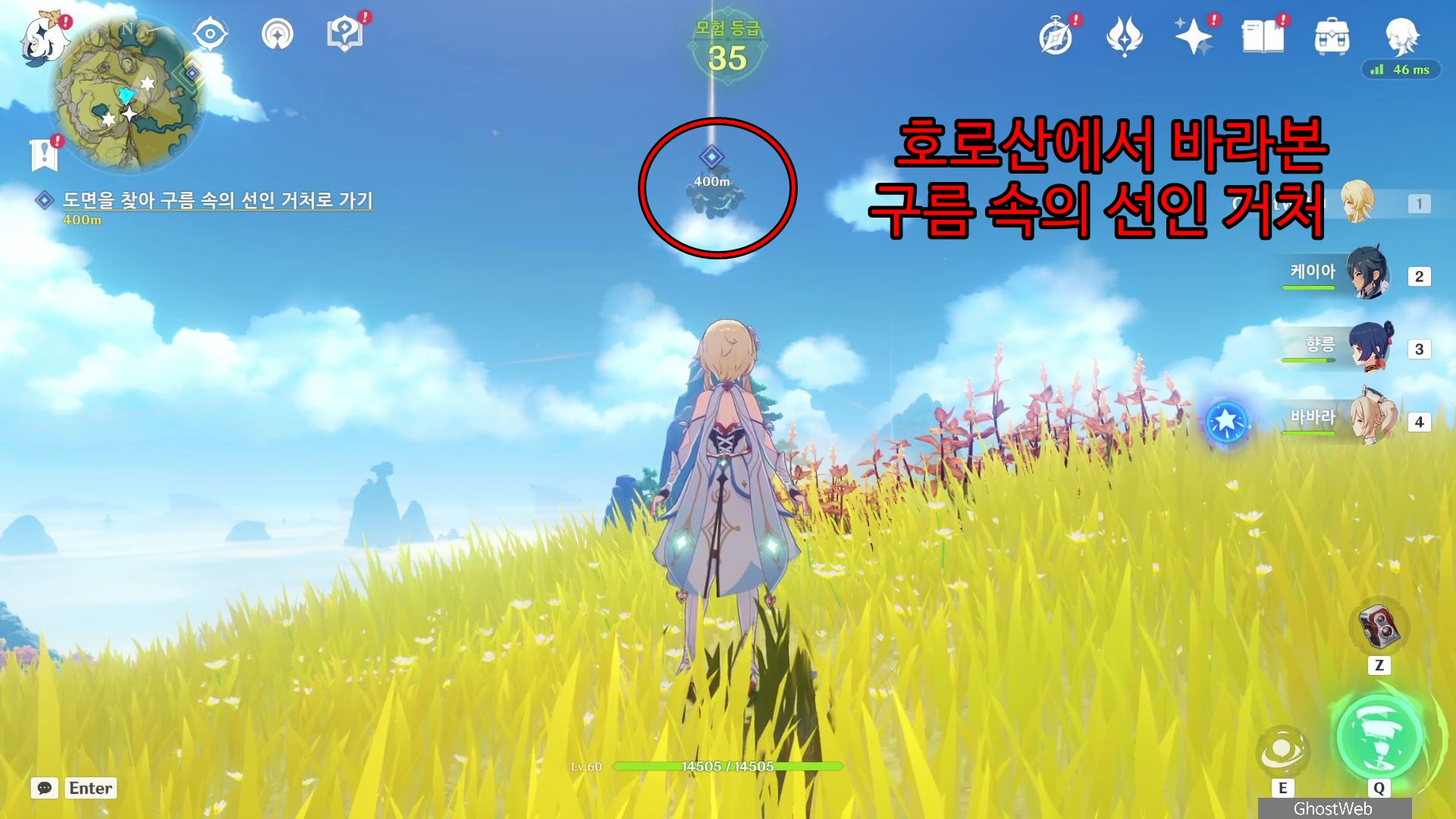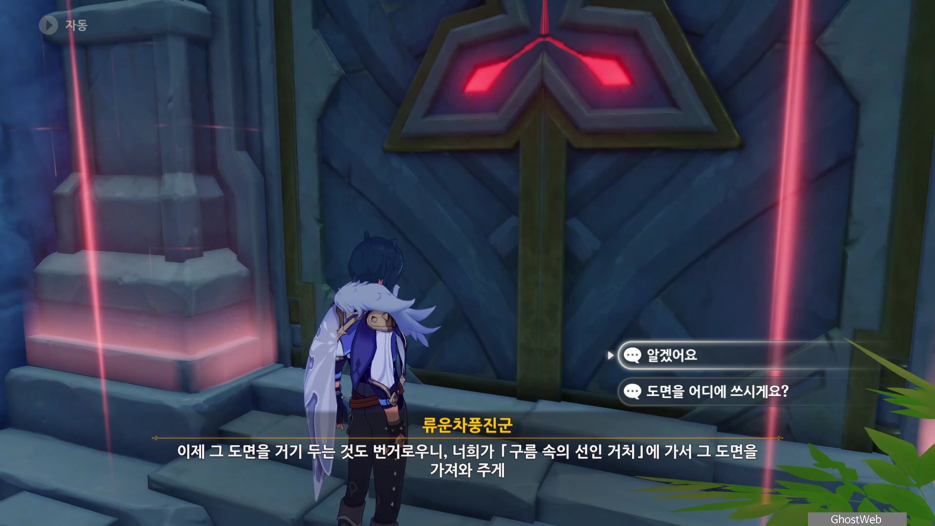 진주비취백옥탕을 공양하면 류운차풍진군이 말을 걸며 공중에 떠 있는 <구름 속의 선인 거처>라는 곳에 있는 도면을 가져다 달라는 부탁을 여행자에게 해요.