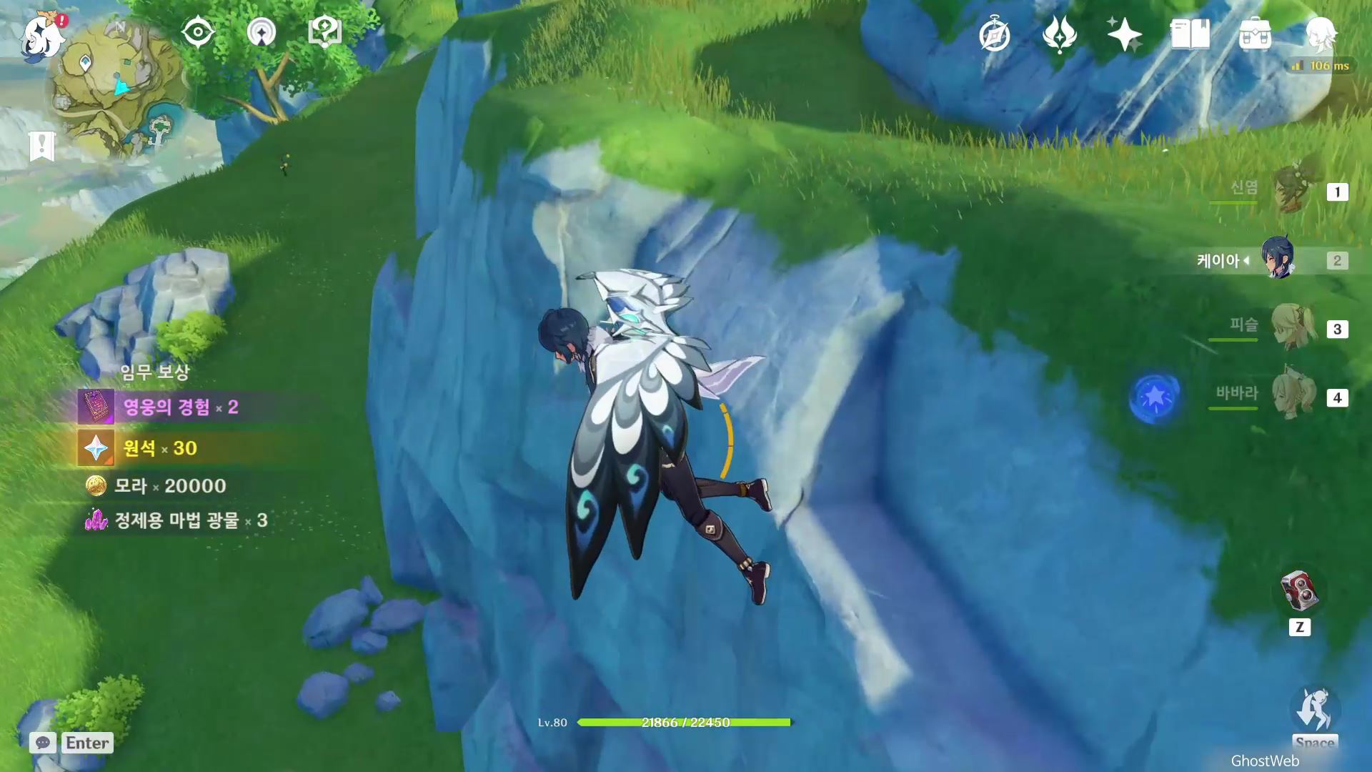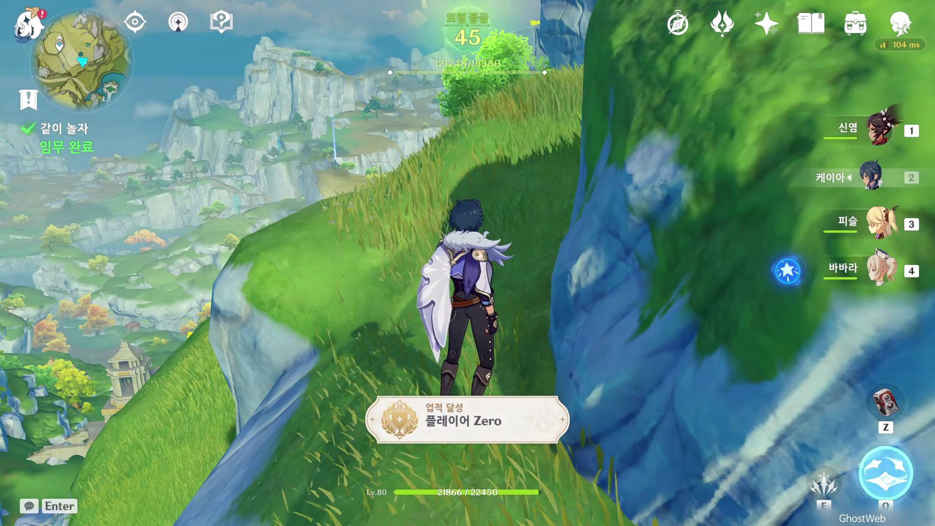 마지막으로 숨은 강이를 찾으면 <플레이어 Zero> 업적 달성과 임무 보상으로 영웅의 경험 2개, 원석 30개, 모라 20000, 정제용 마법 광물 3개를 얻을 수 있어요.