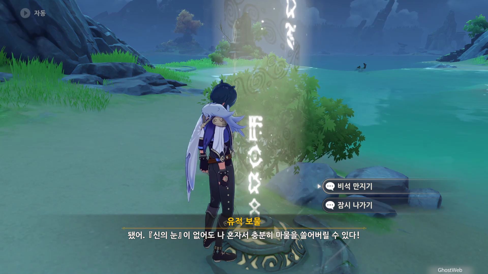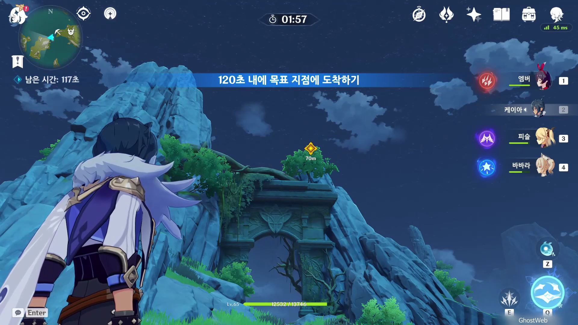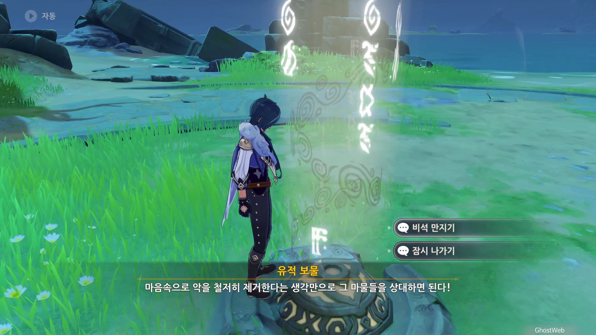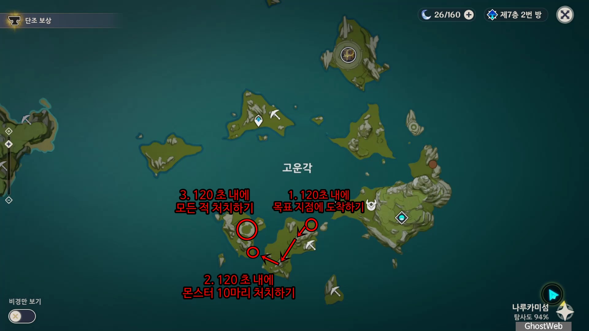 고운각 6시 방향에 있는 섬 근처에 있는 유적 보물에가서 비석을 만지면 <120초 내에 목표 지점에 도착하기>가 시작돼요.
