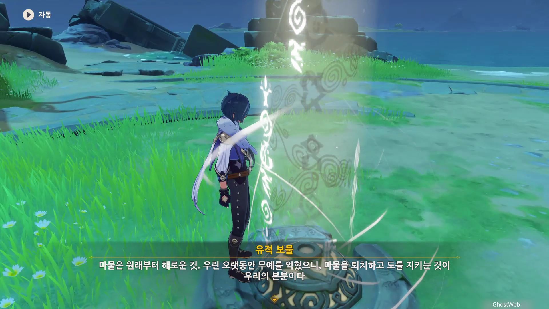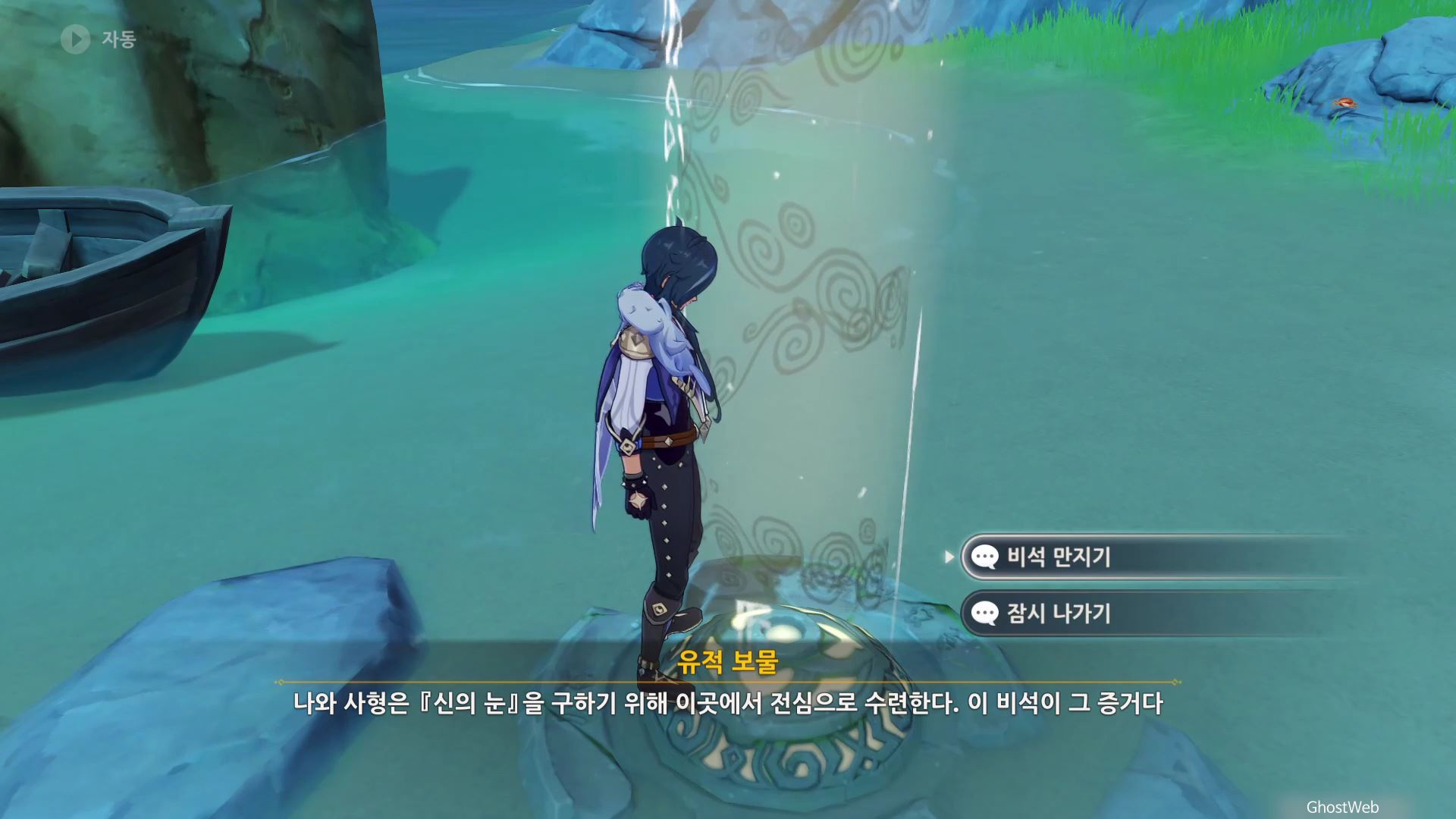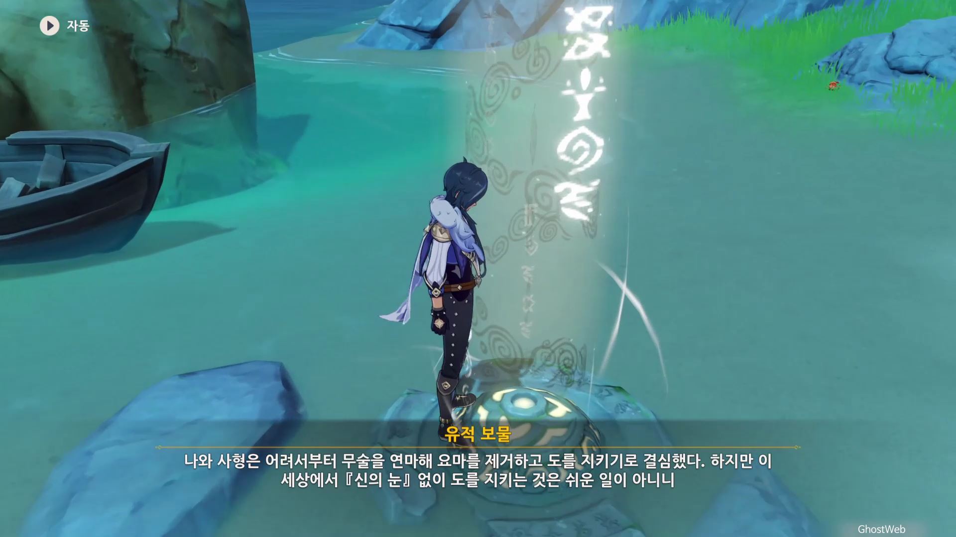 고운각 6시 방향에 있는 섬 근처에 있는 유적 보물에가서 비석을 만지면 <120초 내에 목표 지점에 도착하기>가 시작돼요.