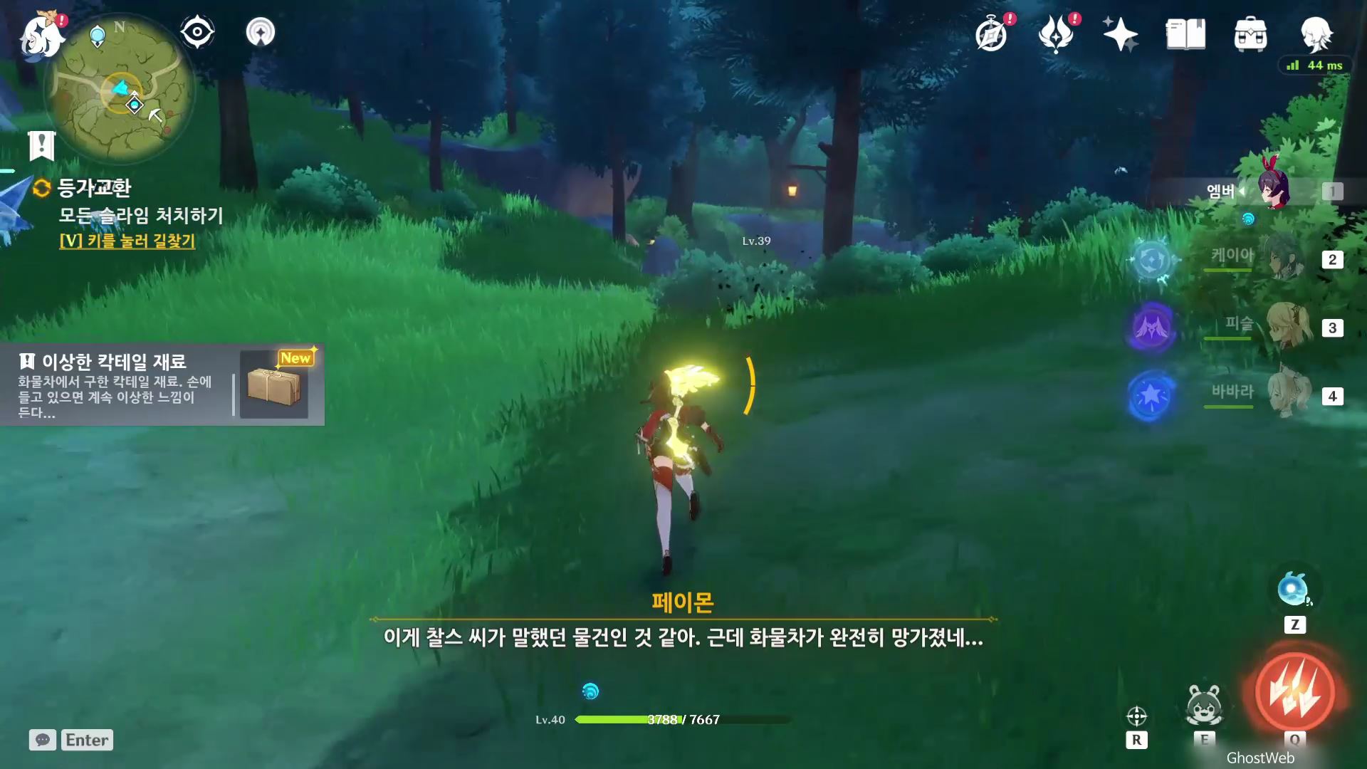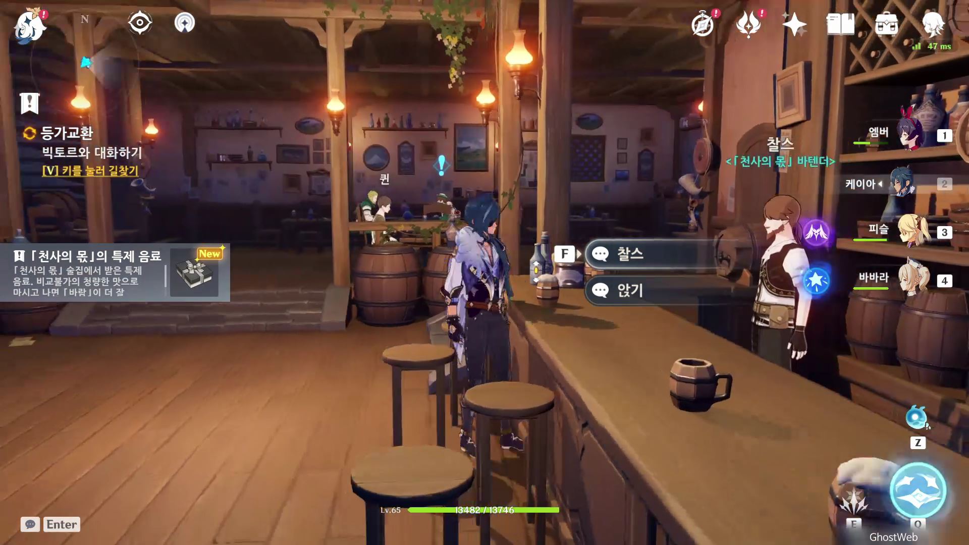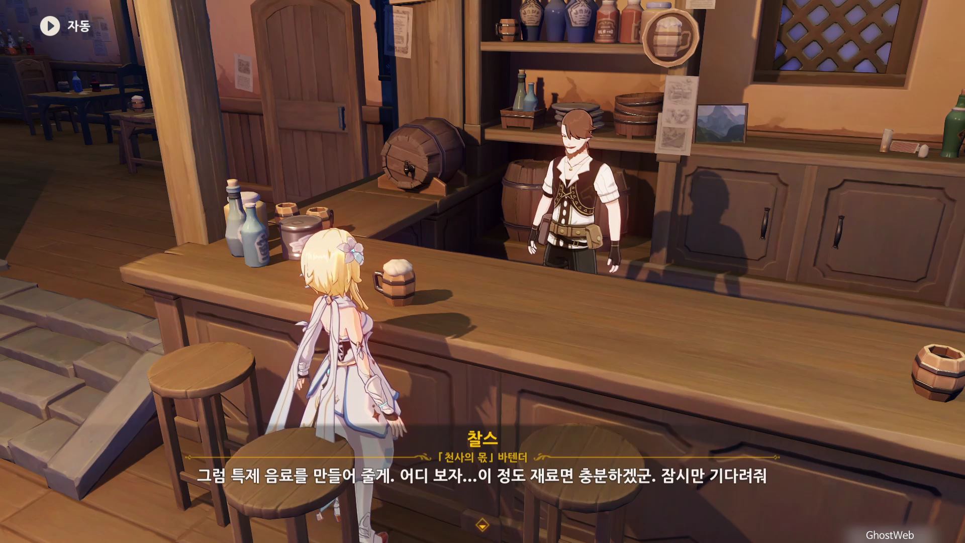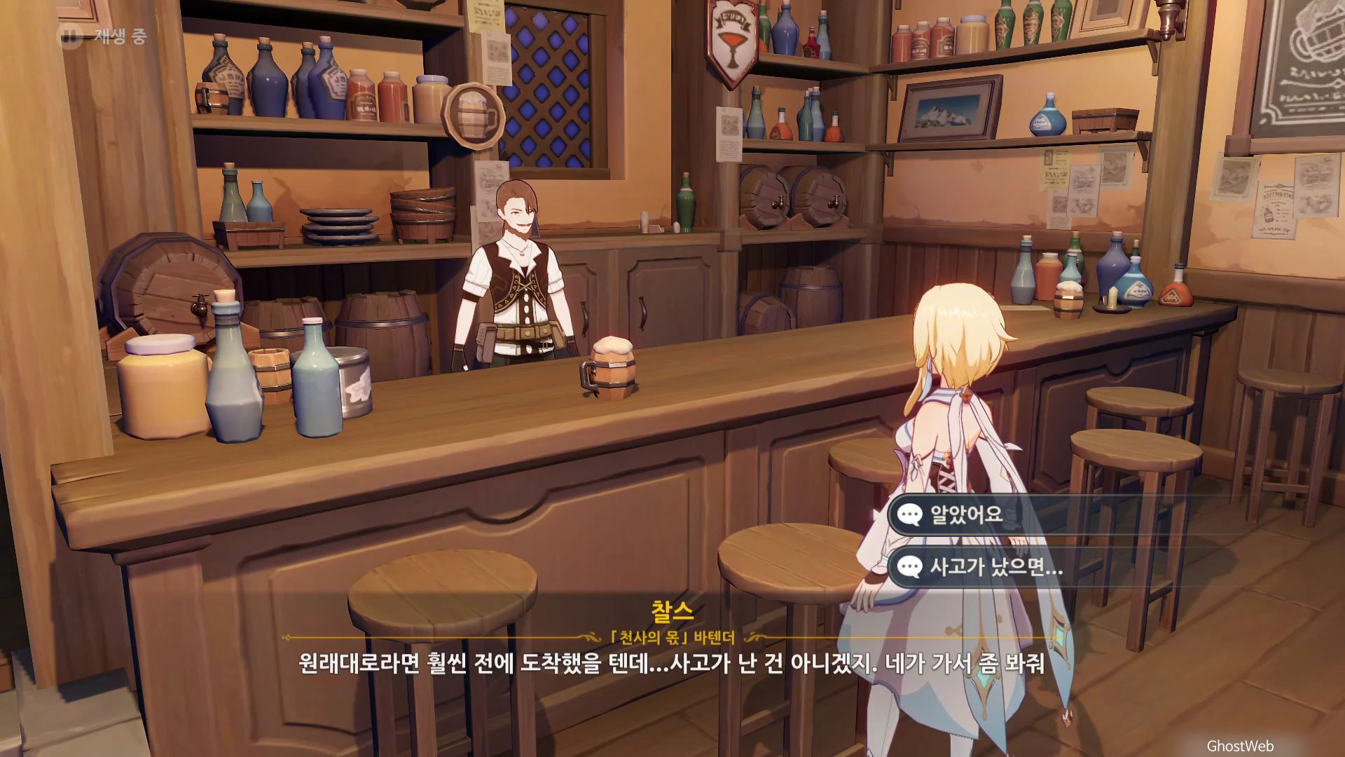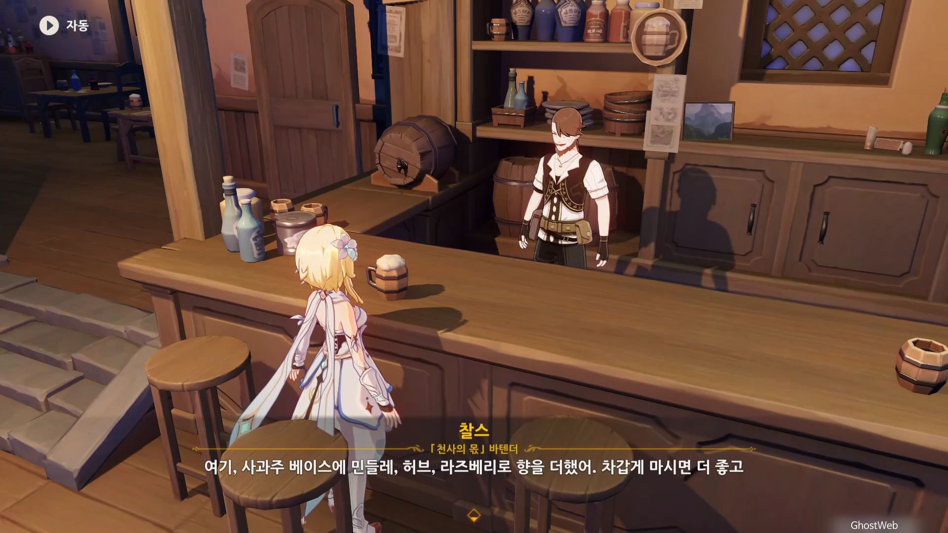 이제 마지막으로 천사의 몫에 있는 찰스에게 가서 몬드 성의 특산품에 대한 이야기를 나누면 특색 음료에 대한 이야기를 하는 음료 제조에 쓰이는 재료가 아직 오지 않았다며, 여행자에게 사고가 난 건 아닌지 확인해달라는 부탁을 해요.