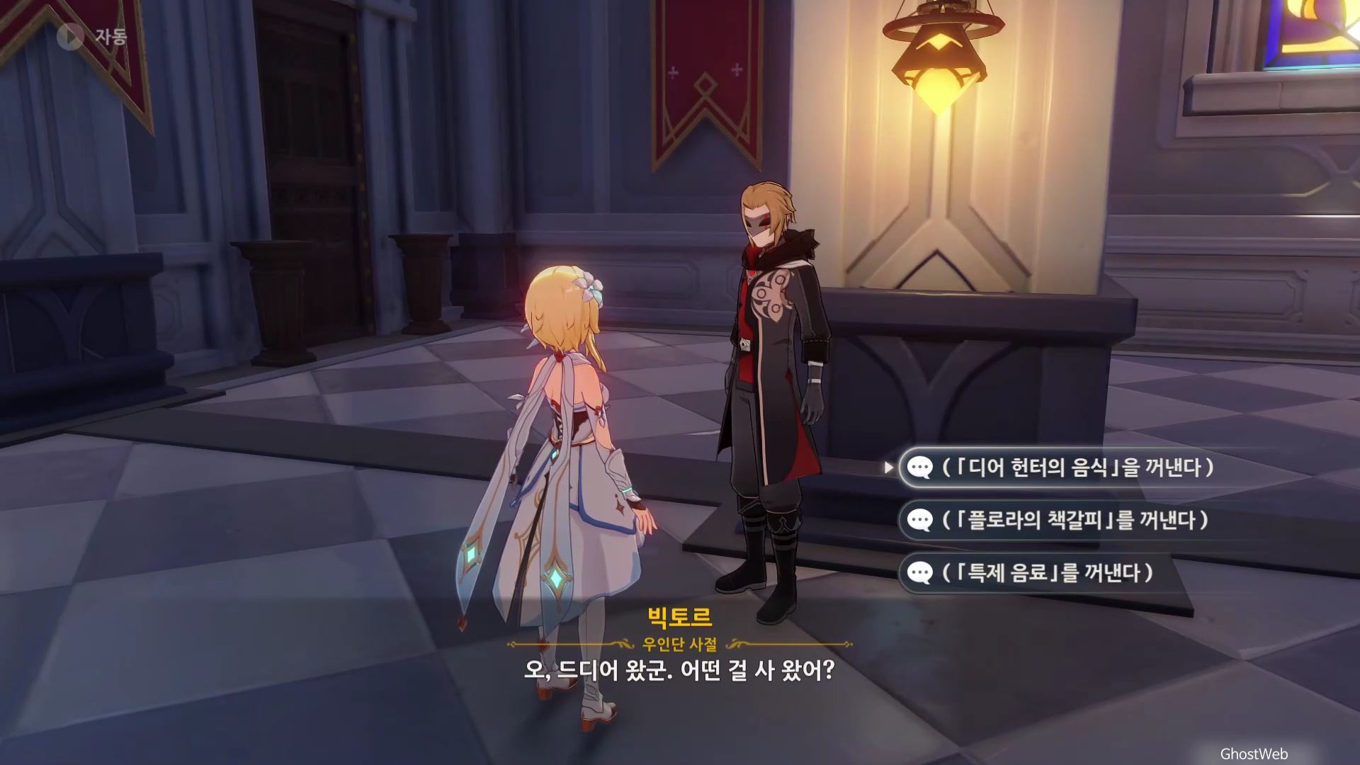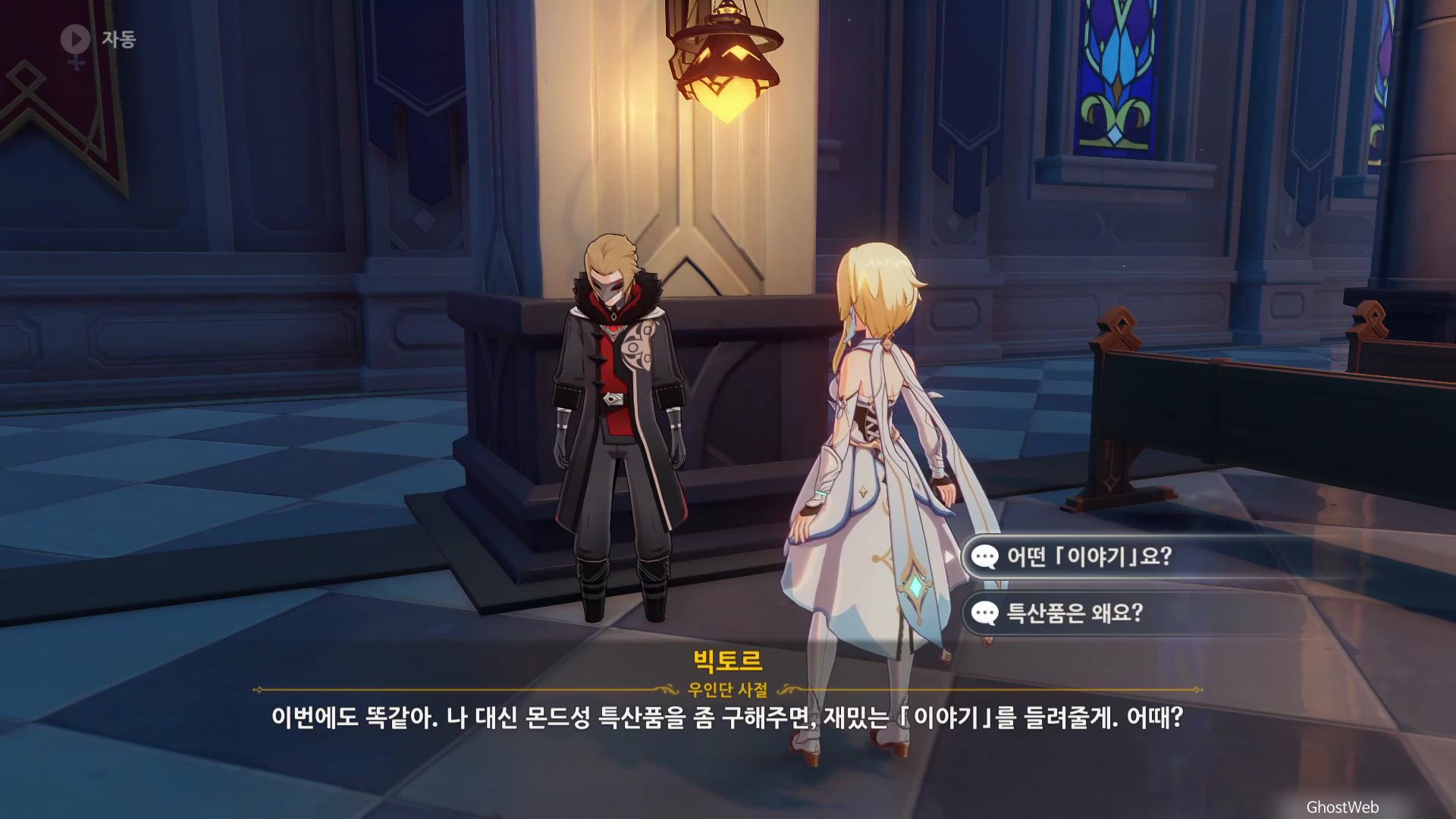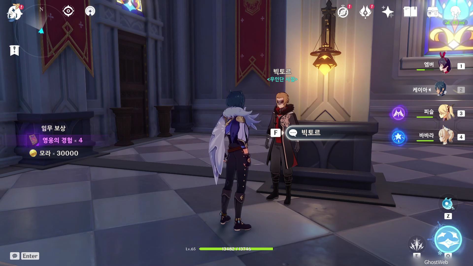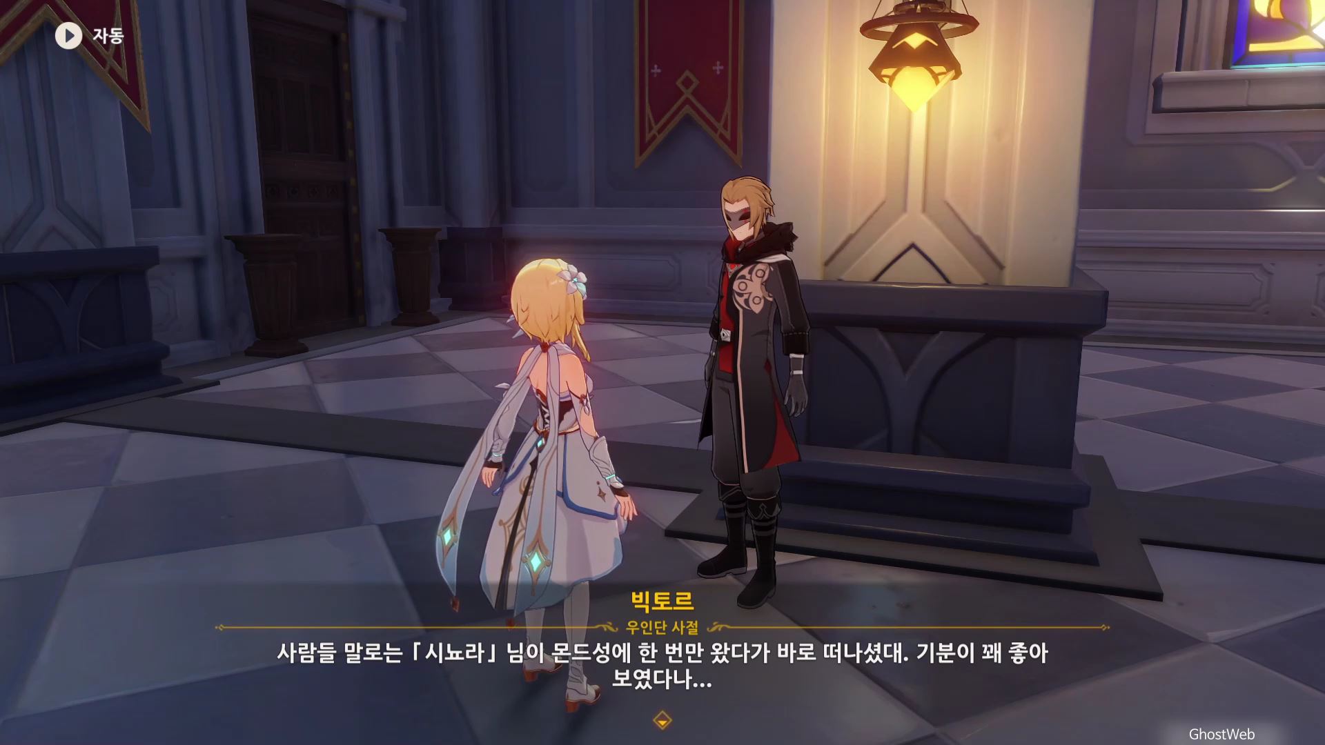 다시 몬드 성당으로 들어가 빅토르와 대화를 통해 집행관 시뇨라, 스카라무슈(서열 6위)에 대한 정보를 얻을 수 있으며, 대화를 끝으로 임무 보상 영웅의 경험 4개, 모라 30000를 얻을 수 있어요.