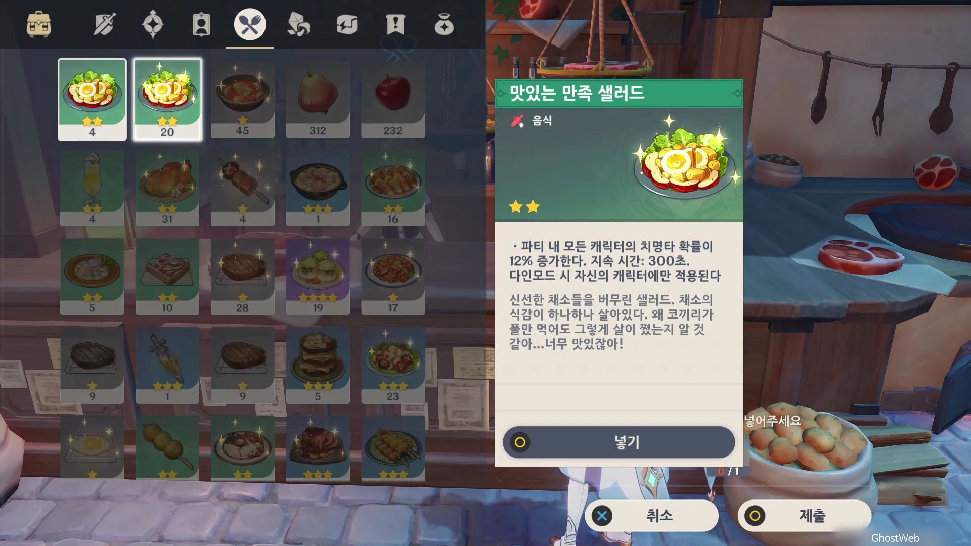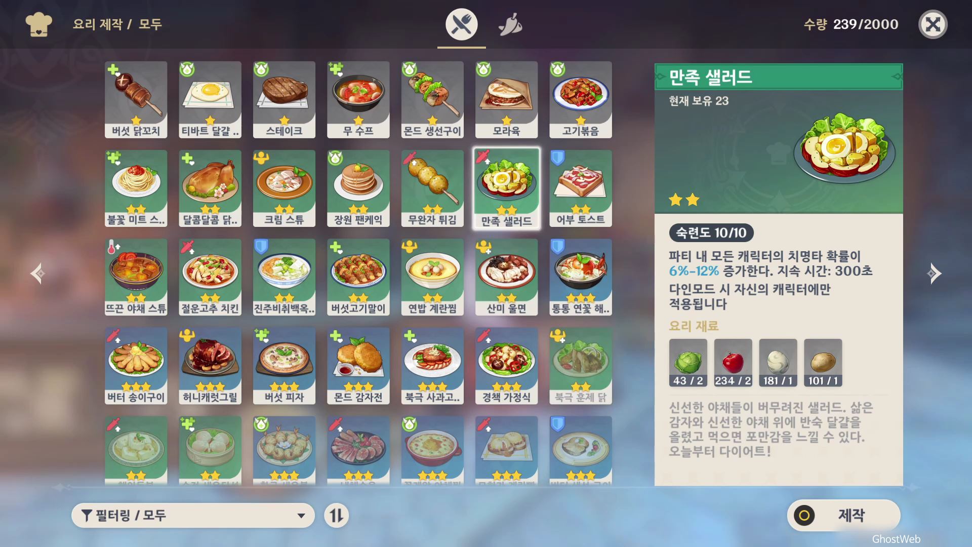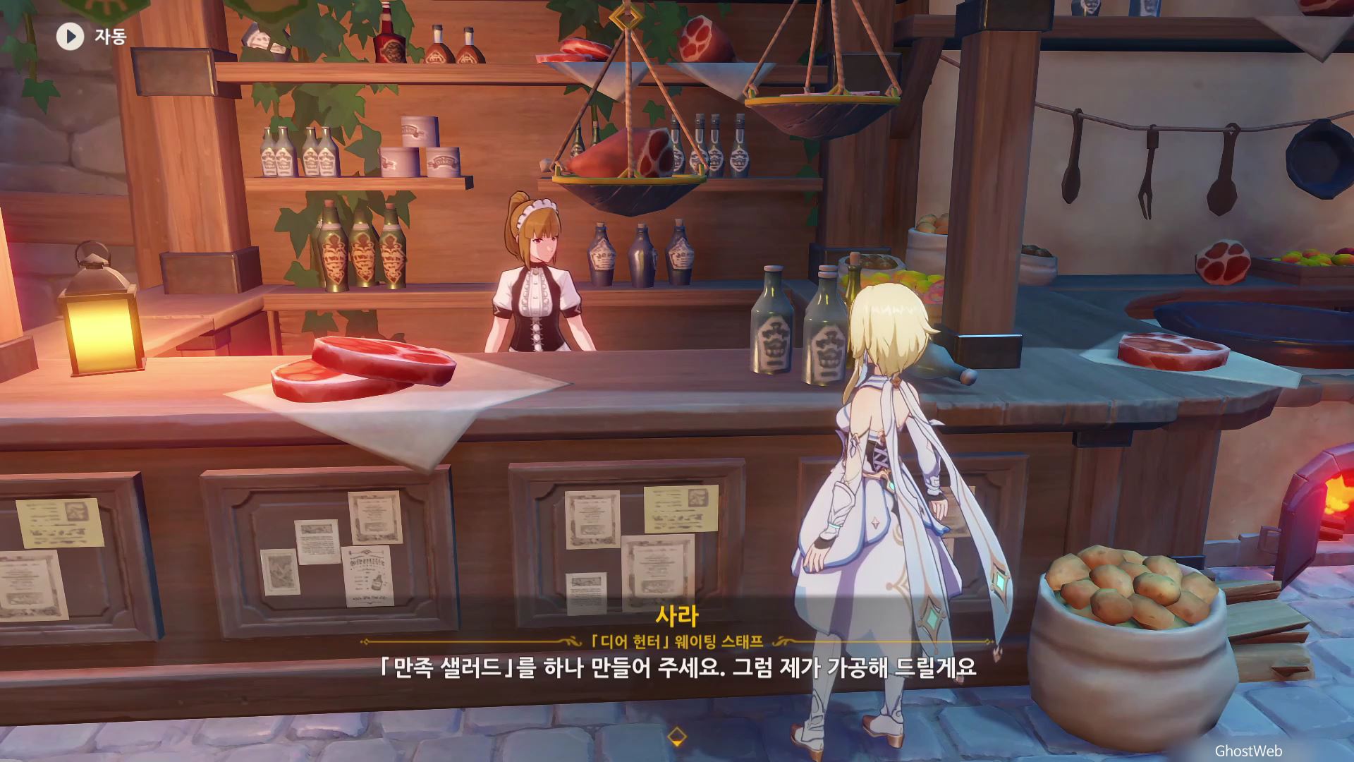 몬드 성 광장에 있는 디어 헌터 사라에게 대화를 걸면 특산품을 만들기 위해 <만족 샐러드> 하나를 만들어 달라고해요.