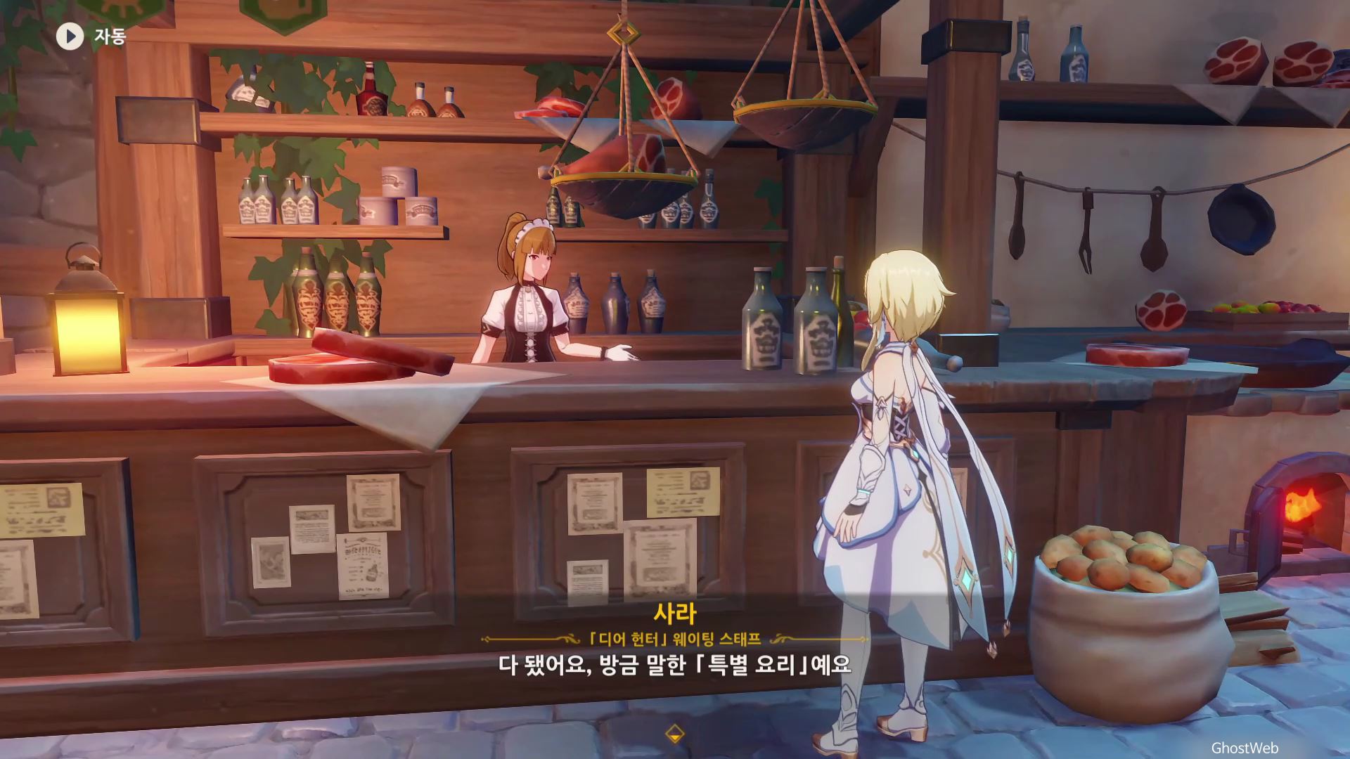 오른쪽에 있는 화로에 가서 만족 샐러드(양배추 2, 사과 2, 새알 1, 감자 1)를 요리한 후 다시 사라에게 가서 만족 샐러드를 주면 <디어 헌터의 특제 요리>를 얻을 수 있어요.