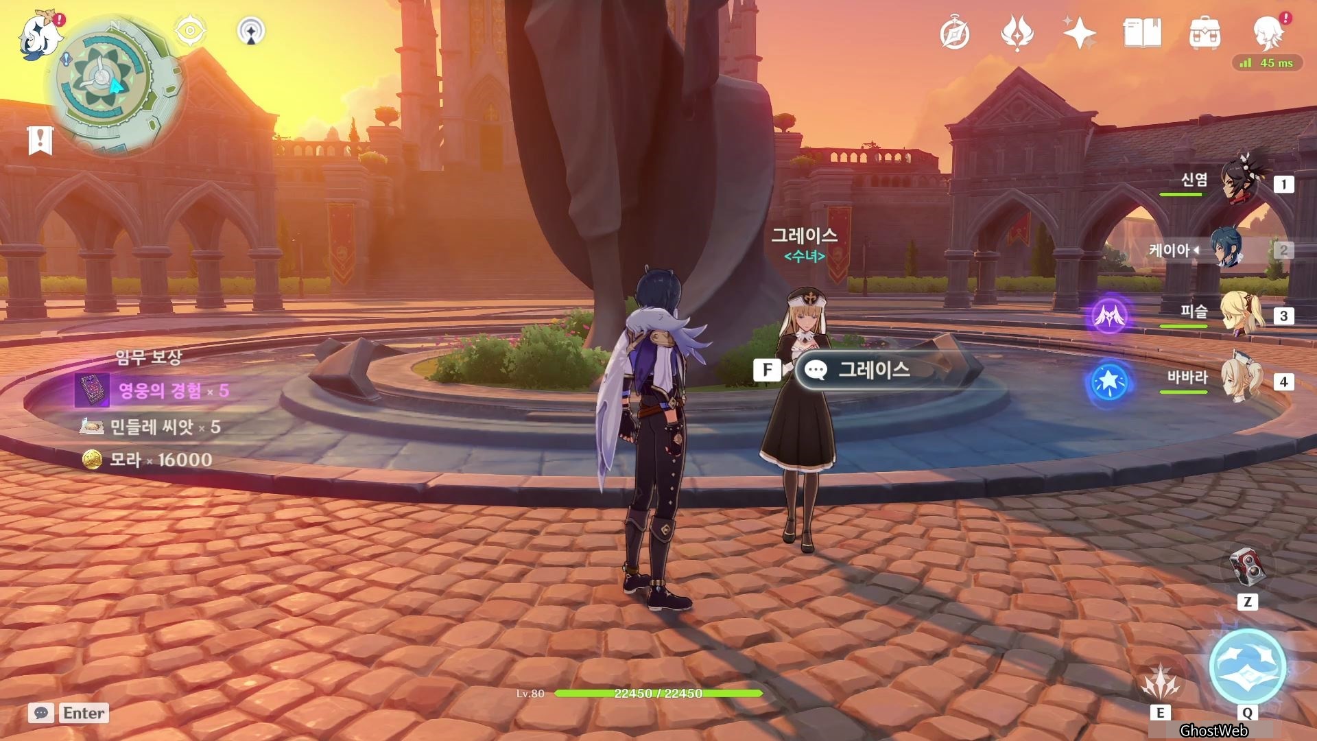 다시 그레이스와 대화를 통해 그레이스가 기도 후 바람 신의 신상을 등반하여 손바닥에서 민들레 씨앗을 흩뿌리기한 후 다시 그레이스와 대화를 끝으로 영웅의 경험 5개, 민들레 씨앗 5개, 16000 모라를 얻을 수 있어요.