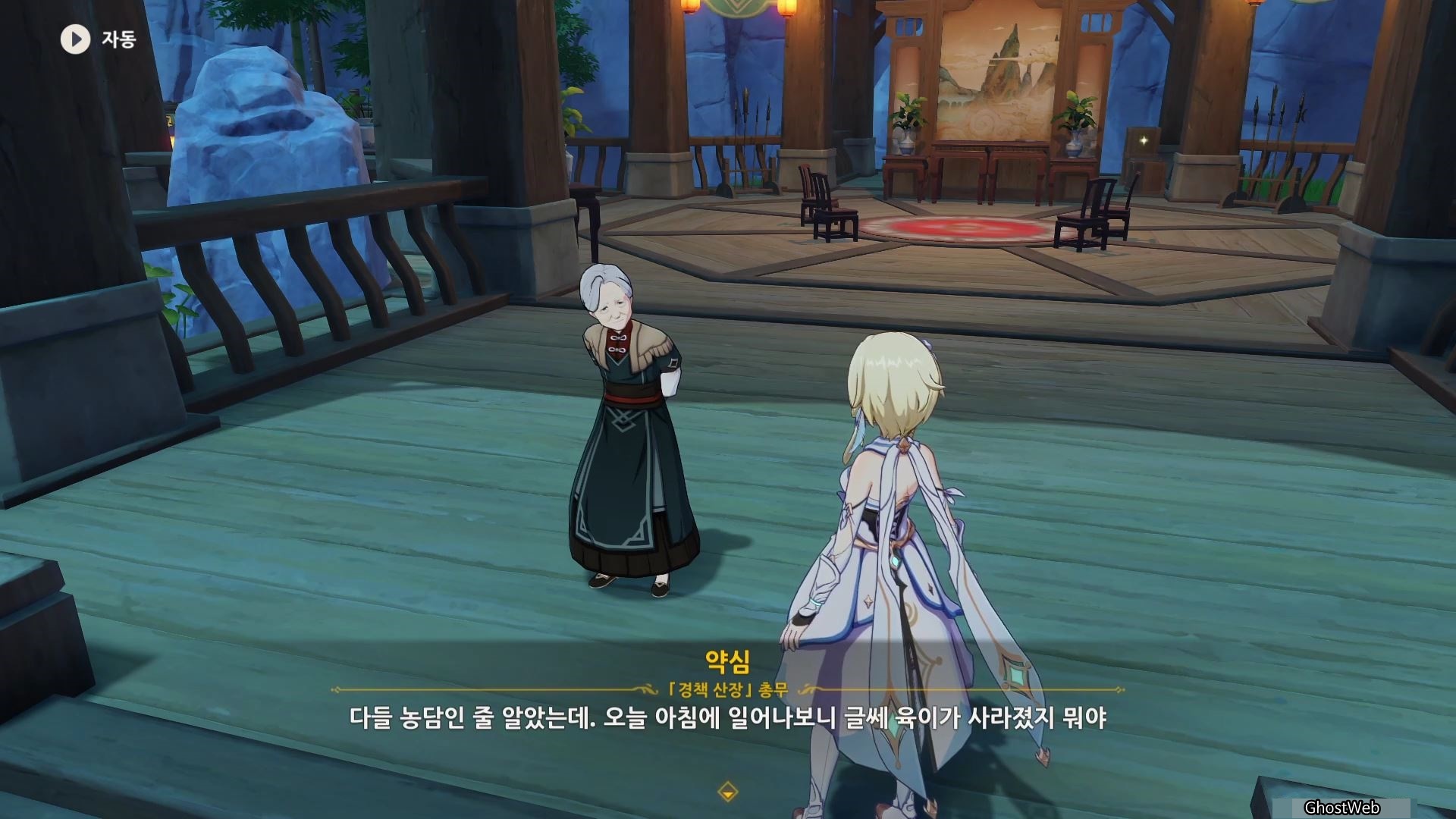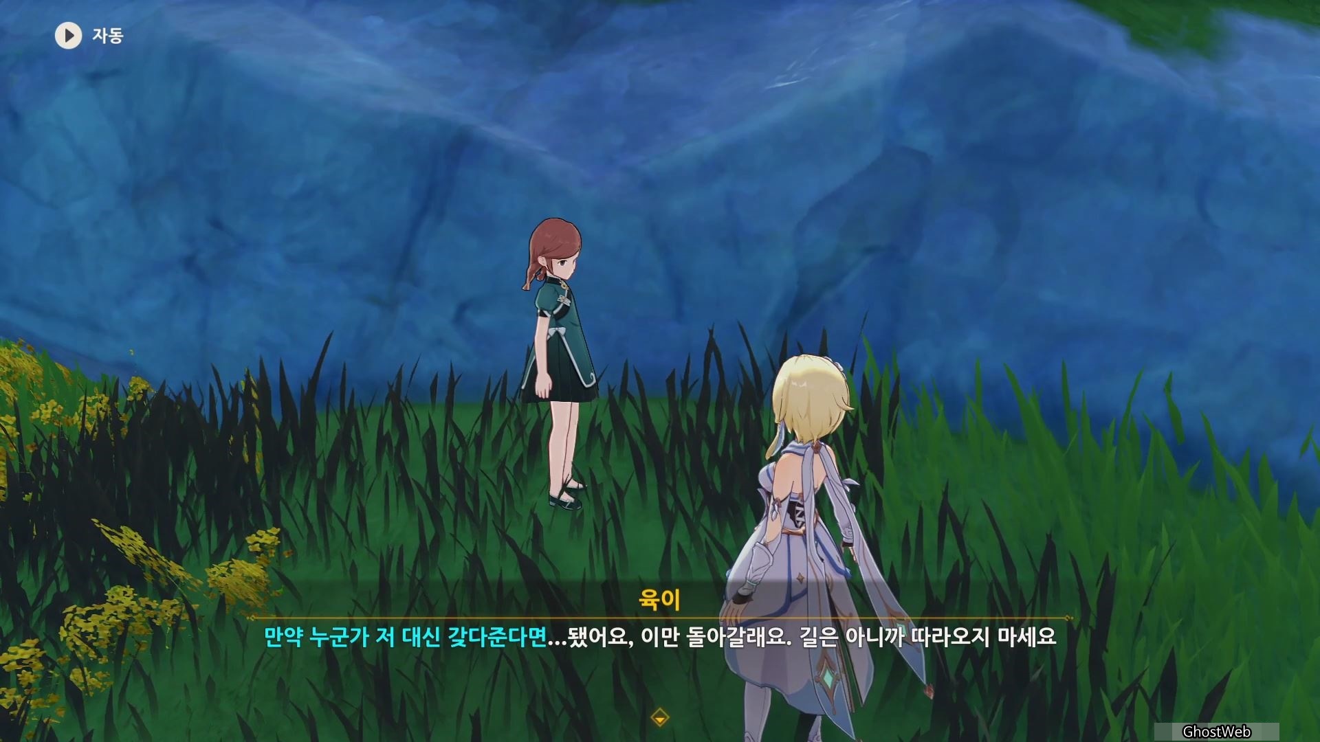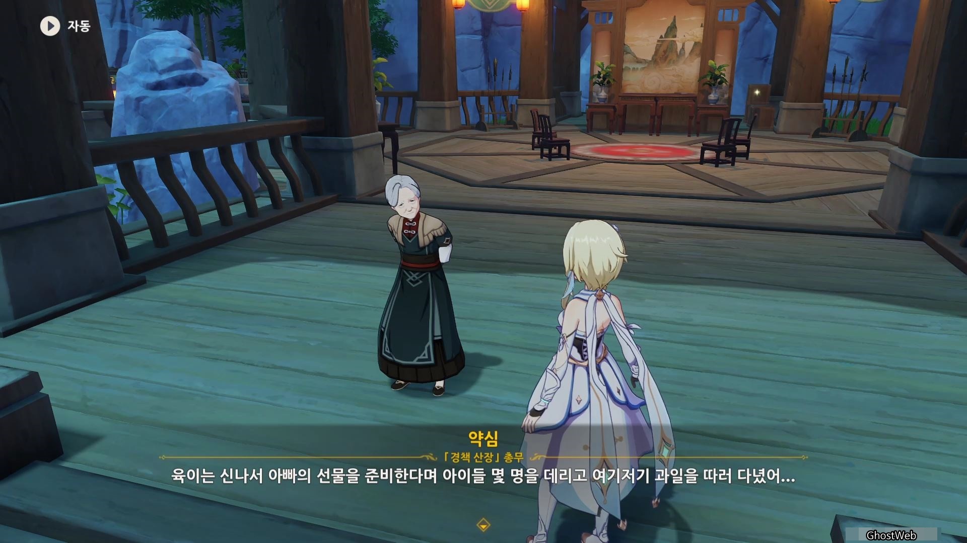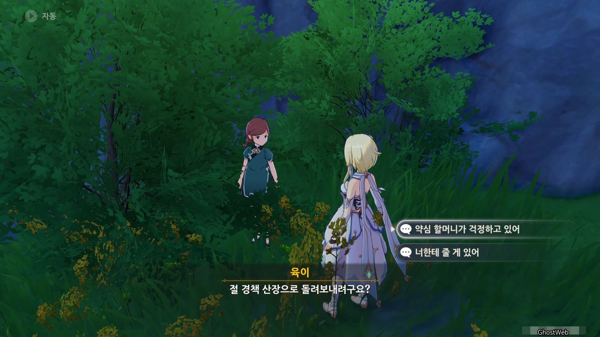 경책 산장 워프 포인트로 이동하여 워프 포인트 앞에 있는 건물 안에 경책 산장의 총무인 <약심>에게 말을 걸면 아빠가 근무해서 못 돌아온다는 말을 육이가 화가나서 리월항으로 간 거 같다며 여행자에게 육이를 찾아달라고 부탁해요.