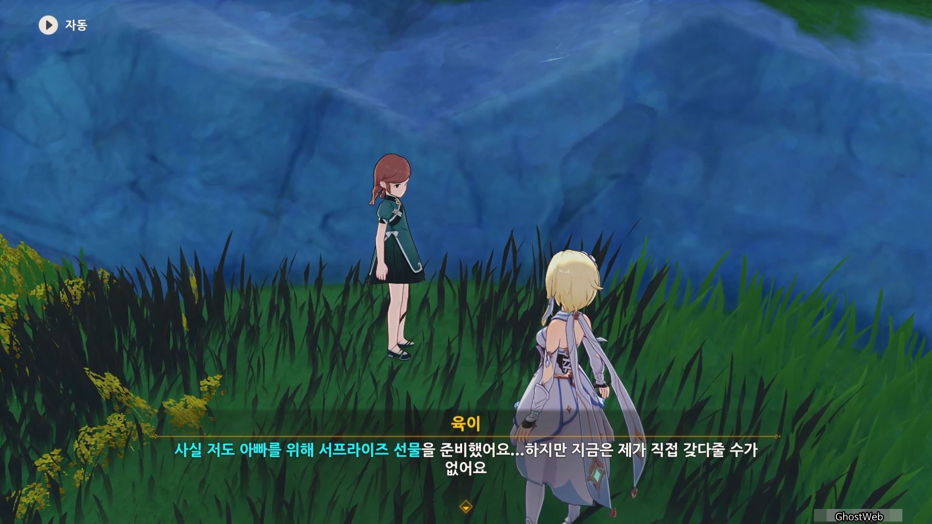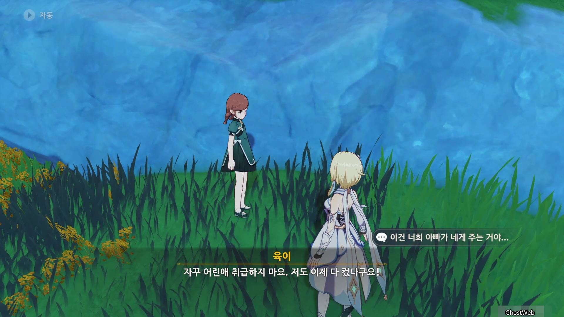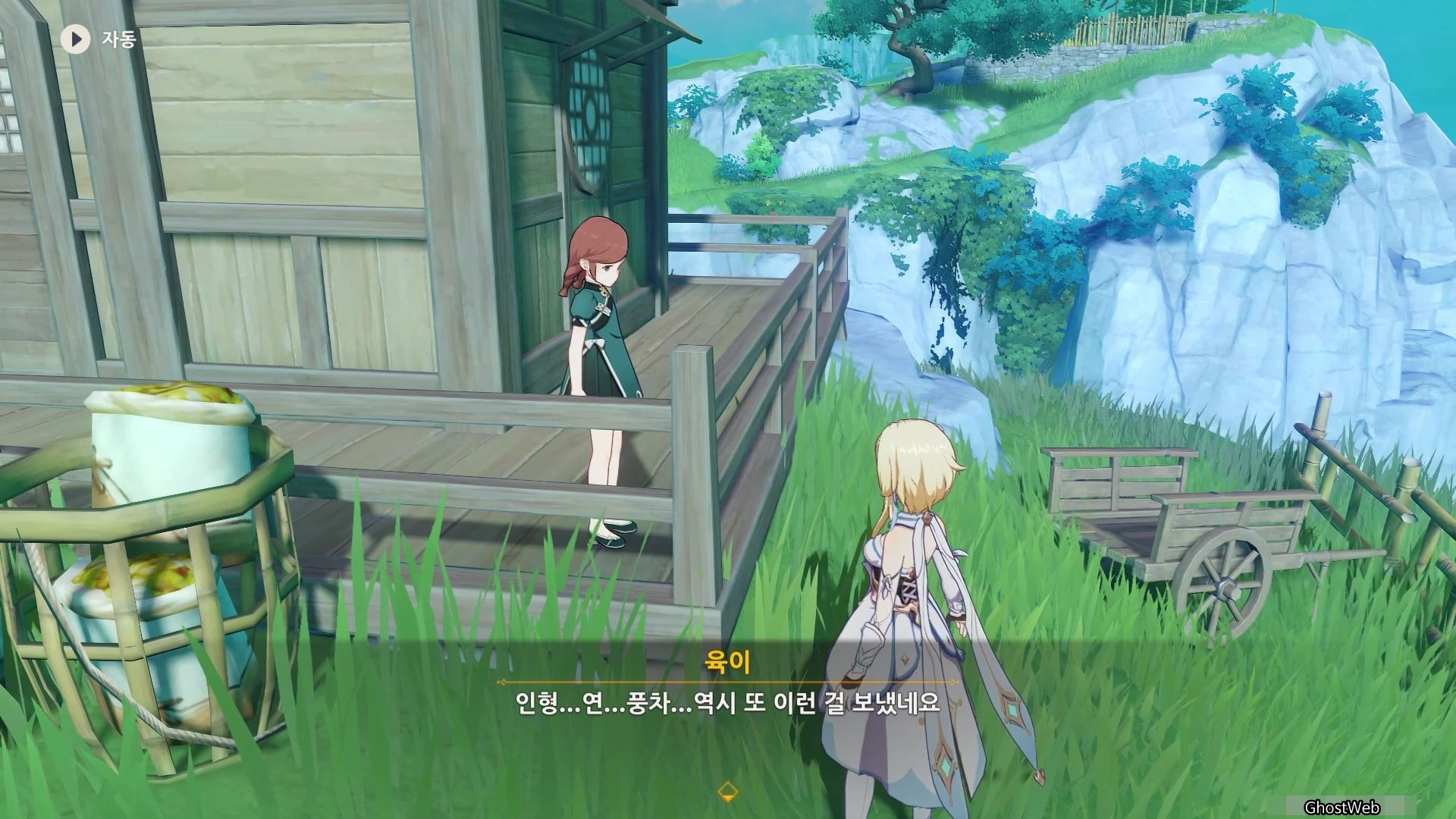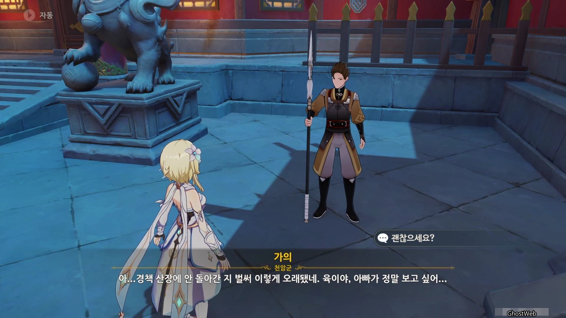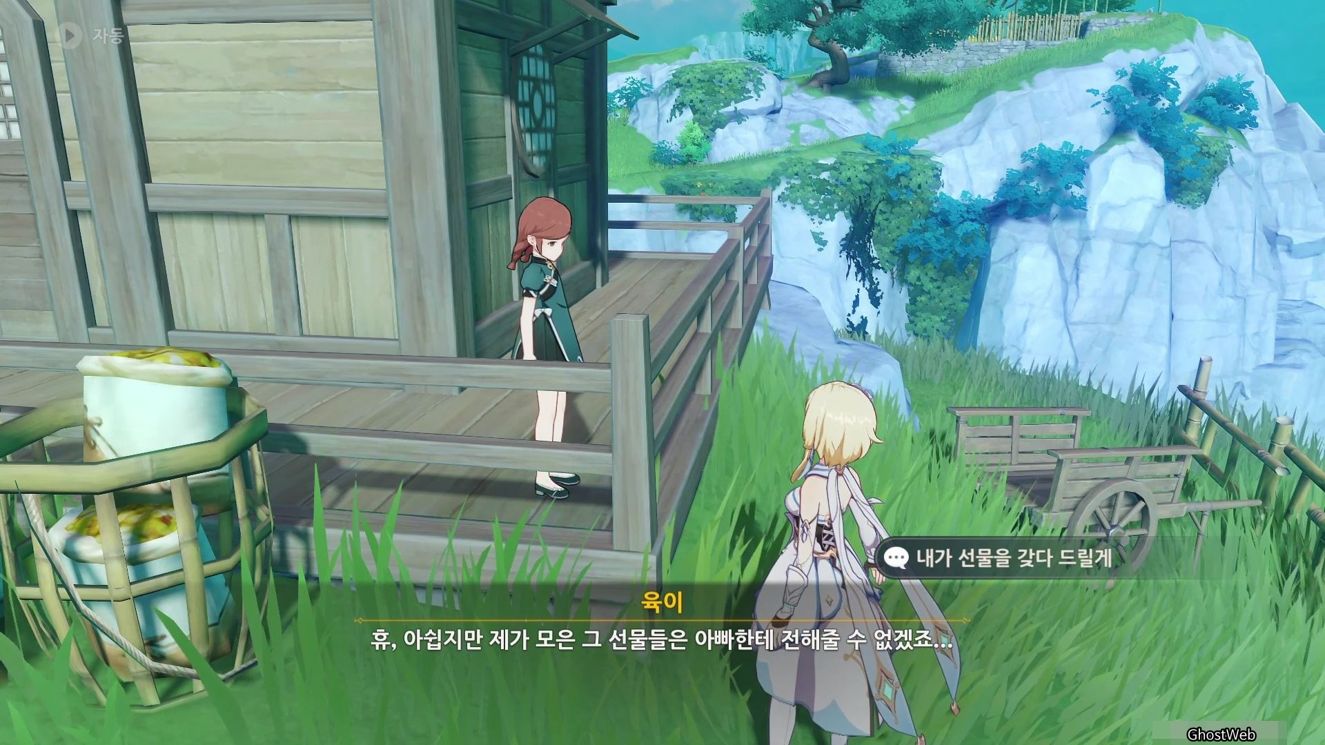 경책 산장 워프 포인트로 이동하여 워프 포인트 앞에 있는 건물 안에 경책 산장의 총무인 <약심>에게 말을 걸면 아빠가 근무해서 못 돌아온다는 말을 육이가 화가나서 리월항으로 간 거 같다며 여행자에게 육이를 찾아달라고 부탁해요.