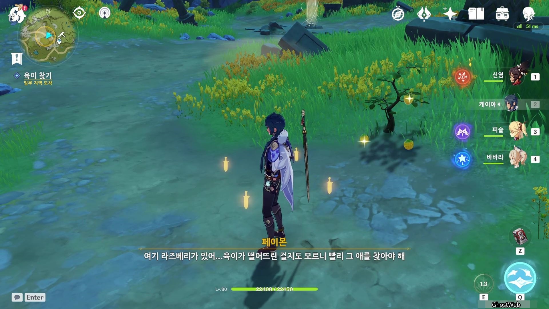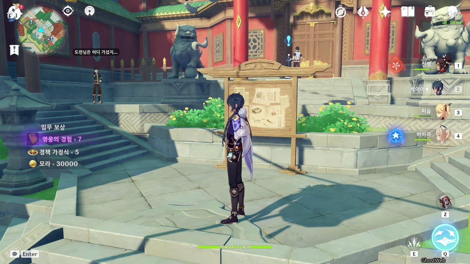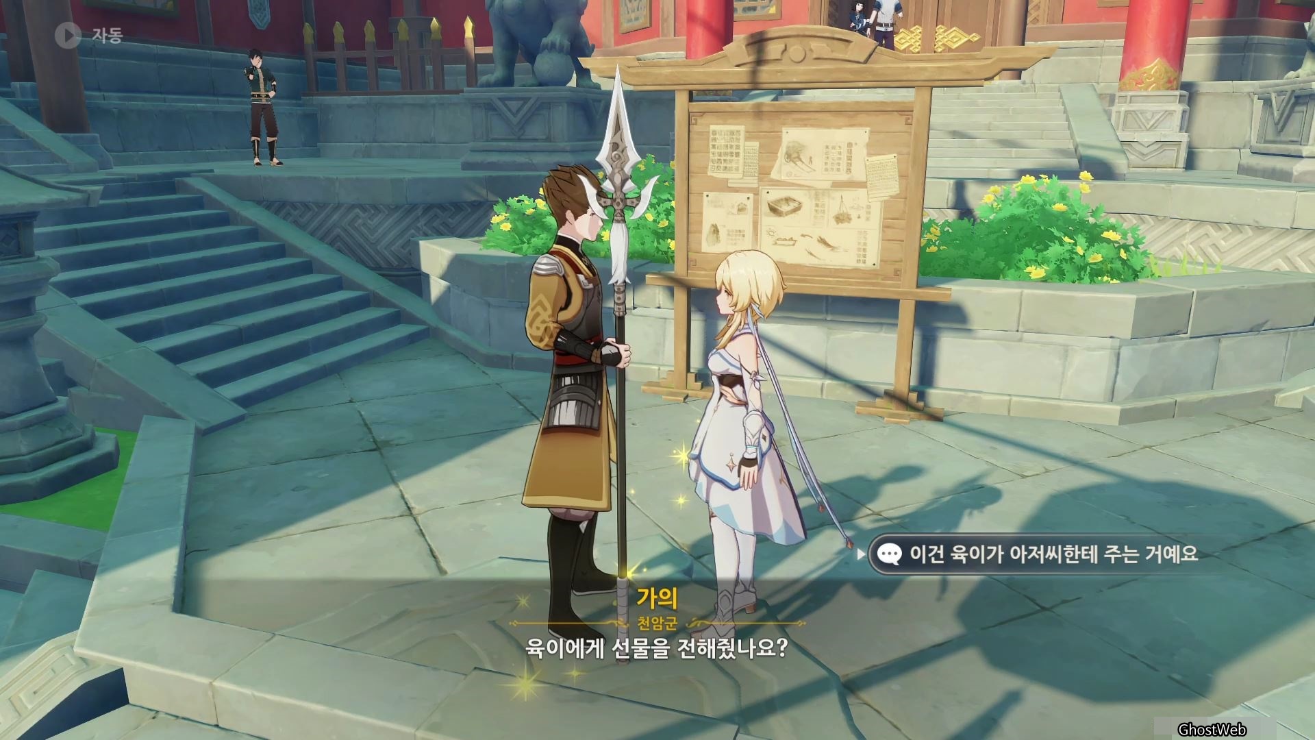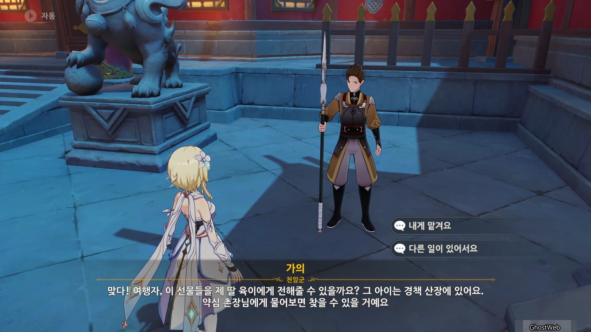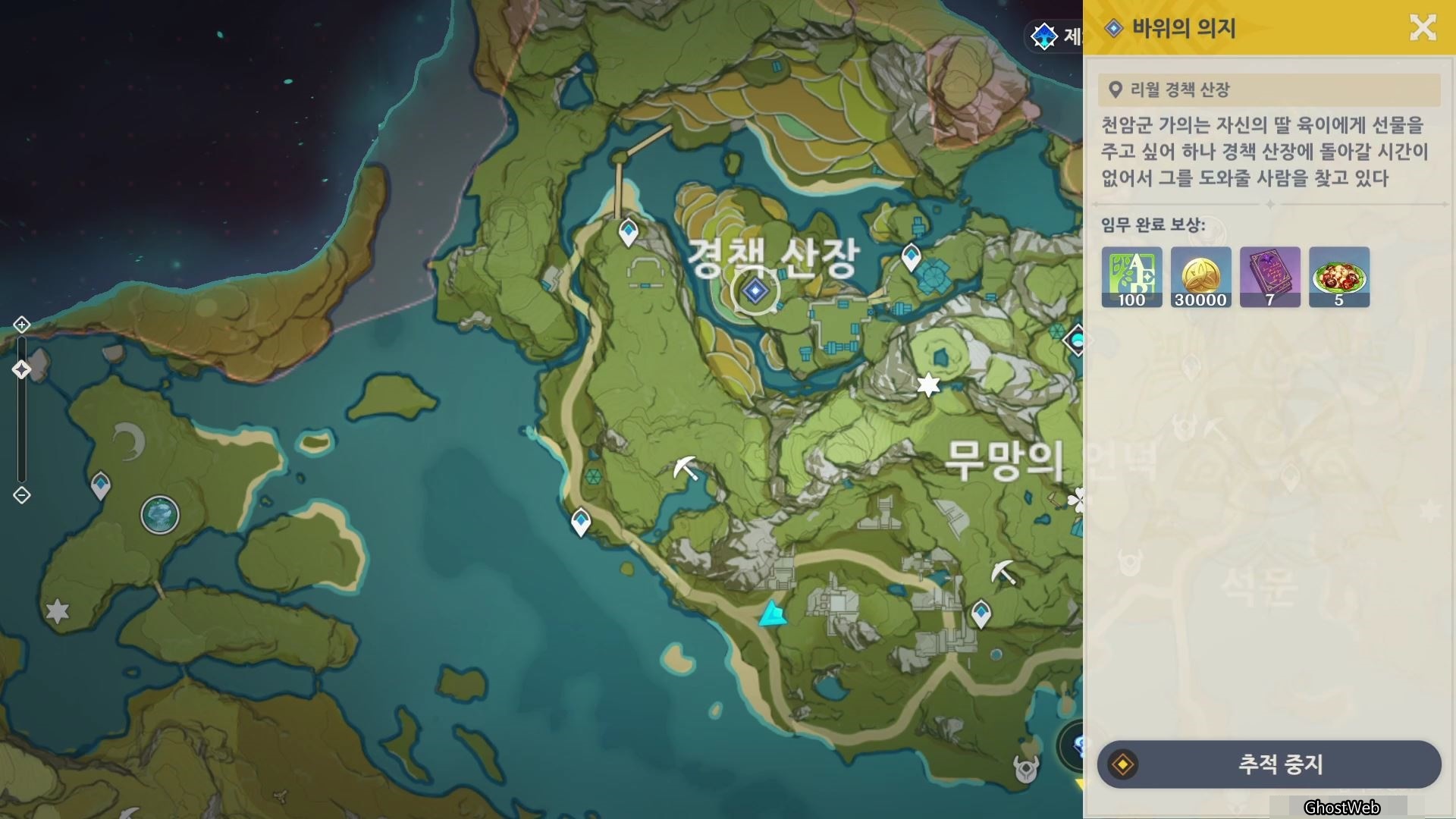 지도를 열고 다시 경책 산장으로 이동하여 육이에게 아빠에게 전달할 선물을 받고 다시 리월항으로 돌아와 총무부 앞에 있는 가의에게 선물을 전달하면 보상으로 영웅의 경험 7개, 경책 가정식 5개, 모라 30000를 얻을 수 있어요.