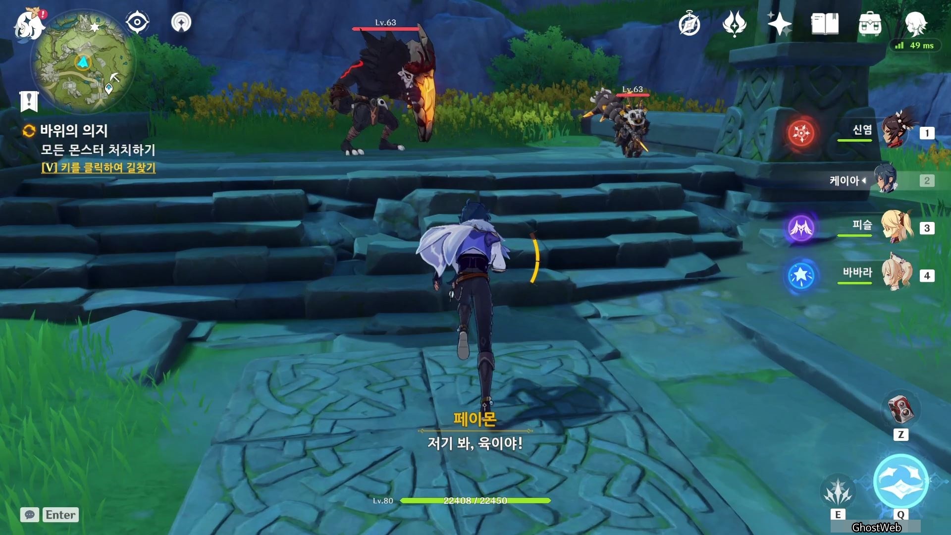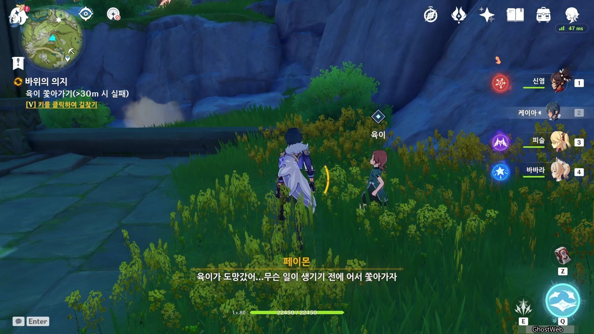 몬스터를 다 처치하고 육이와 대화를 하면 도망가는 육이를 쫓아가야 되는데 육이와 거리가 30m 넘게 멀어지면 임무에 실패하니 육이랑 나란히 걸어가 육이가 멈추는 곳 주변에 있는 몬스터를 모두 처치하세요.