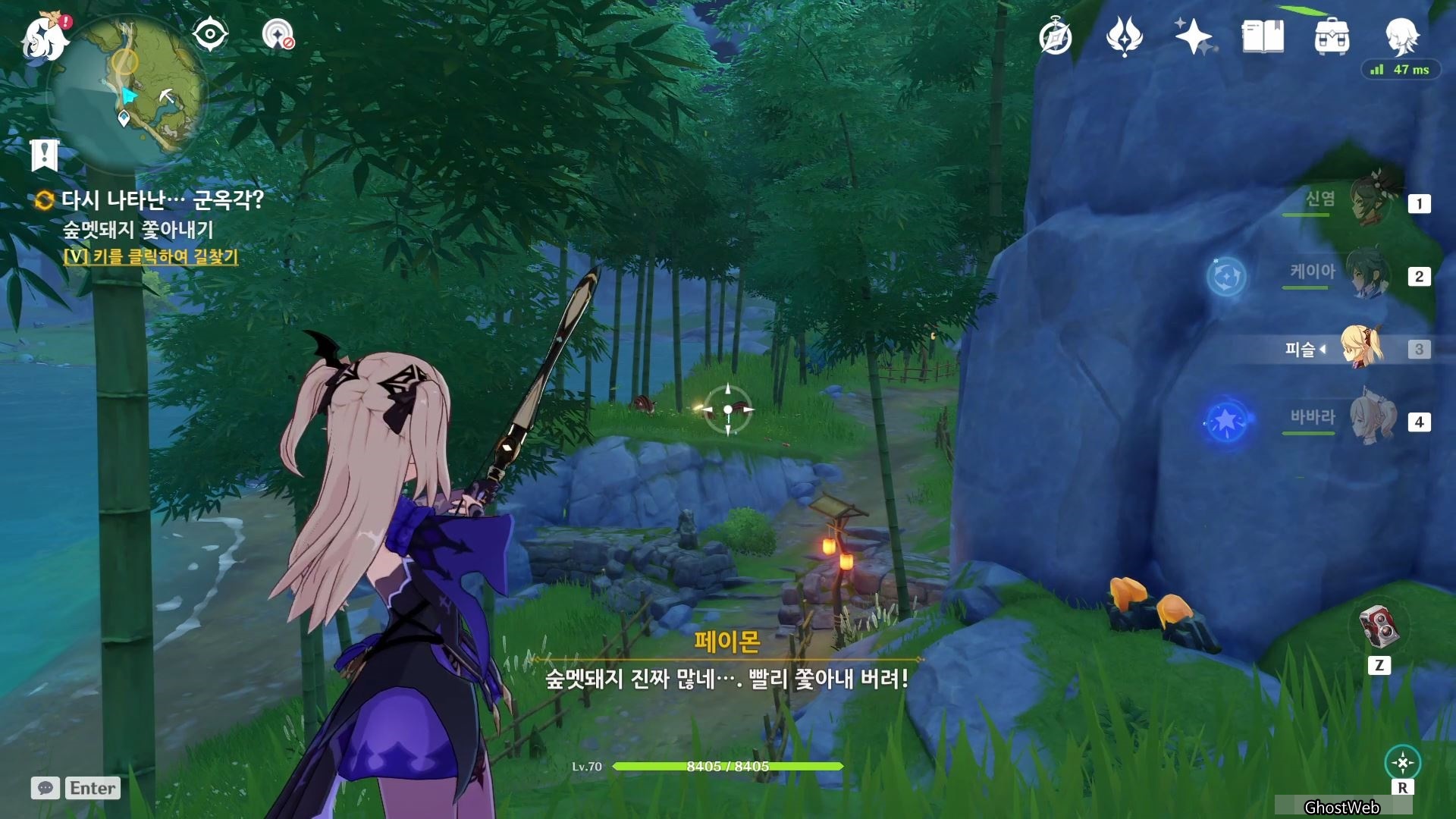 지도에 표시되는 곳으로 이동하여 멧돼지를 쫓아내고 다시 <노 어르신>과 대화하면 <대나무로 만든 장식품>을 얻고 이제 리월항에 있는 월해정에 있는 <백문>에게 주옥 광물과 장식품을 전달해주면 임무 보상으로 캐릭터 육성 소재인 황금의 가르침 2개, 근면의 가르침 2개, 번영의 가르침 2개, 50000모라를 얻을 수 있어요.