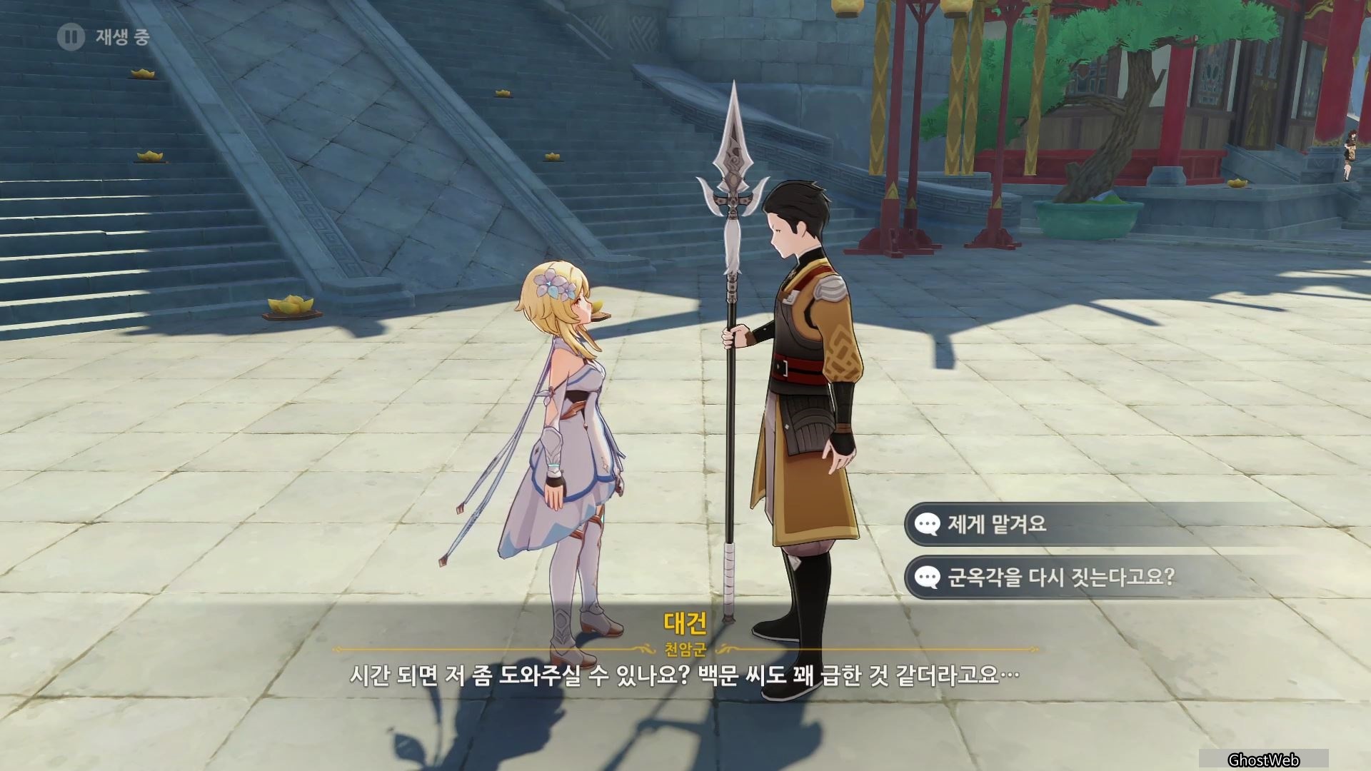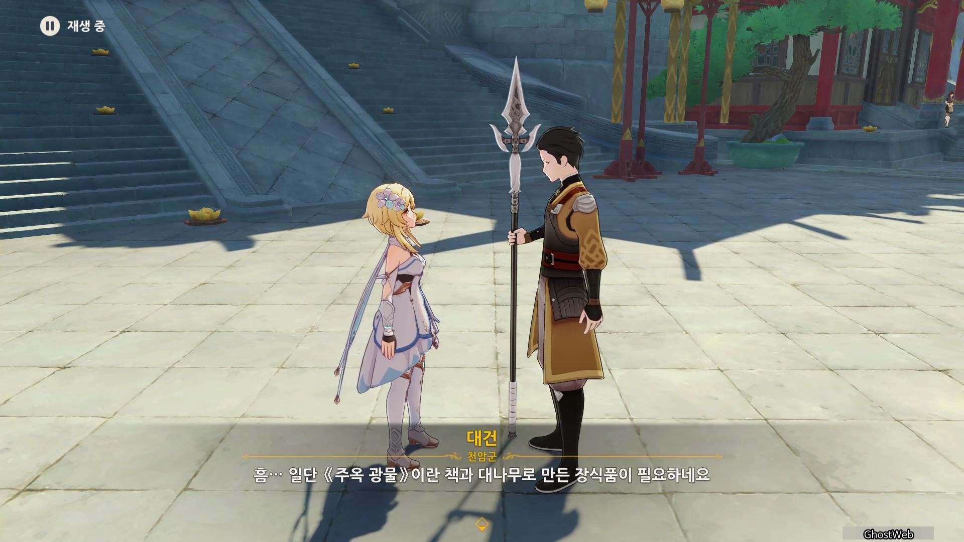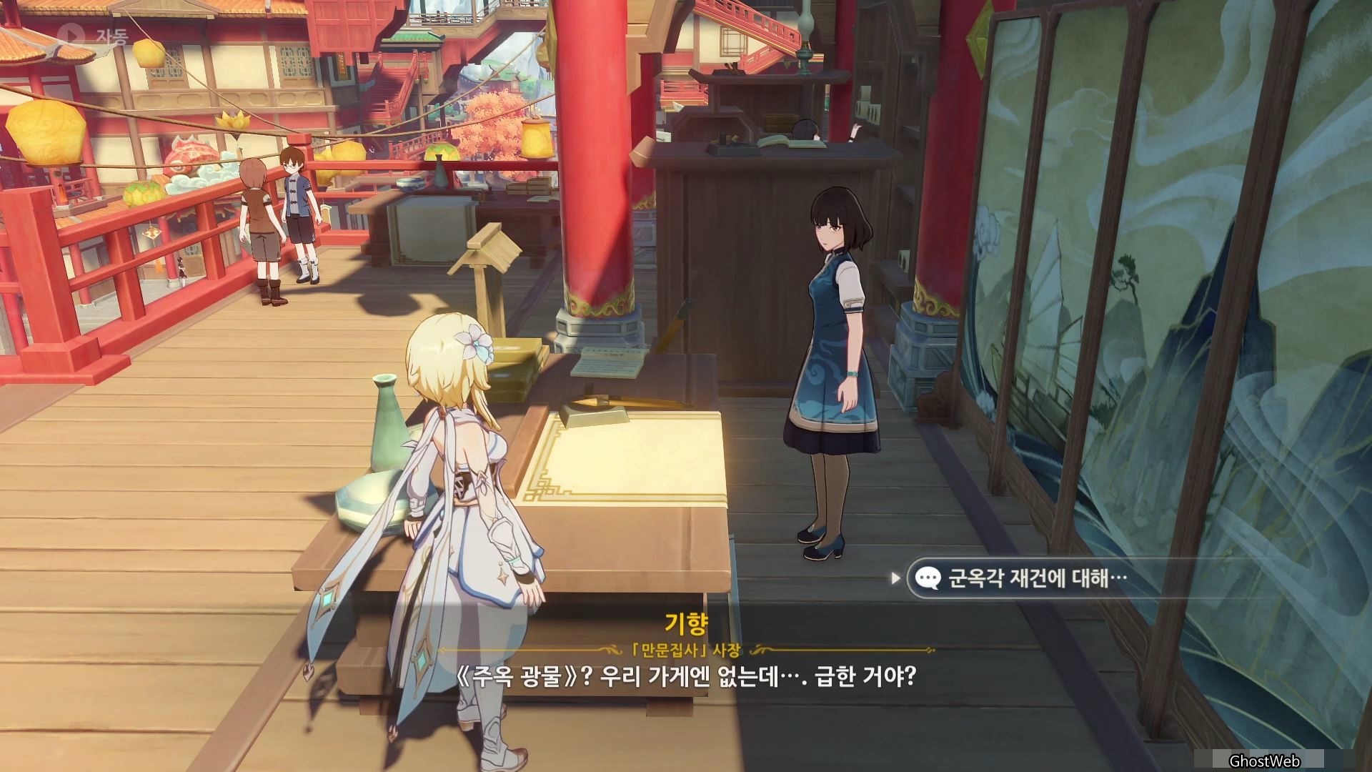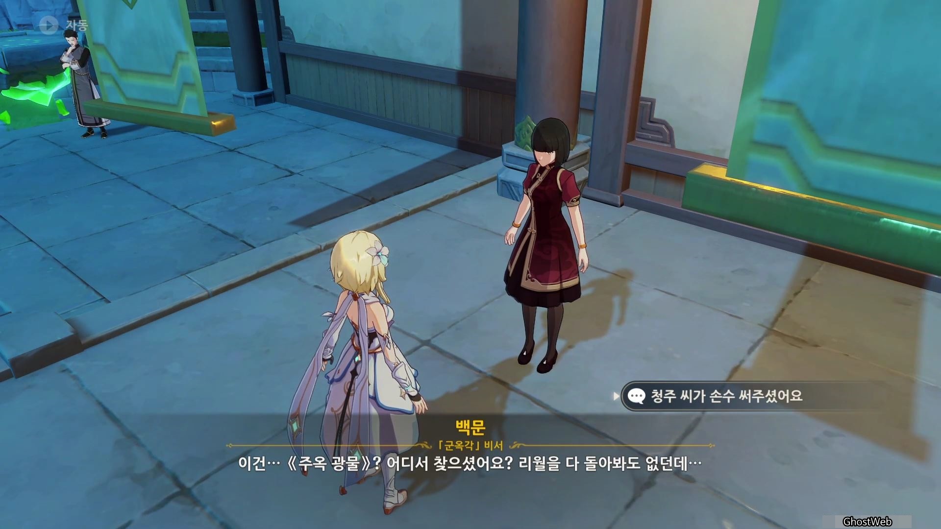 대화를 통해 <백문>이 군옥각 재건한다고 바쁜 자신 대신 <주옥 광물(책 - 기향)>, <대나무로 만든 장식품 (범목당 노 어른신)>을 구해달라고 해요.