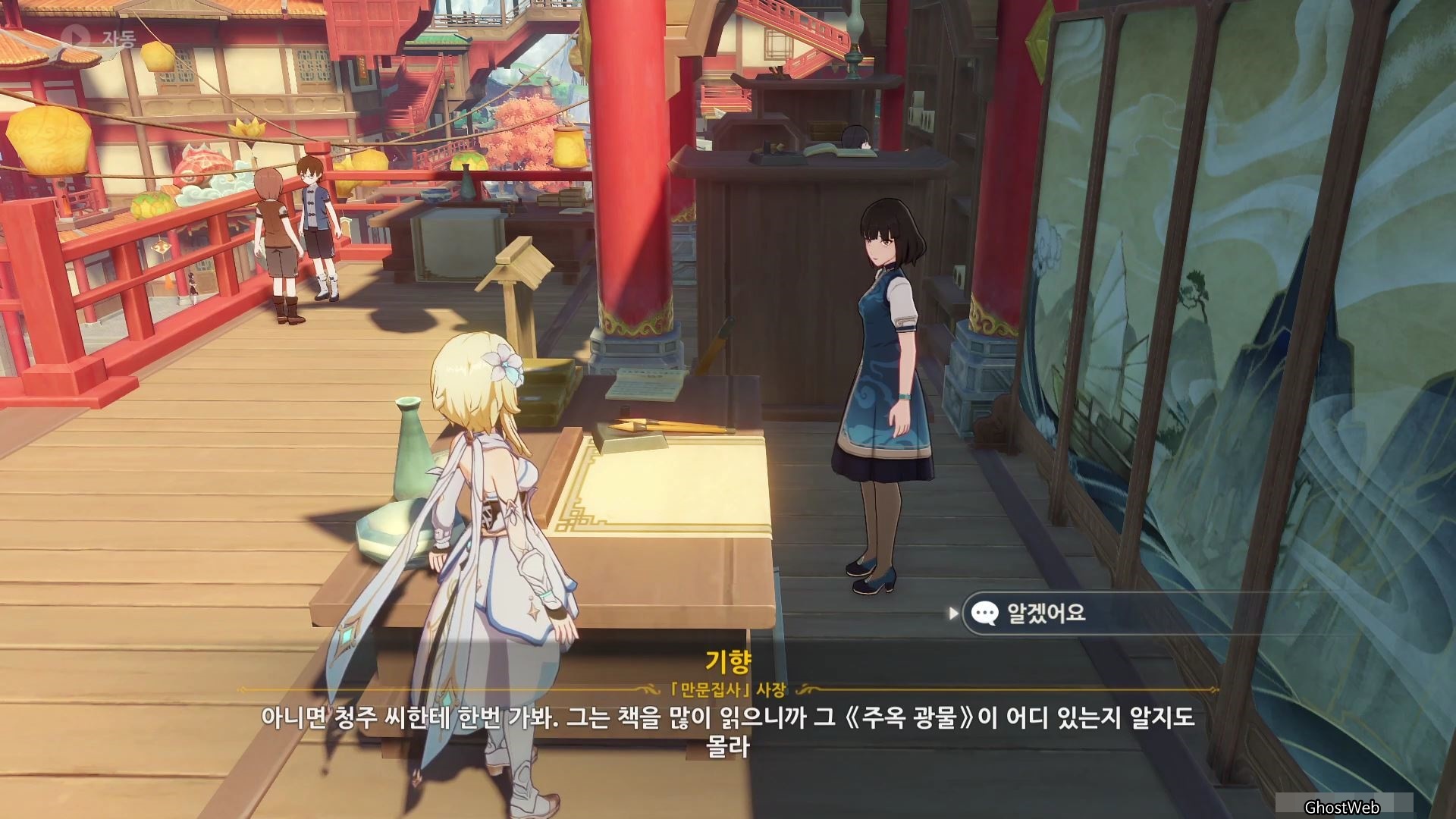 리월항의 첫 번째 워프 포인트로 이동하여 맞은편에 있는 건물 옥상에 있는 만문집사의 기향과 대화를 하면 주옥 광물이 가게에 없다며 <망서 객잔>에 있는 <청주>에게 가보라고 해요.