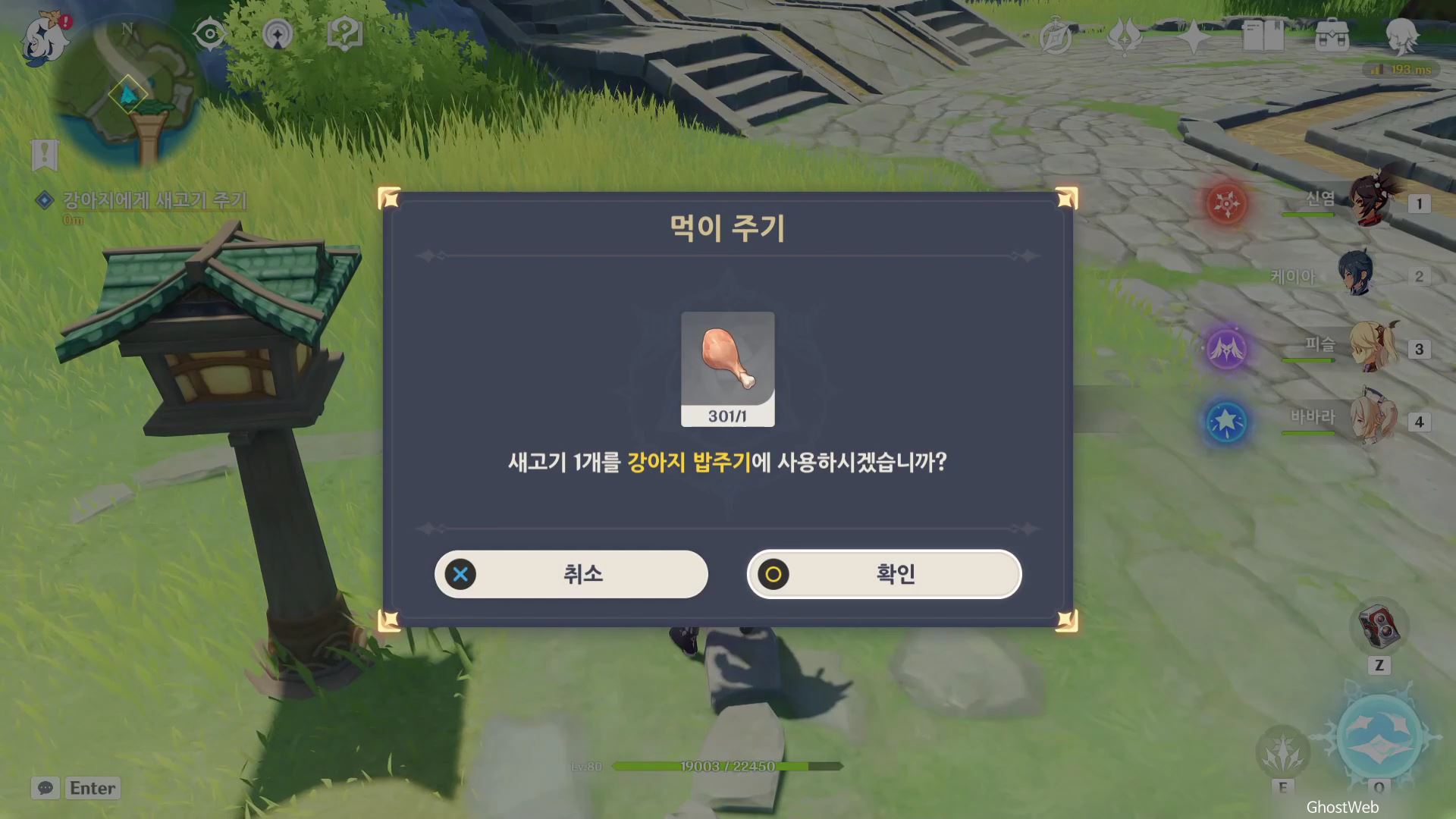 다시 창아가 있던 곳으로 돌아가 밥을 줬다고 알려주고 임무 보상으로 영웅의 경험 8개, 생선 살코기 10개, 새고기 10개, 짐승고기 10개를 얻을 수 있어요.