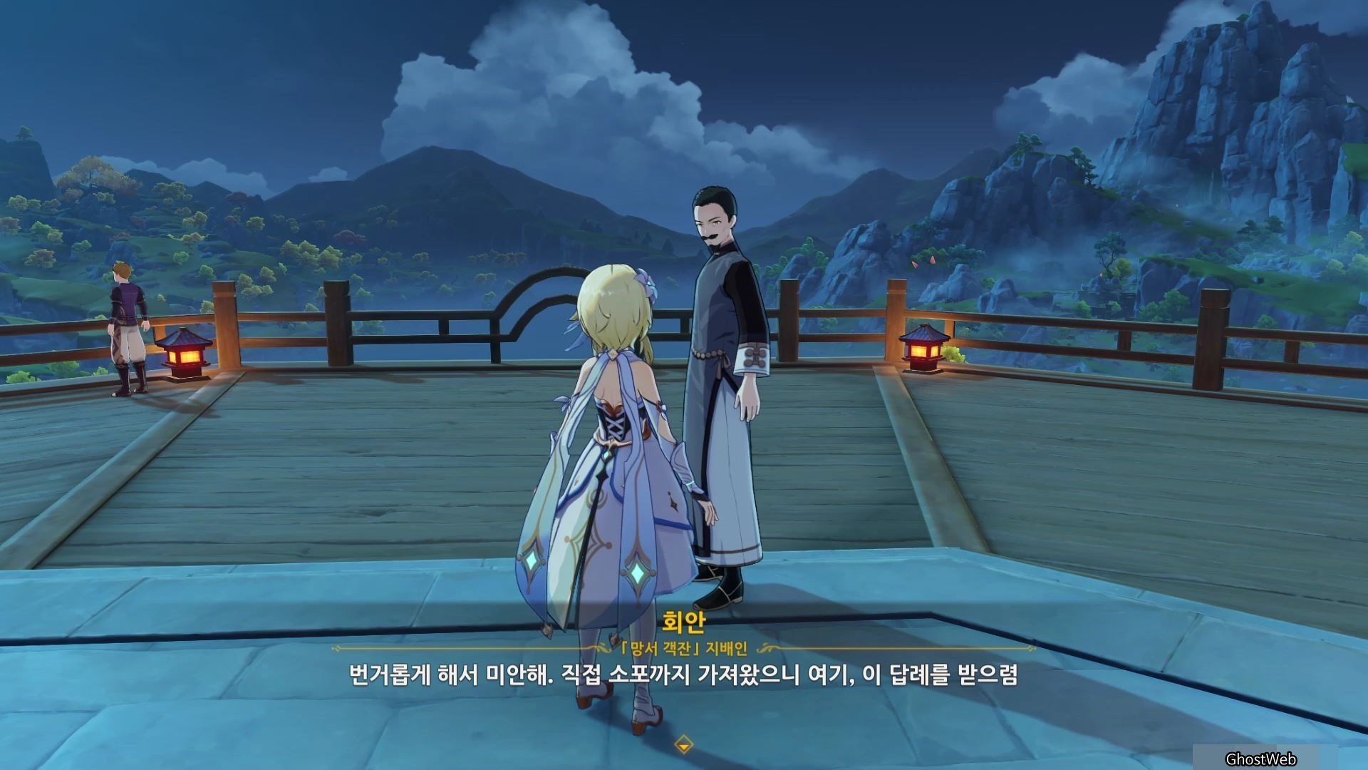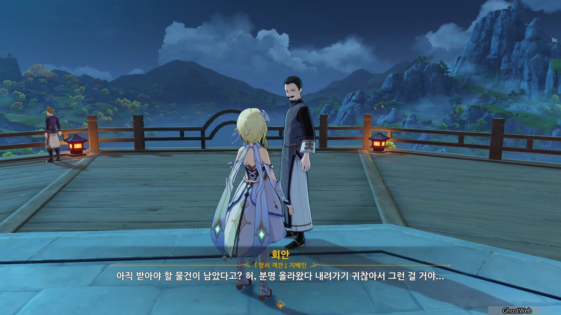 객잔 위로 올라가 망서 객잔의 지배인인 <회안>과 대화를 하면 고맙다면 원석 20개, 모라 4000을 답례로 받을 수 있어요.