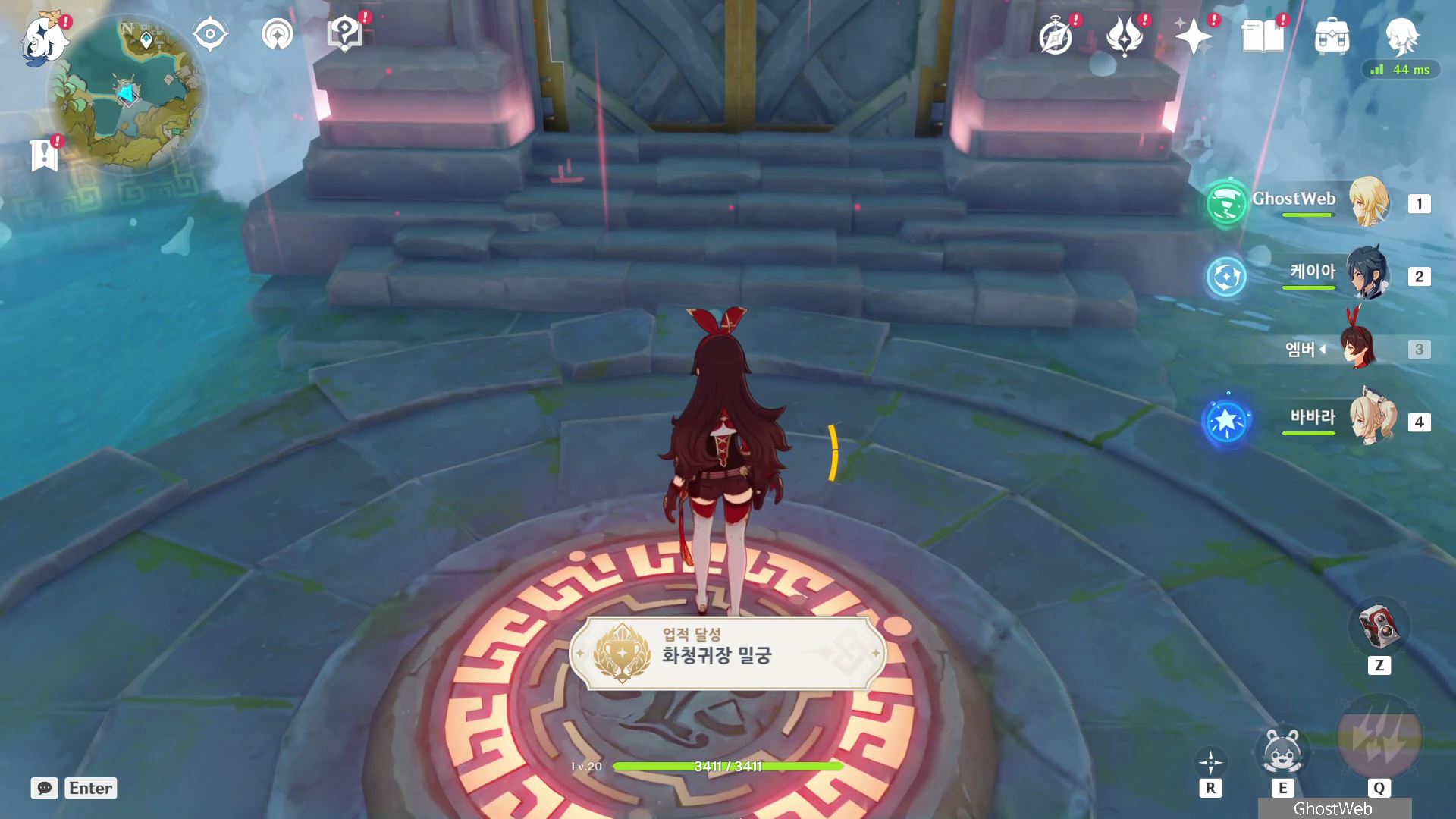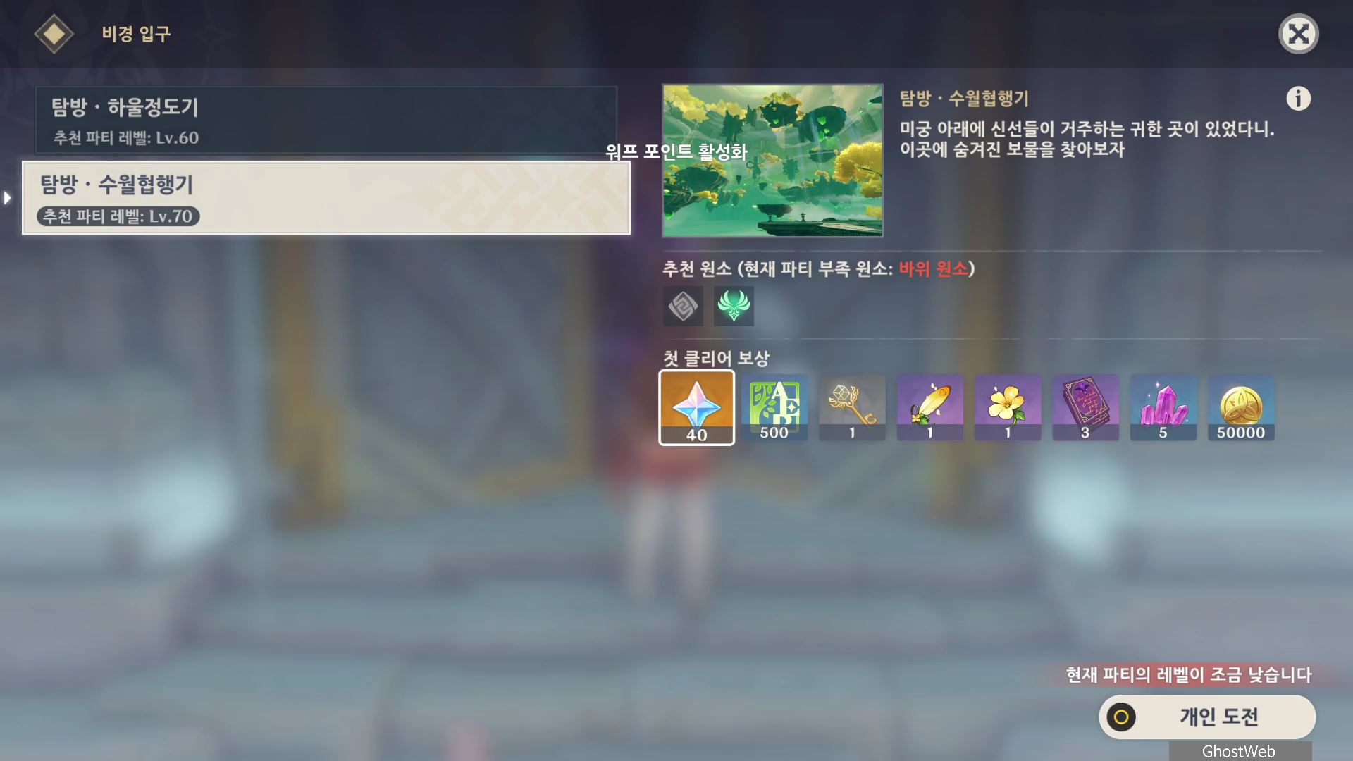 결계가 깨진 아래로 내려가 발판을 발고 있으면 윈드 필드가 생기면 화청귀장 밀궁에 입장하여 포인트를 찍으시고 밀궁 탐험을 완료하면 리월 지령의 감실 열쇠를 얻을 수 있어요.