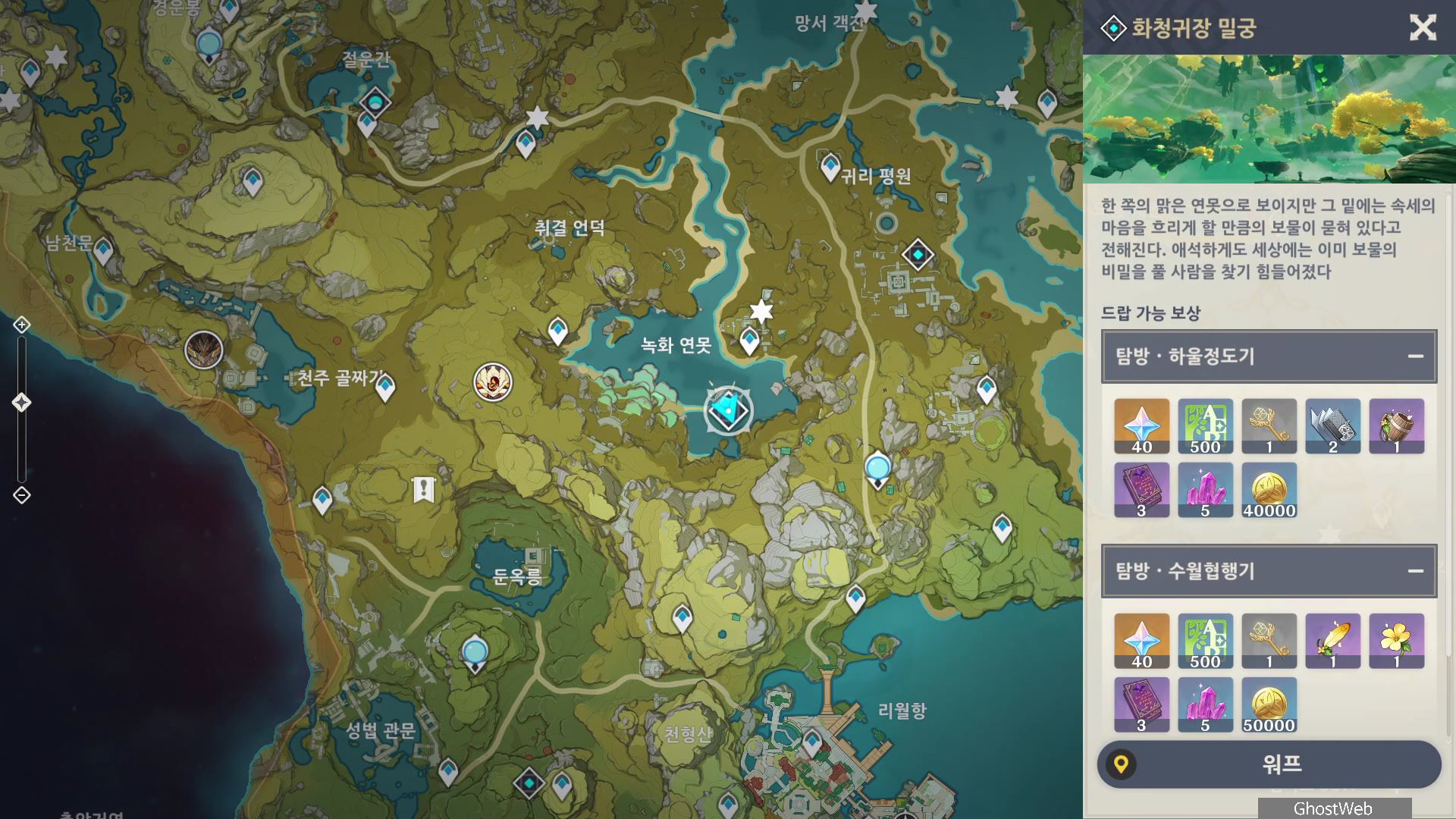 이번에는 녹화 연못에 있는 화청귀장 밀궁을 활성화 하는 방법에 대해서 알아보도록 할게요.