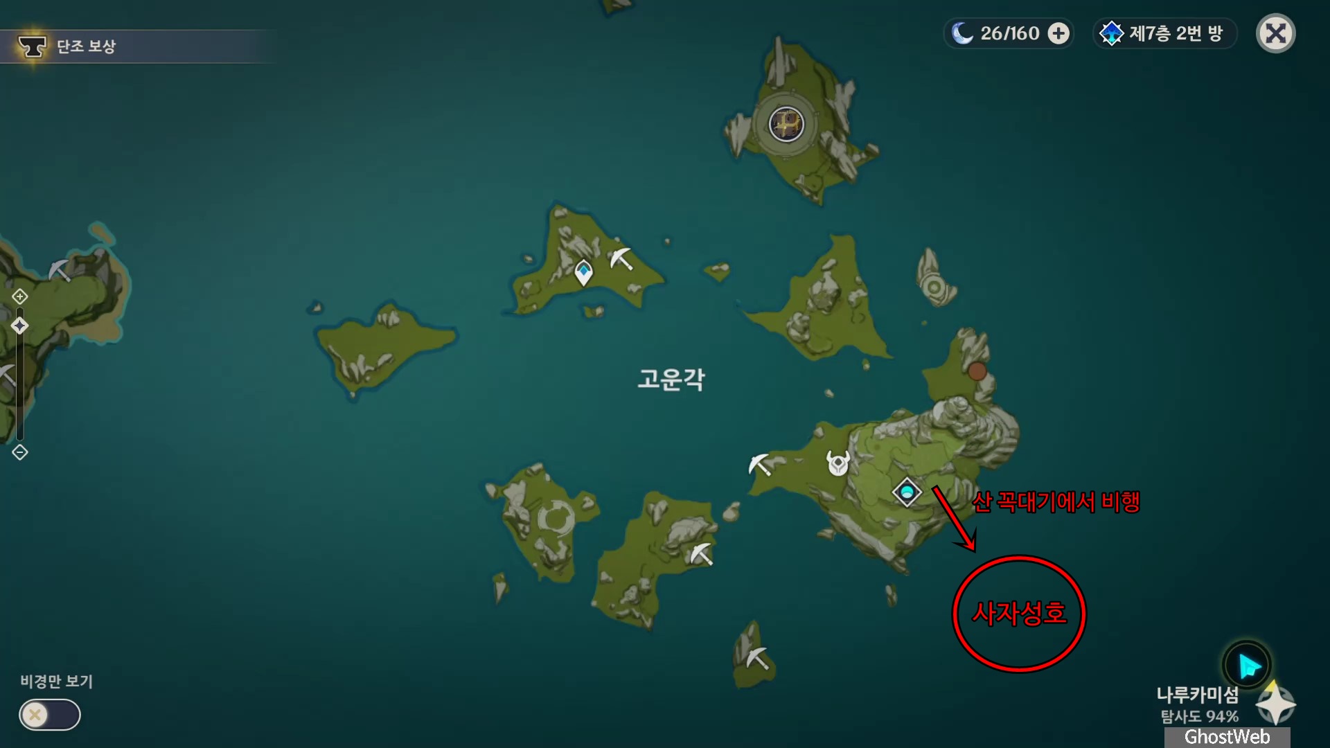 고운각(남동쪽 방향 - 하늘이 찌르는 땅 비경 근처)에서 남동쪽 바다를 바라보면 멀리 떨어진 배가 한 척 보이는데, 고운각에 있는 높은 산(하늘이 찌르는 땅 비경 위)에 올라가 비행을 하여 북두의 배인 <사조성호>에 갈 수 있어요.