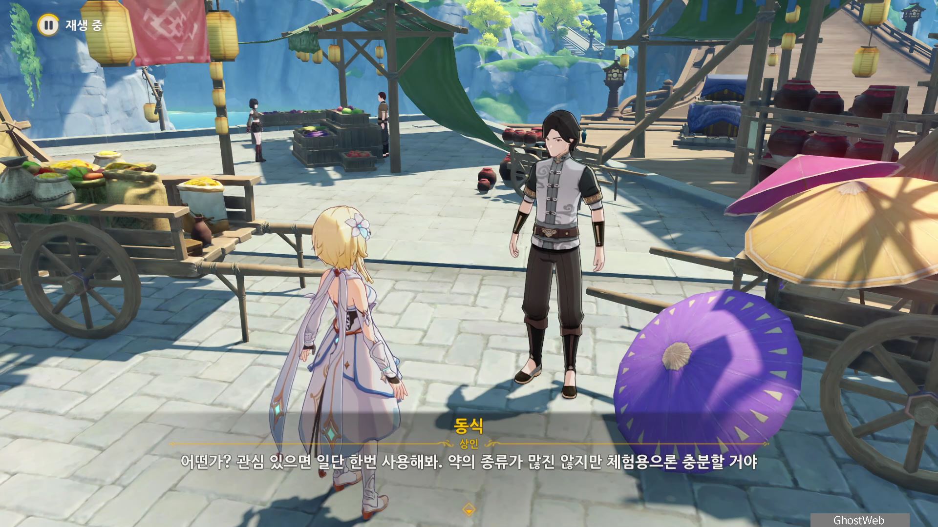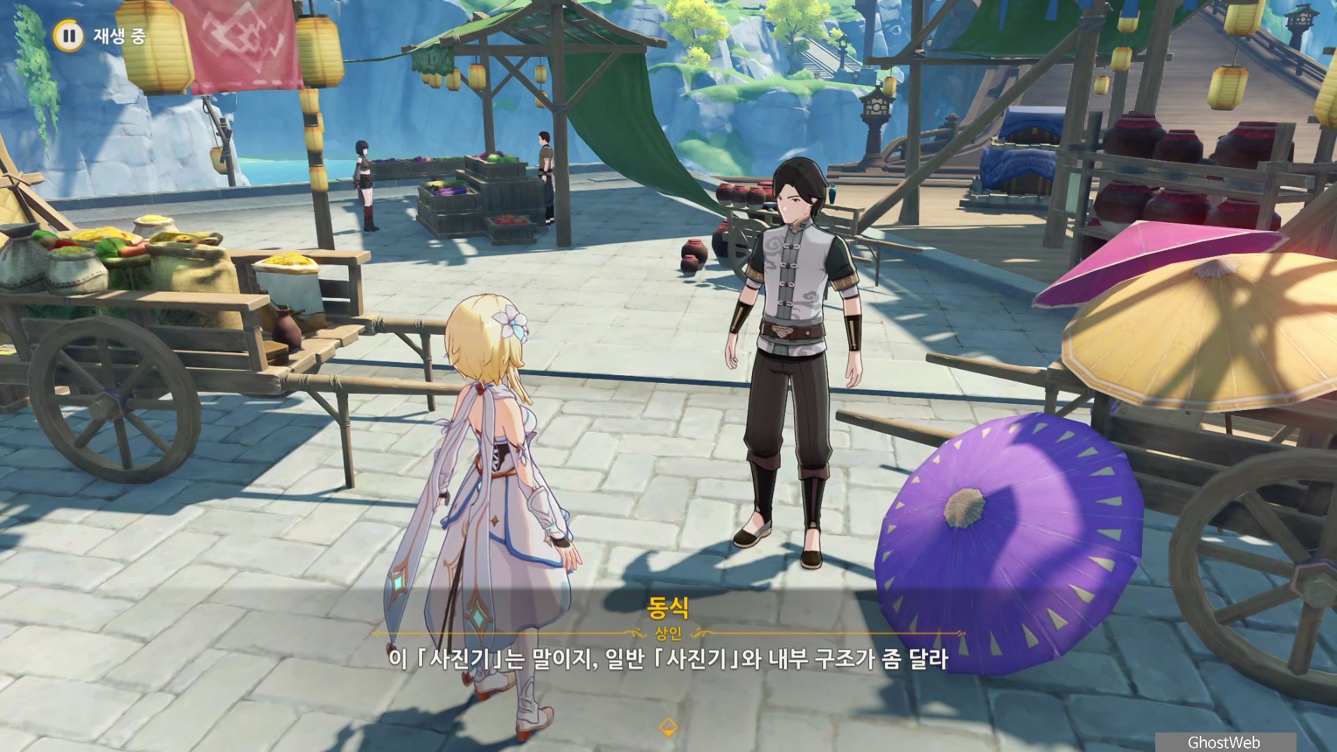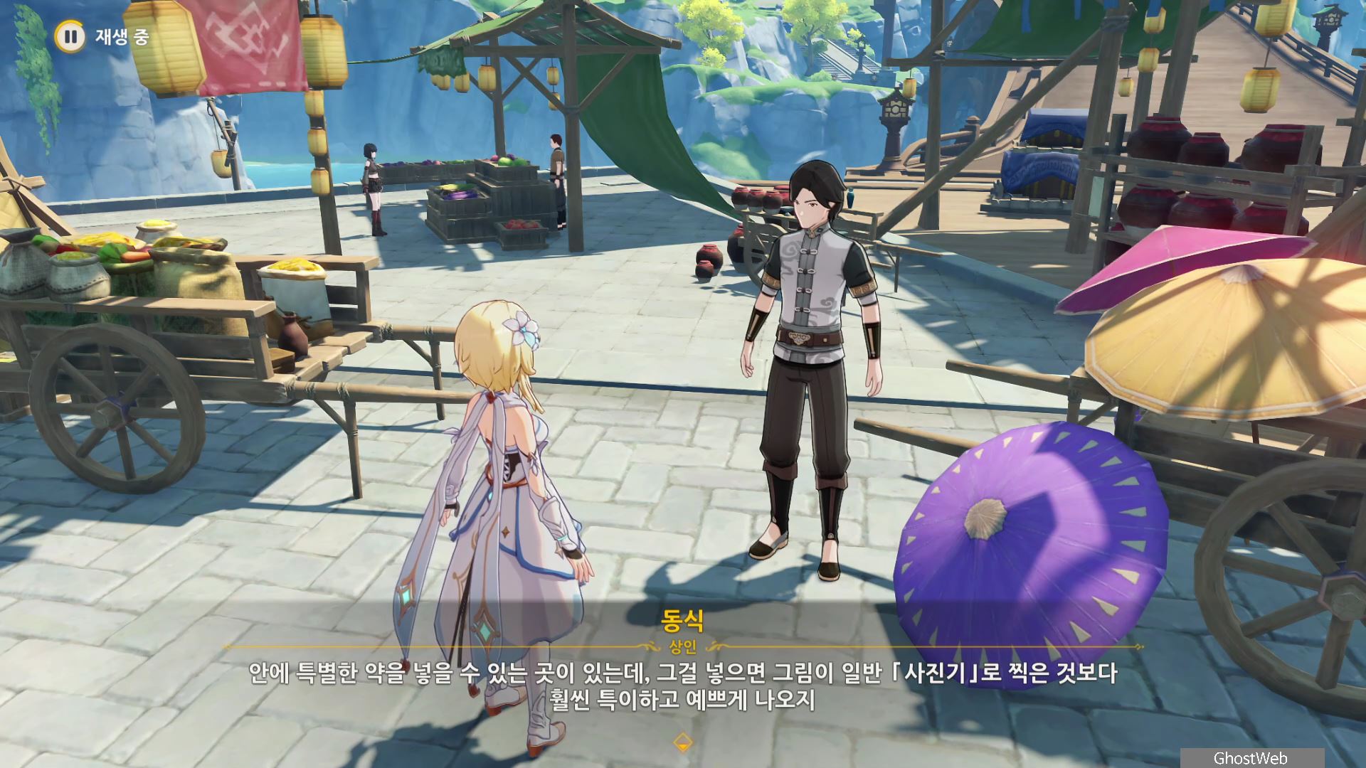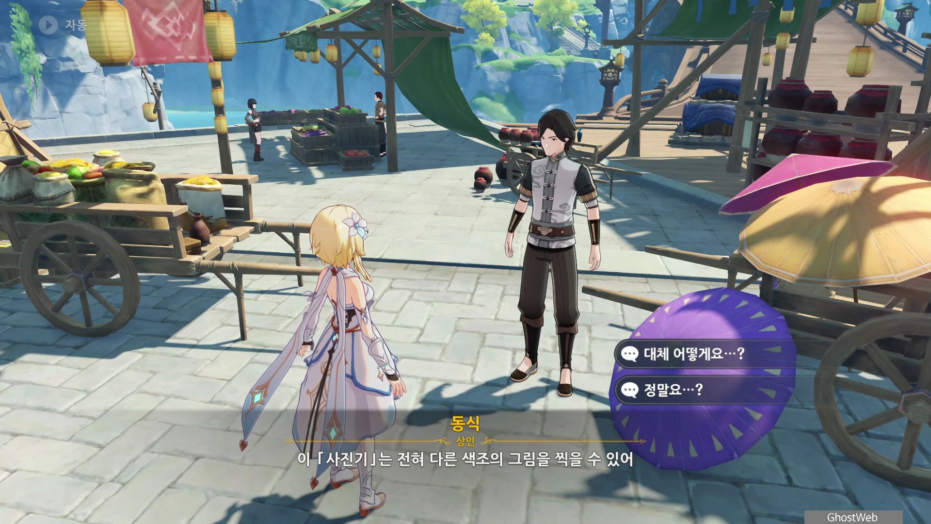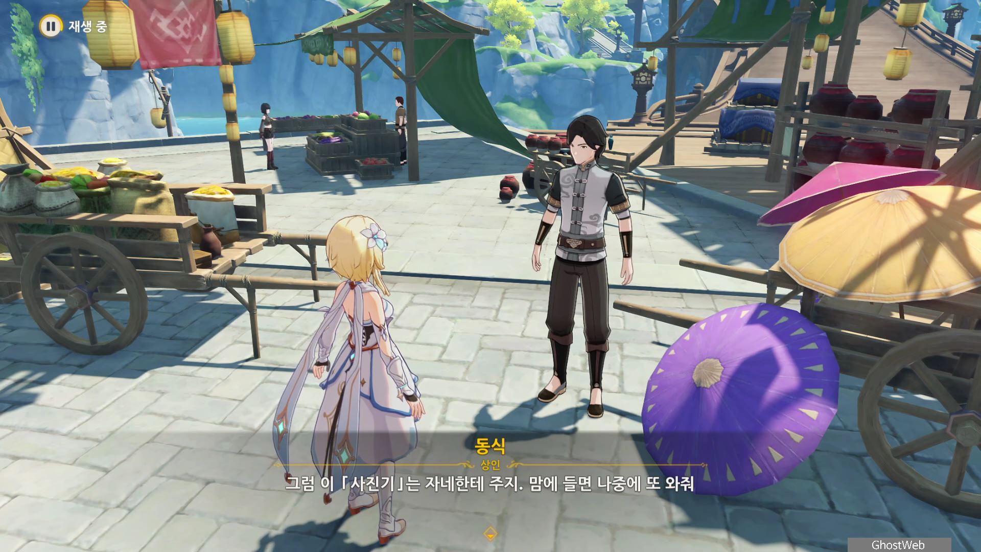 리월항 입구 쪽 워프 포인트 아래 부두에 있는 상인 <동식>에게 대화를 하면 여행자에게 사진기에게 관심이 있냐며 폰타인에서 온 최신기술의 사진기라며 안에 특별한 약을 넣으면 일반 사진기로 찍은 것보다 훨씬 특이하고 예쁘게 나온다며 사진기를 여행자에게 줘요.