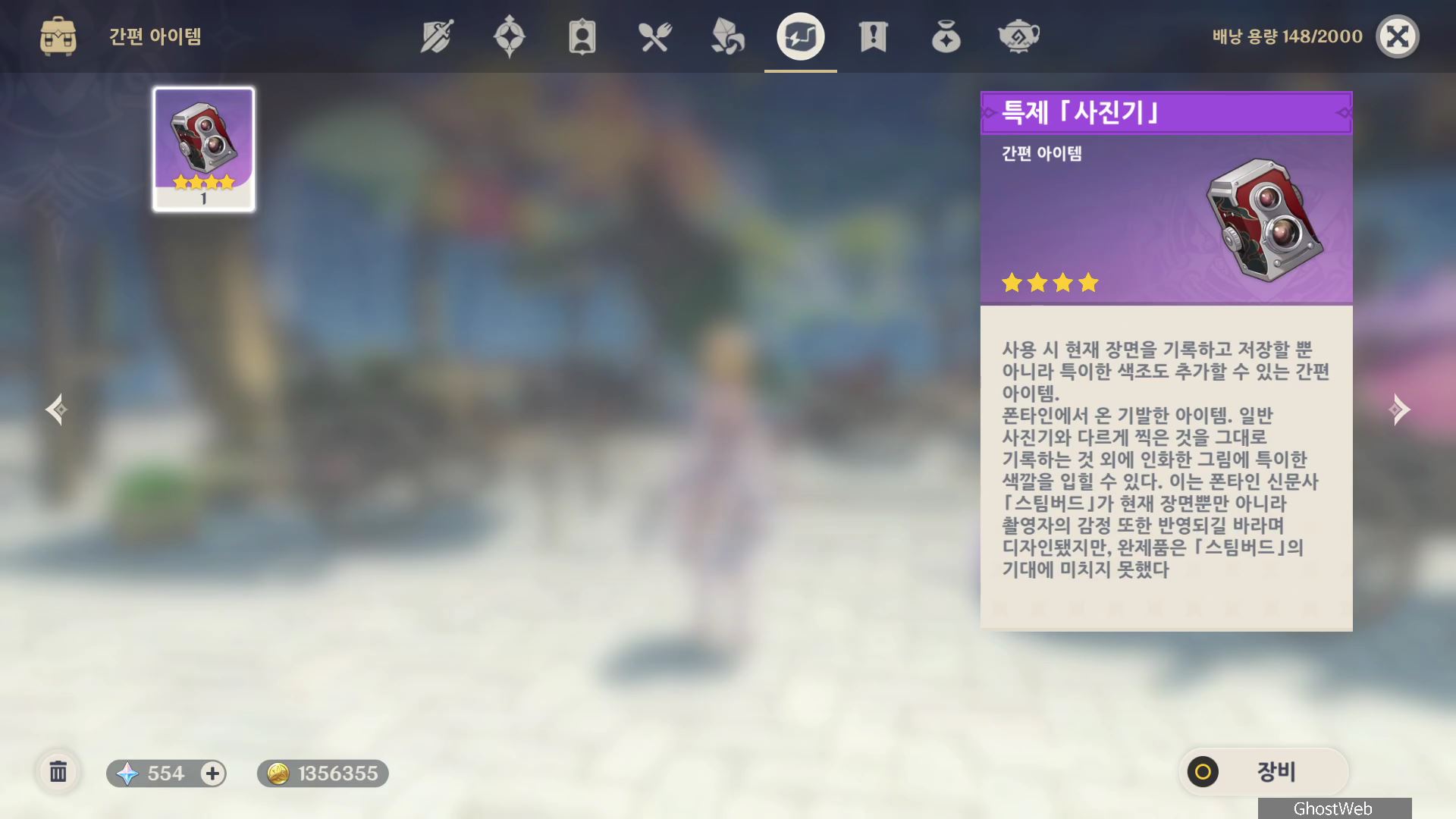 동식과 대화를 마치면 특제 사진기, 모라 10000, 모험가의 경험 4개를 얻을 수 있으며, 특제 사진기는 가방(이벤토리)를 열어 간편 아이템 페이지에서 장비한 후 Z키를 눌러 사진을 찍을 수 있어요.