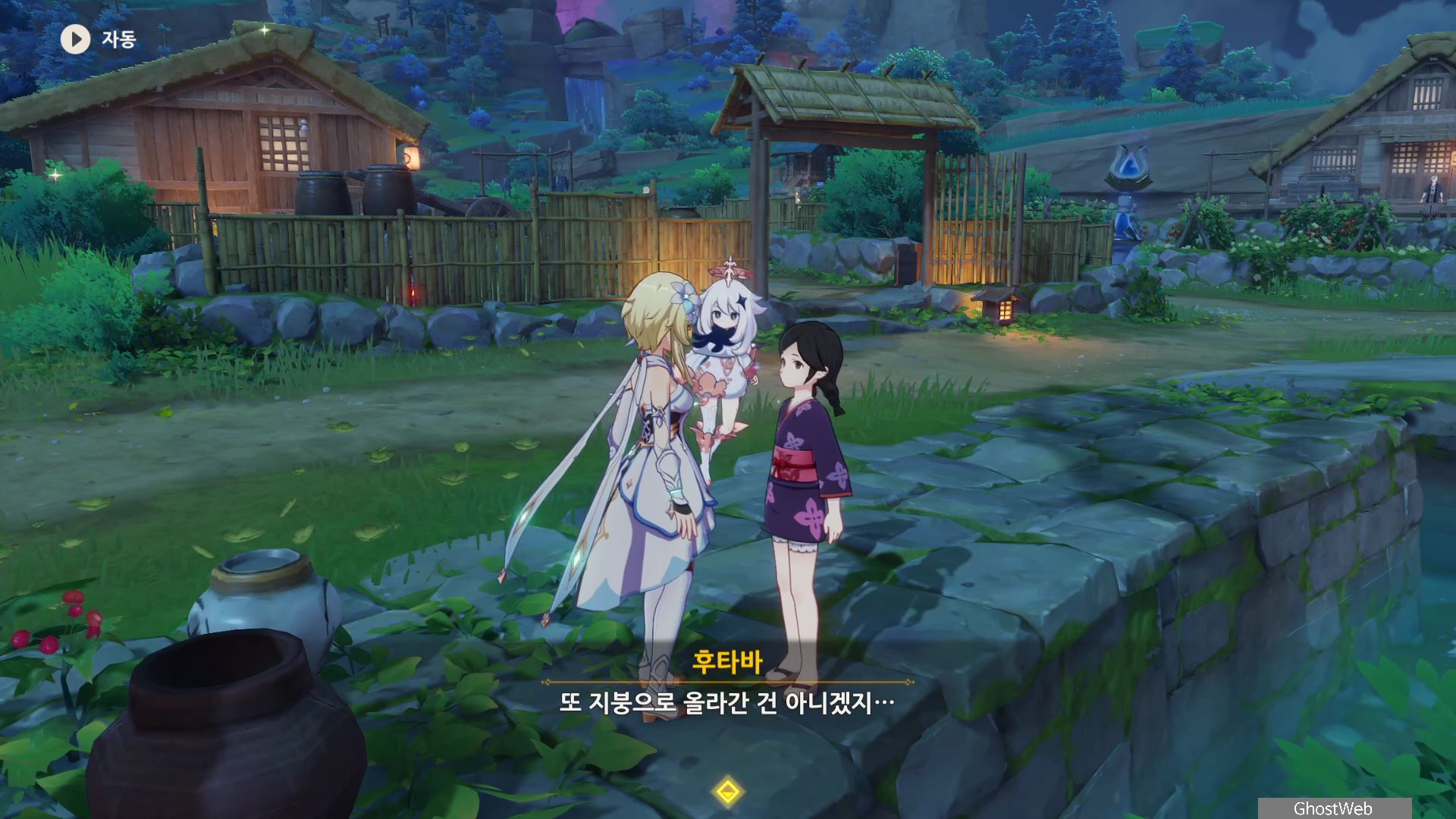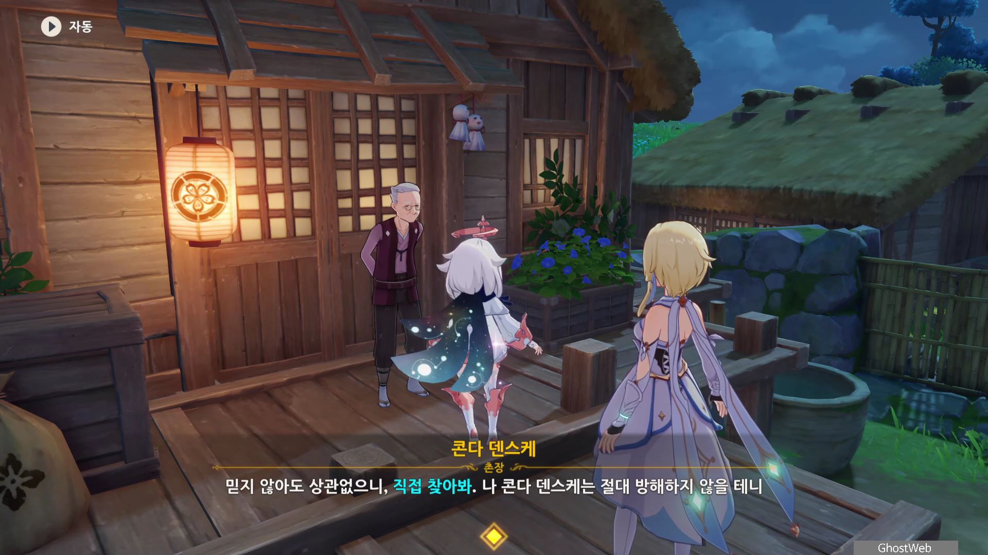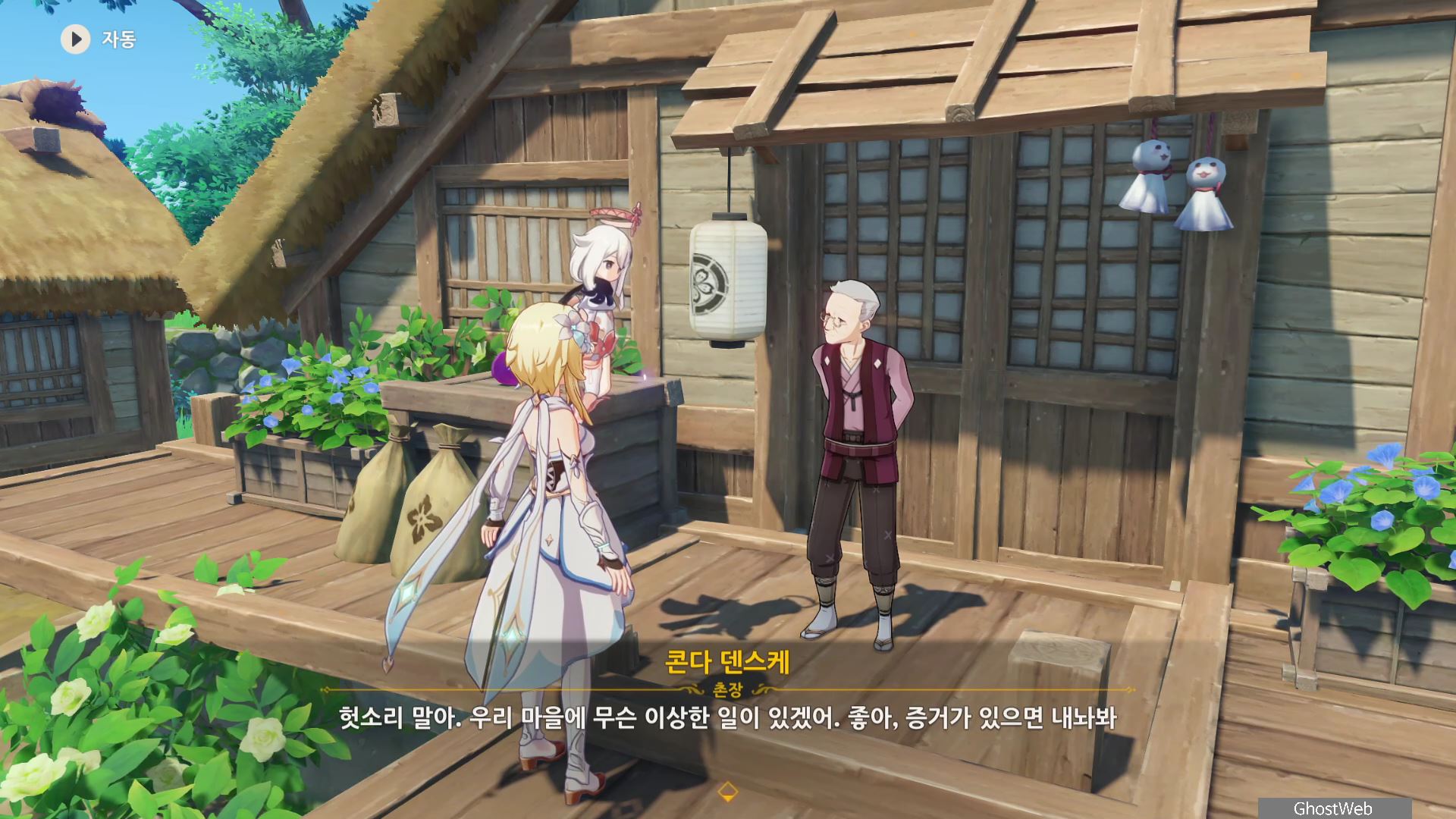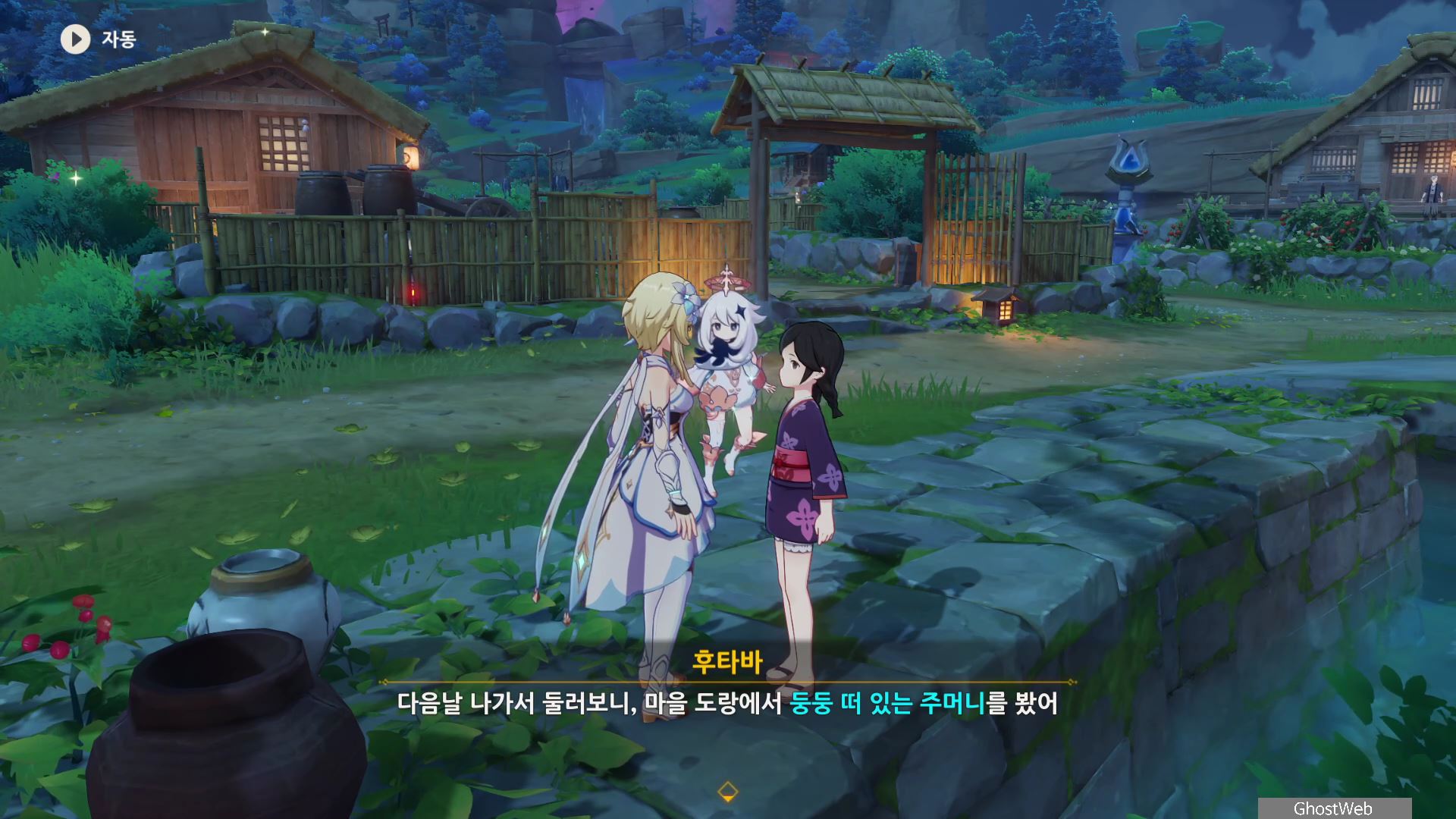 촌장의 딸인 후타바에게는 <둥둥 떠 있는 주머니>, 지붕 위에 있는 타케루에게는 <마을 어귀에 있는 낡은 차>, 사이몬 에리에게는 <촌장 집 뒤편 마른 우물 쪽에 모라 주머니>에 대한 정보를 얻을 수 있어요.