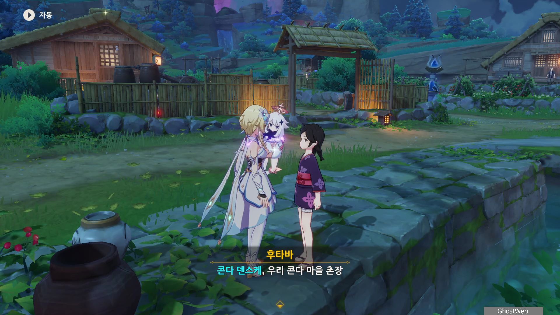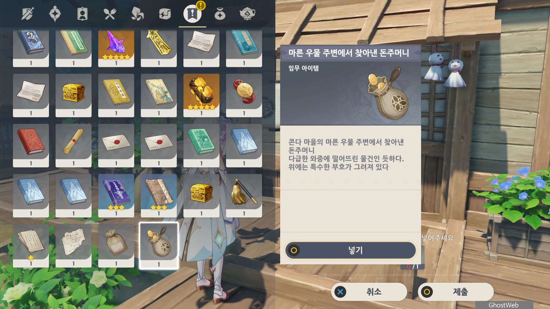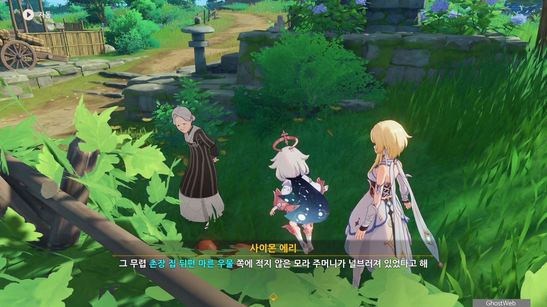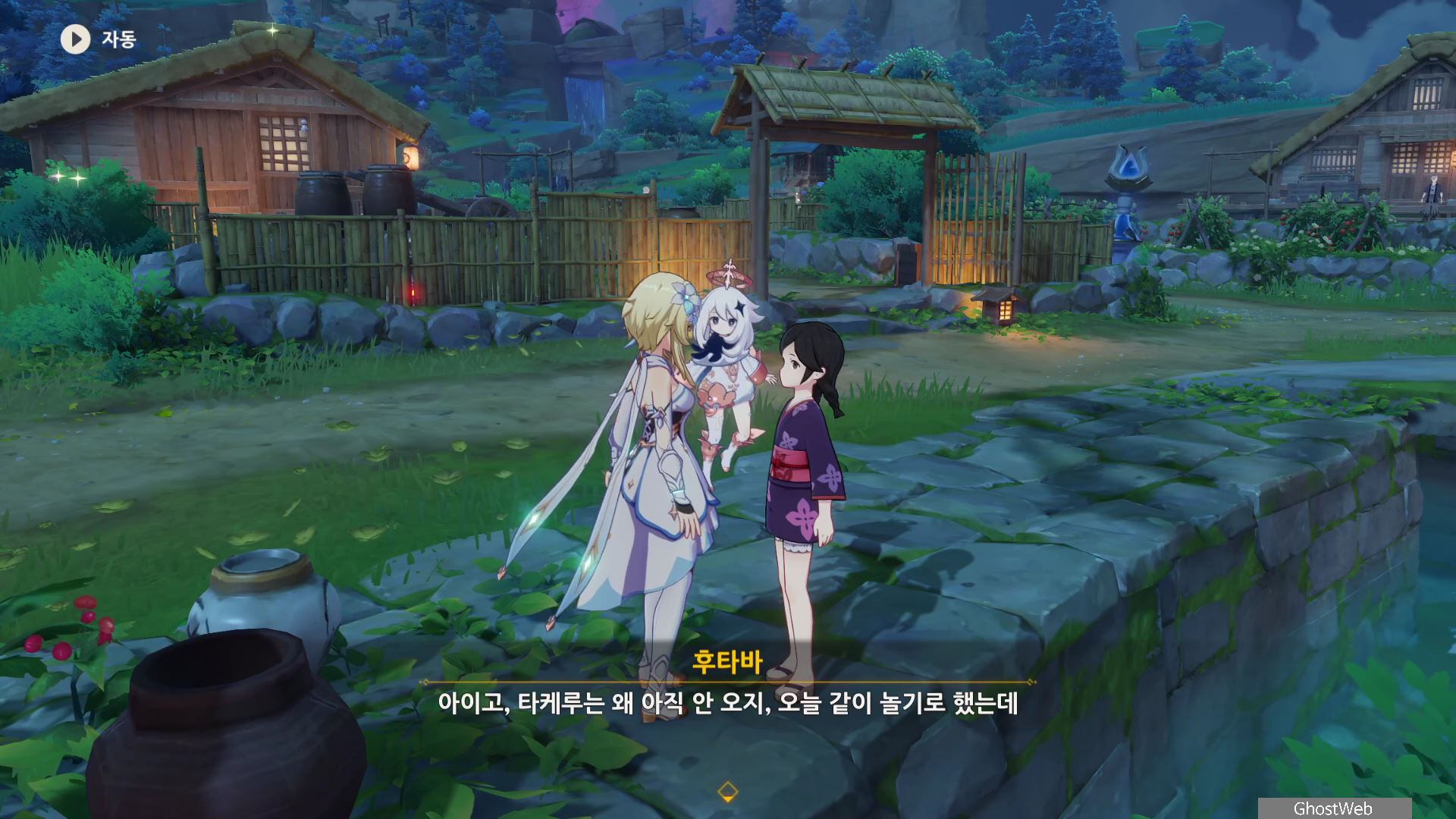 촌장의 딸인 후타바에게는 <둥둥 떠 있는 주머니>, 지붕 위에 있는 타케루에게는 <마을 어귀에 있는 낡은 차>, 사이몬 에리에게는 <촌장 집 뒤편 마른 우물 쪽에 모라 주머니>에 대한 정보를 얻을 수 있어요.