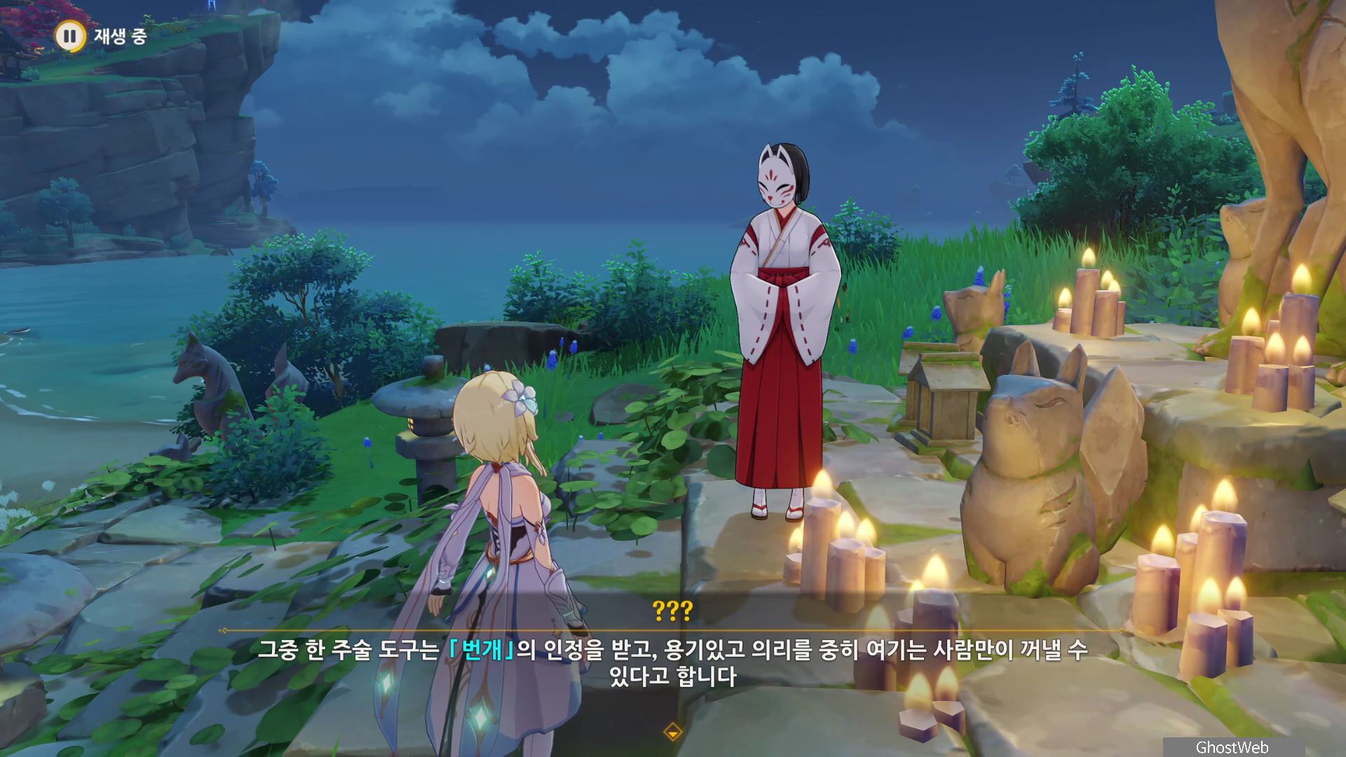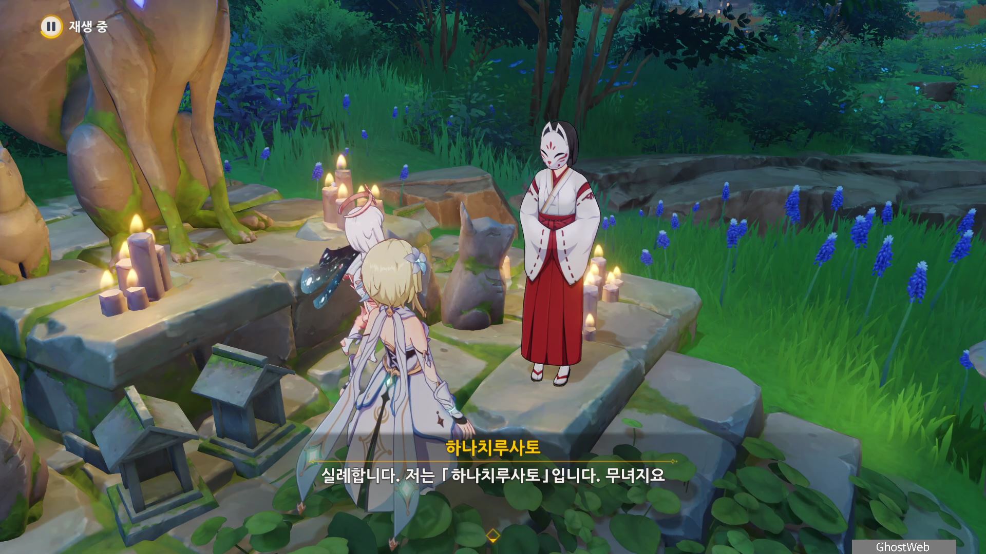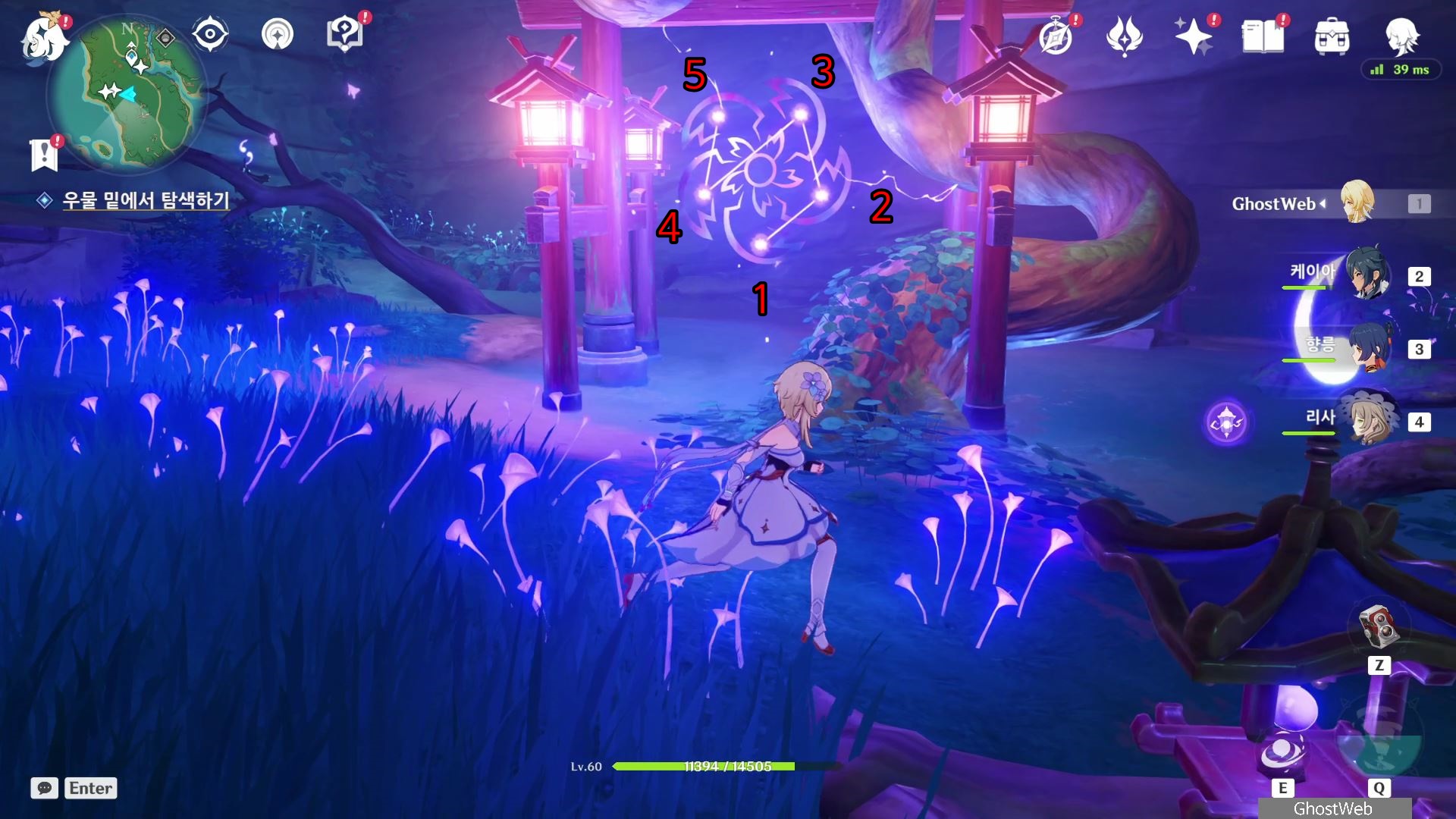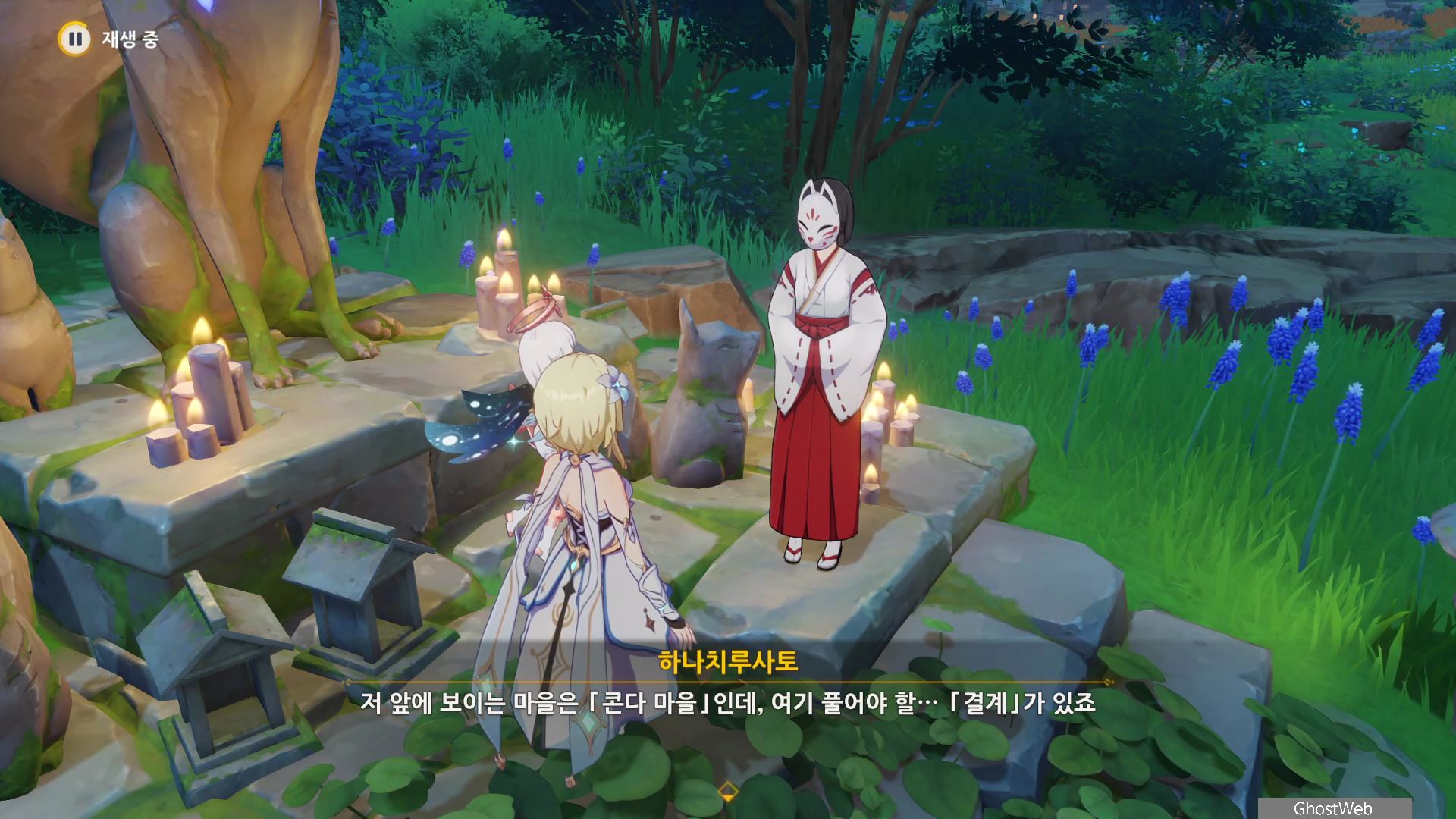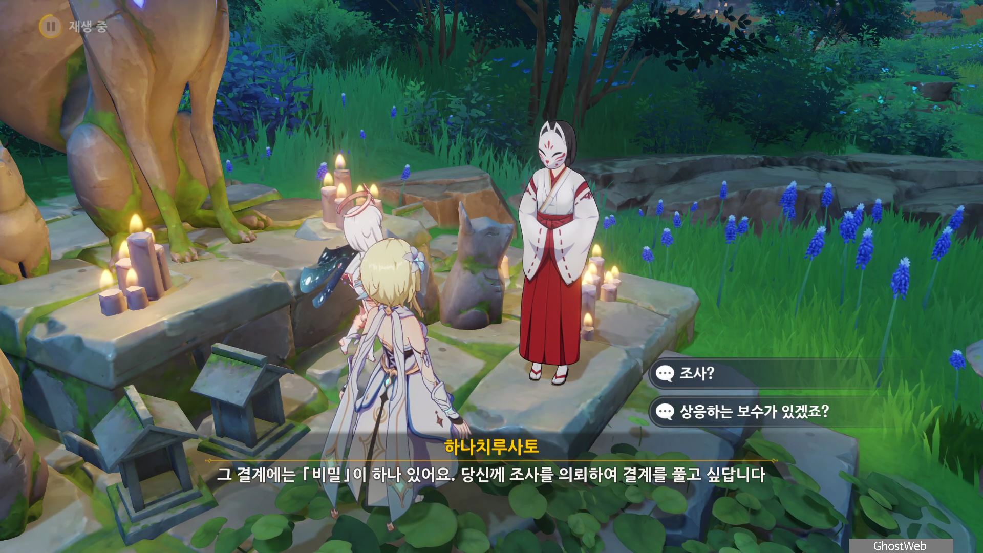 정화를 시작한 등은 1번 위치로 주변에 있는 석등의 숫자를 이미지에 표시된 것처럼 변경한 다음 1번 등에서 <기도>를 하면 나오는 낙무자를 제거하면 하나치루사토가 나타나는데 결계가 몇 군데 더 있다며 대지를 위해 도와달라고 해요.