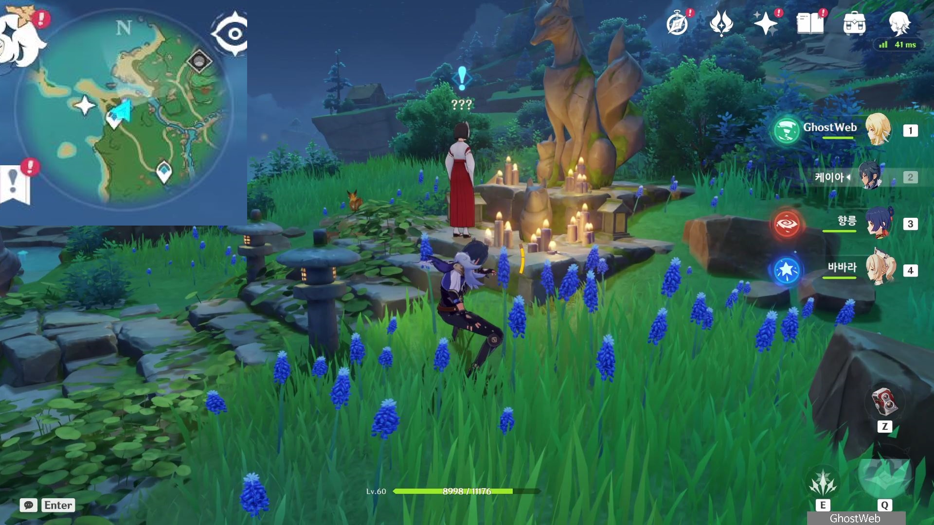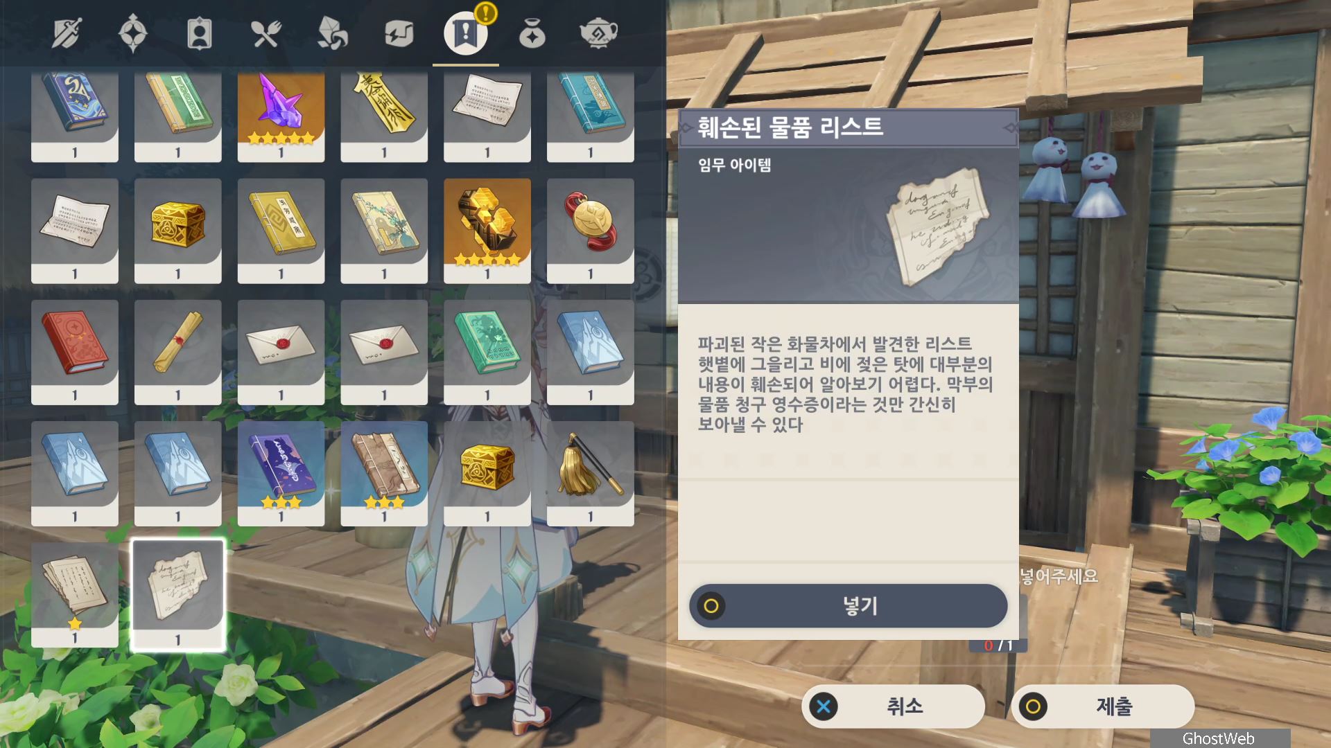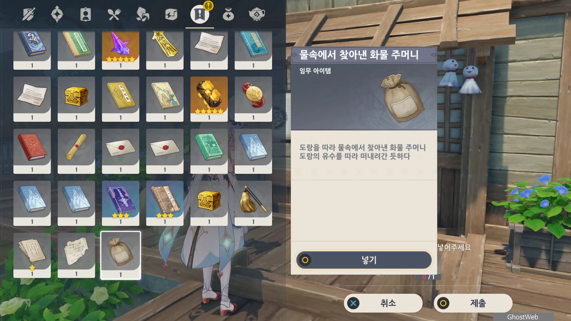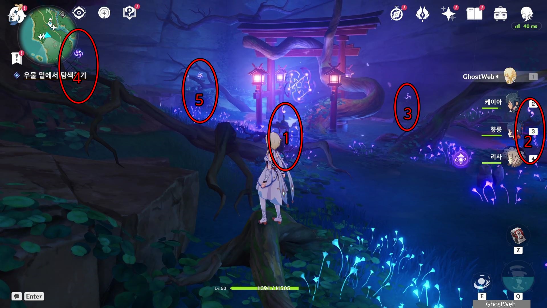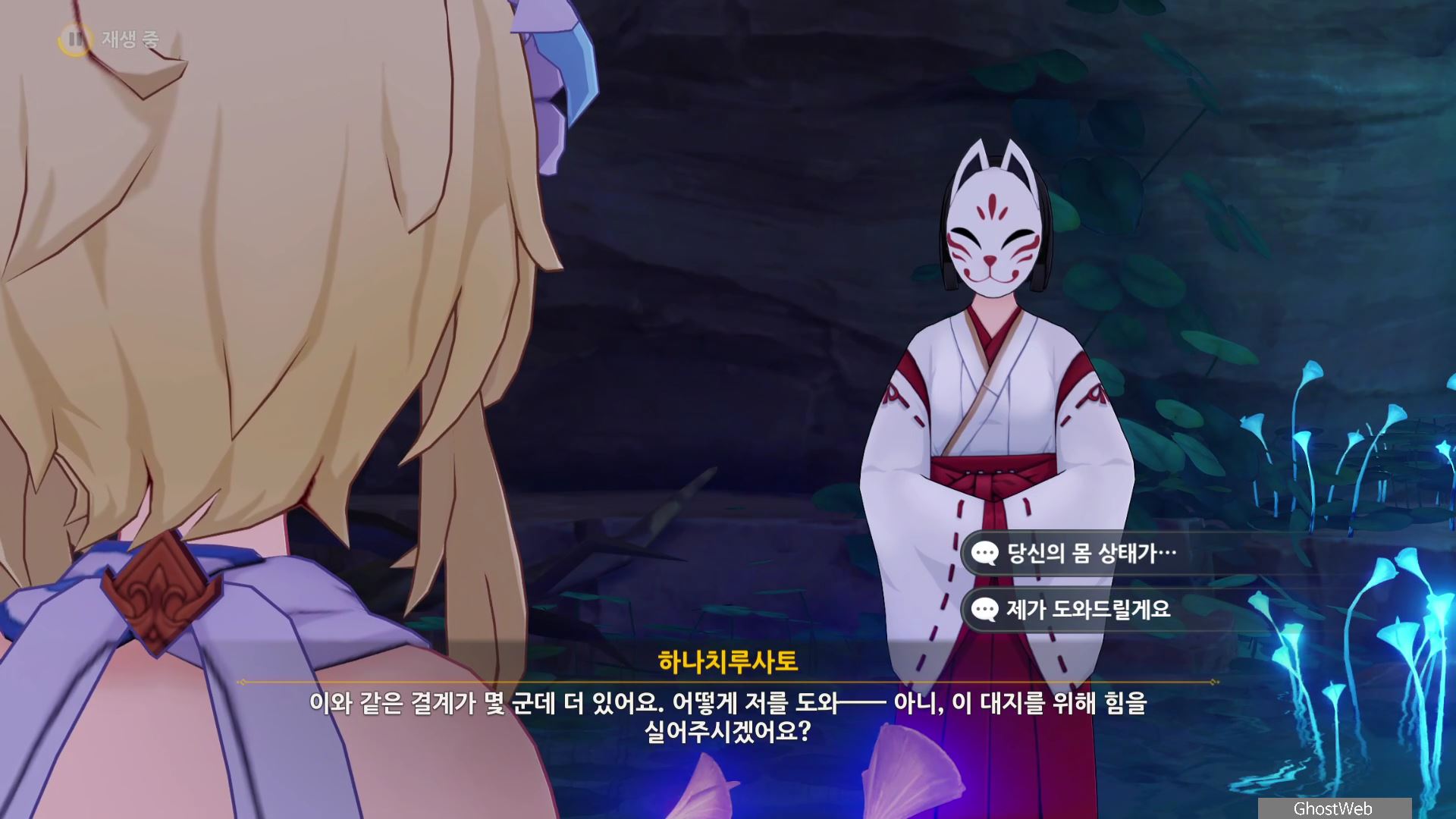 정화를 시작한 등은 1번 위치로 주변에 있는 석등의 숫자를 이미지에 표시된 것처럼 변경한 다음 1번 등에서 <기도>를 하면 나오는 낙무자를 제거하면 하나치루사토가 나타나는데 결계가 몇 군데 더 있다며 대지를 위해 도와달라고 해요.