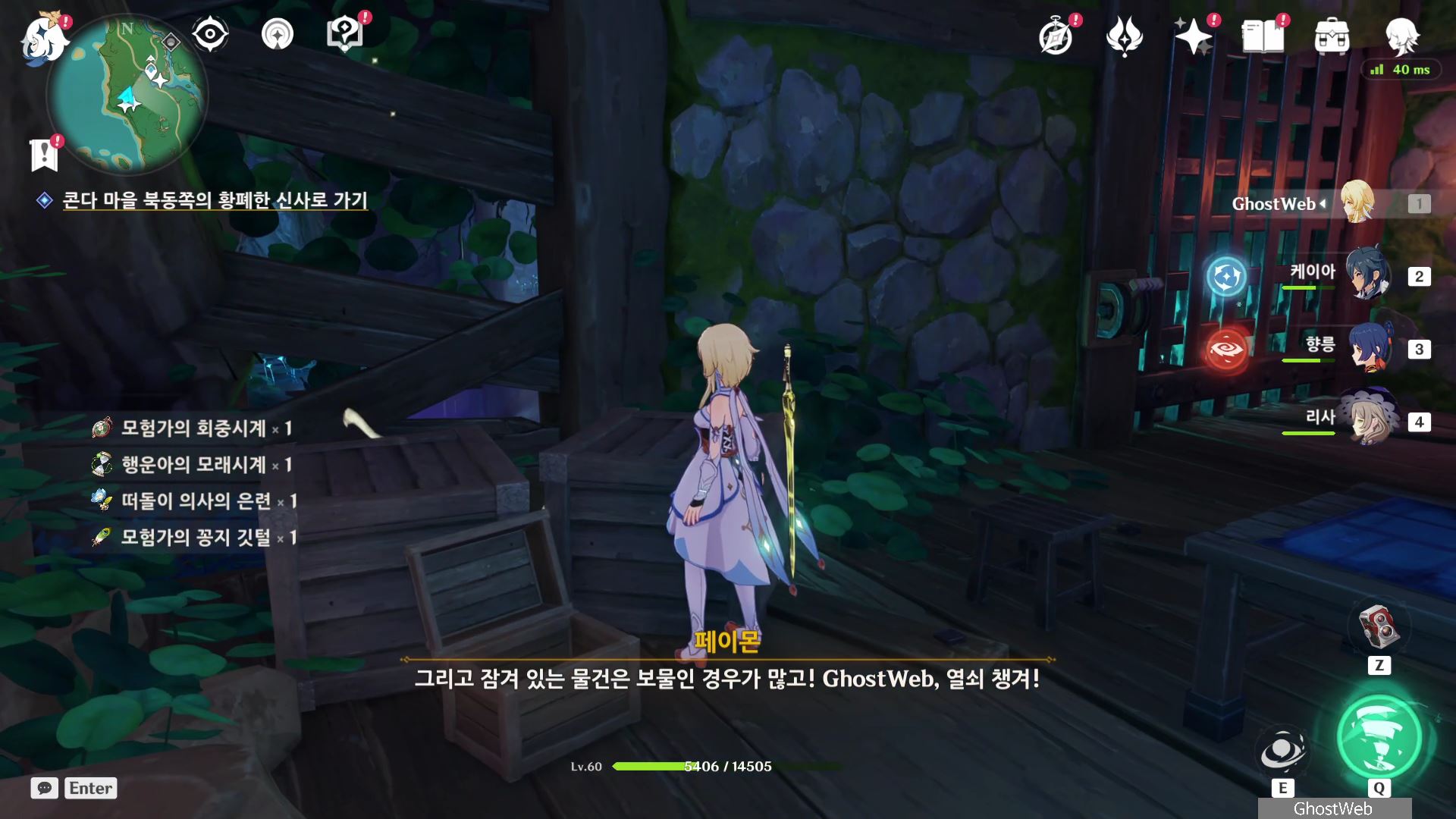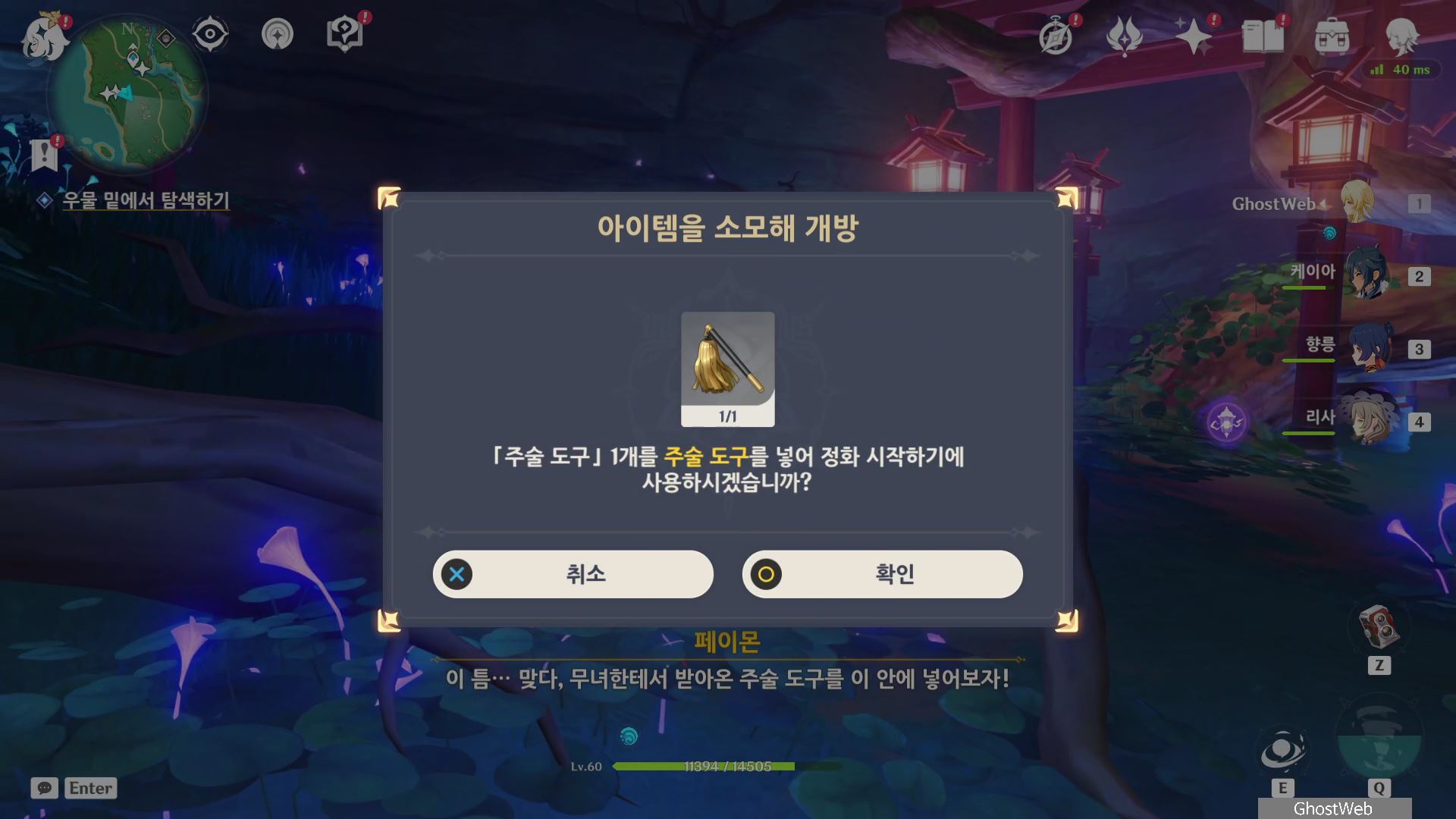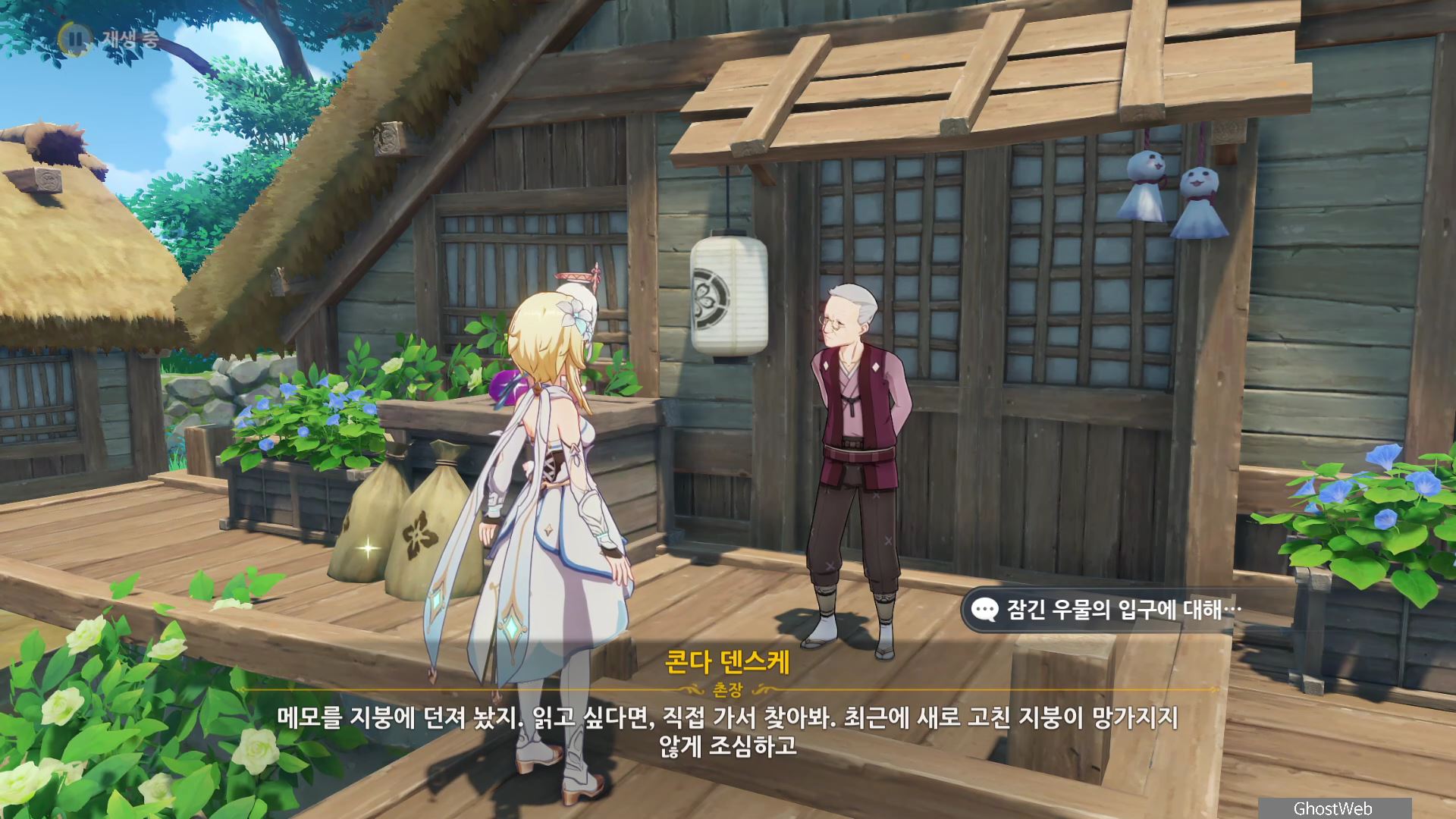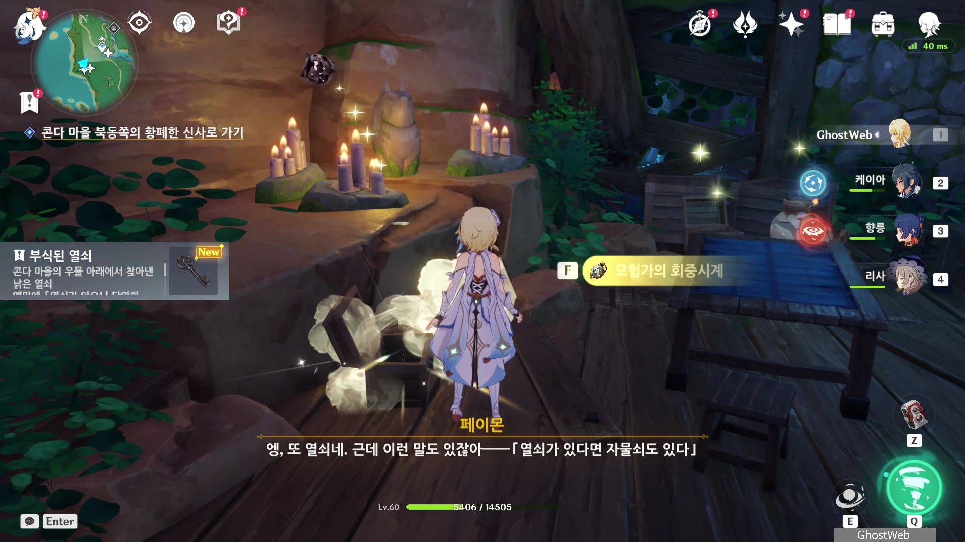석상에 번개 원소 공격을 가해 주술 도구를 꺼내주면, 콘다 마을에 풀어야 할 결계가 있다며 여행자에게 비밀 조사를 외로와 결계를 풀어달라고 부탁해요.