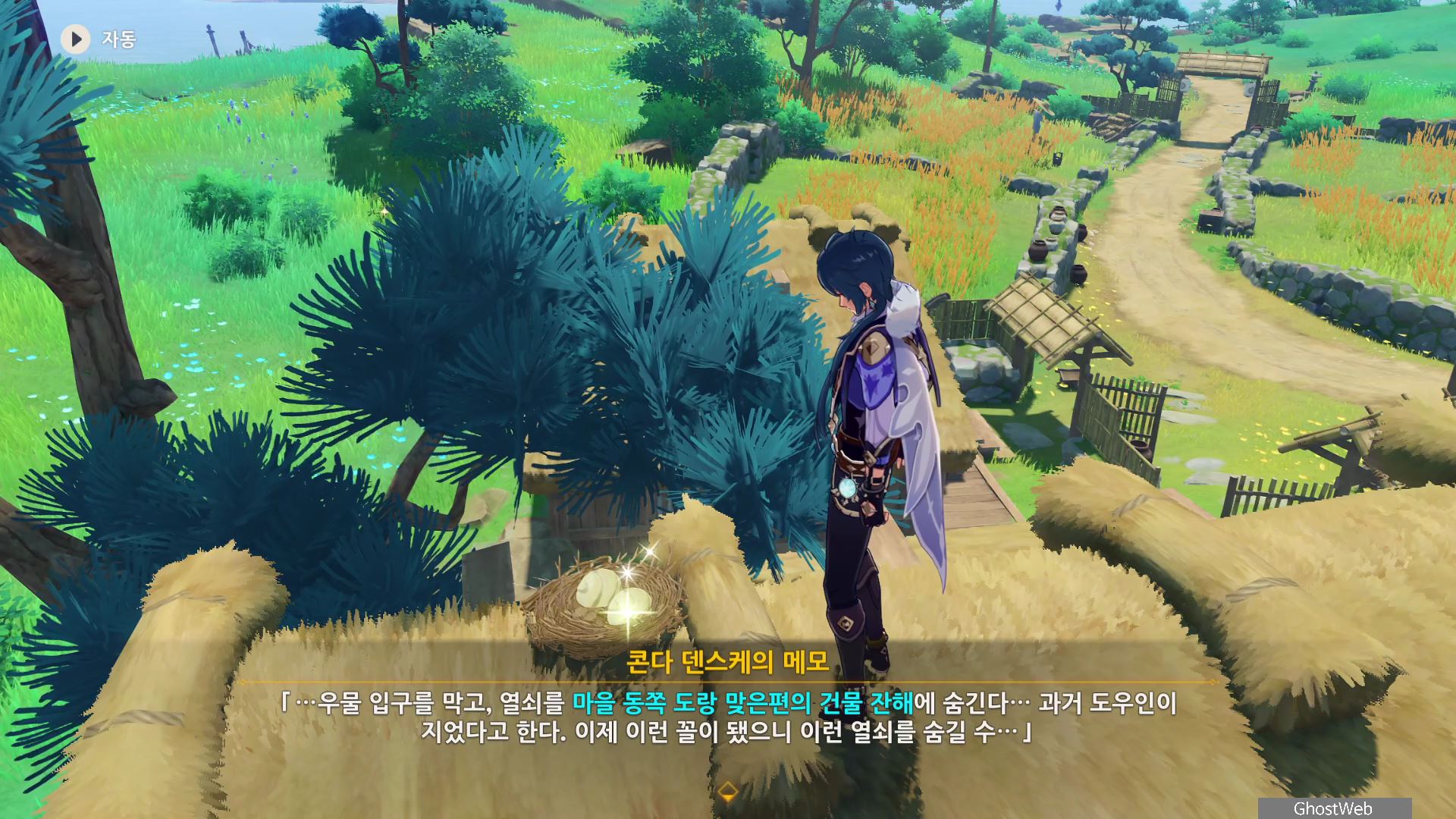 3개의 단서를 찾은 여행자는 다시 촌장인 콘다 덴스케에게 3개의 증거를 보여주며, 사건에 대한 내용과 지붕위의 메모를 통해 우물 입구를 열 수 있는 열쇠를 <마을 동쪽 도랑 맞은편의 건물 잔해>에 숨겼다는 정보를 얻을 수 있어요.