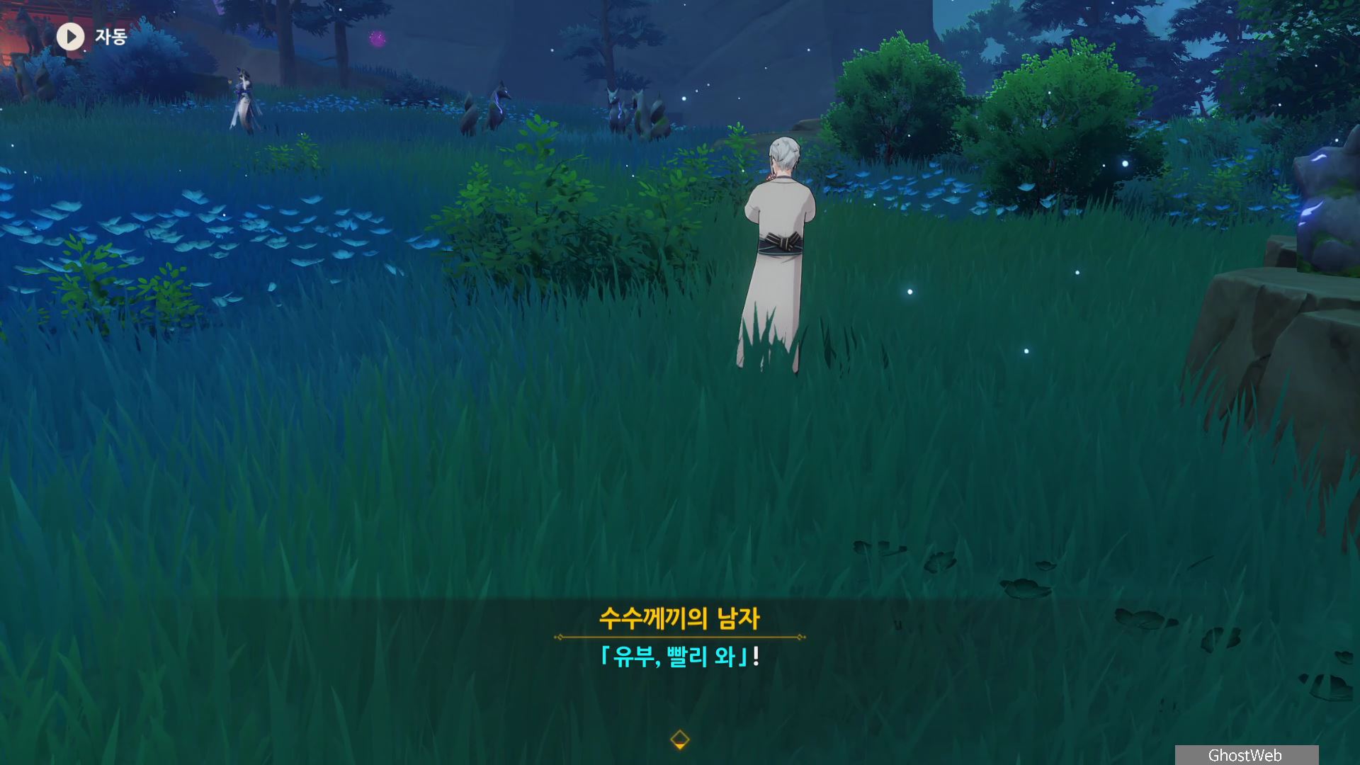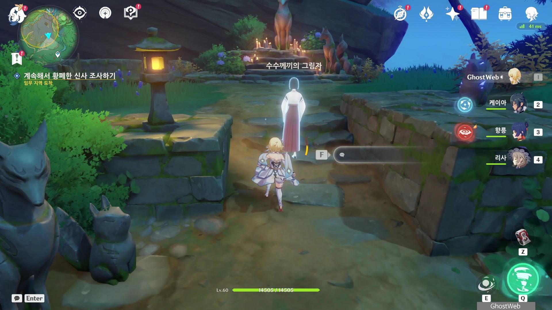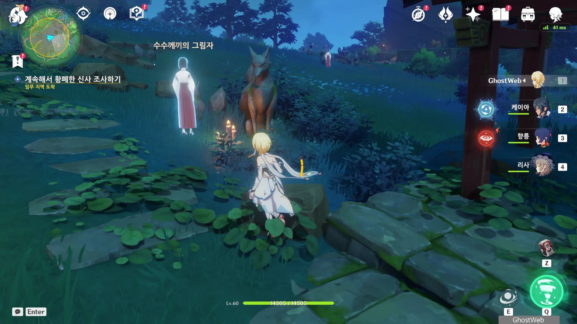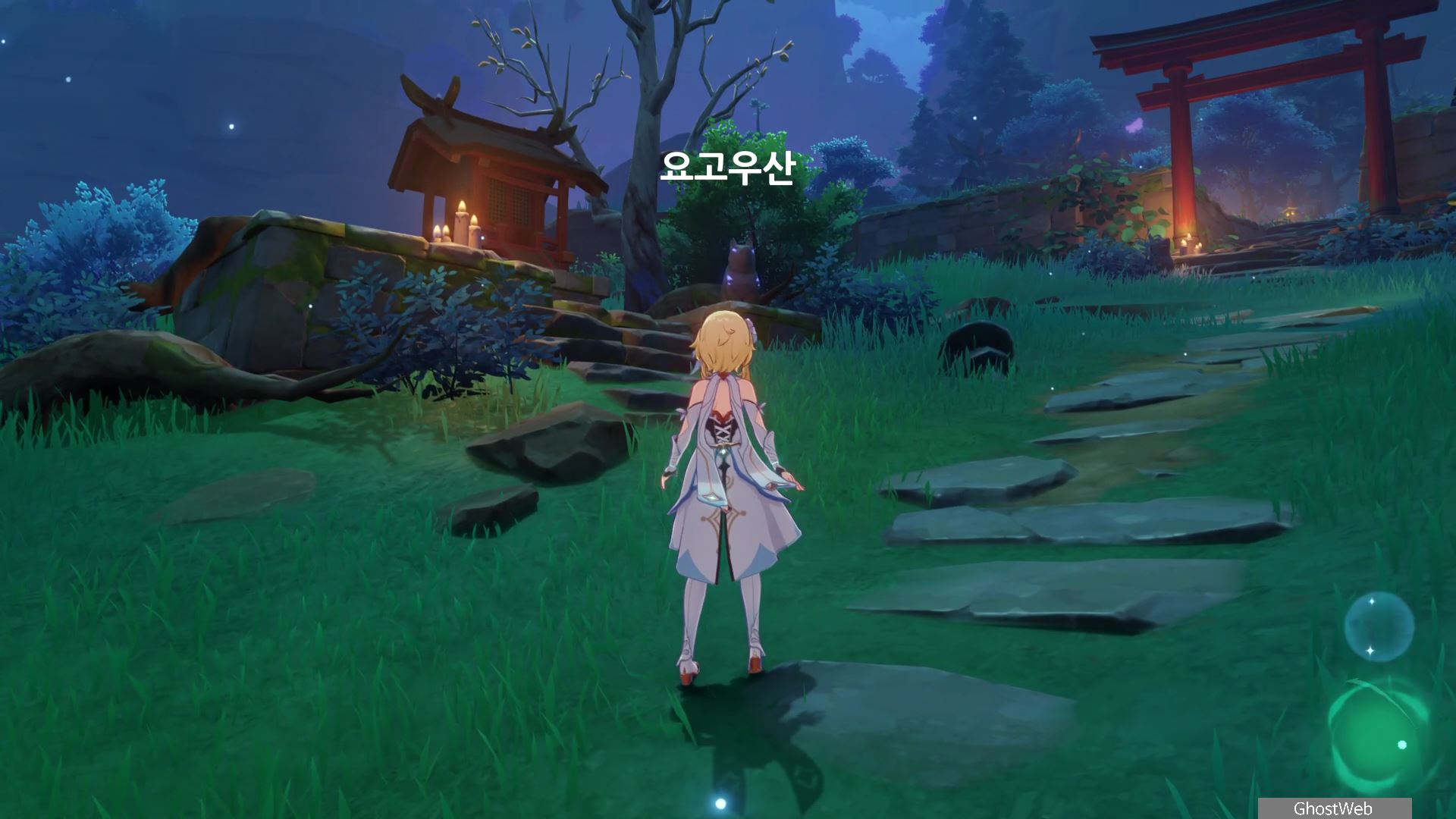 황폐한 신사 주변에 있는 3명의 무녀(귀신?)에 대화를 걸어 가운데 있는 여우 석상 3개가 모여 있는 곳에 모이게 하세요.