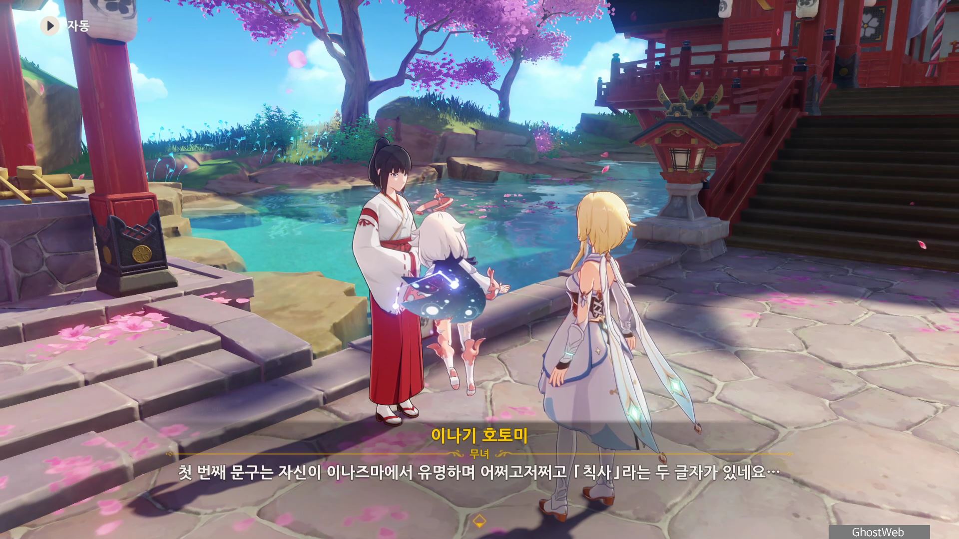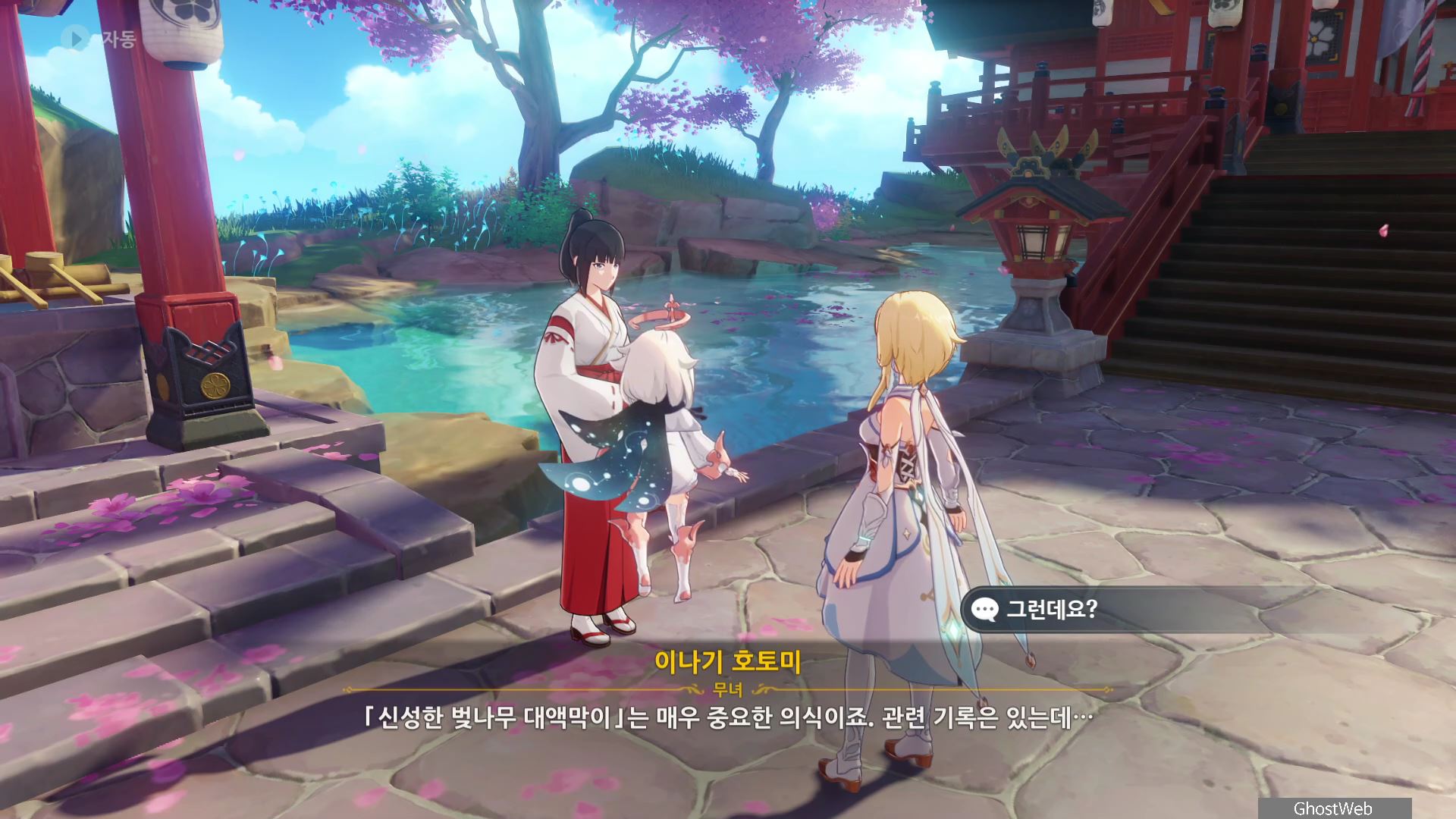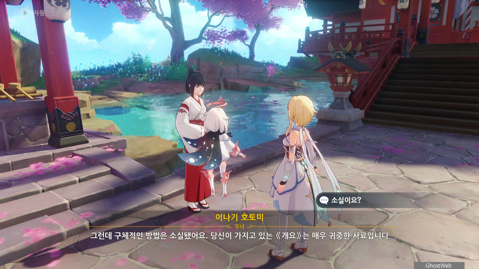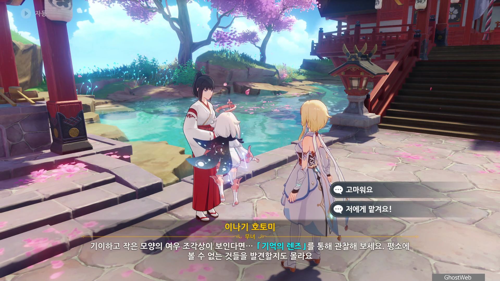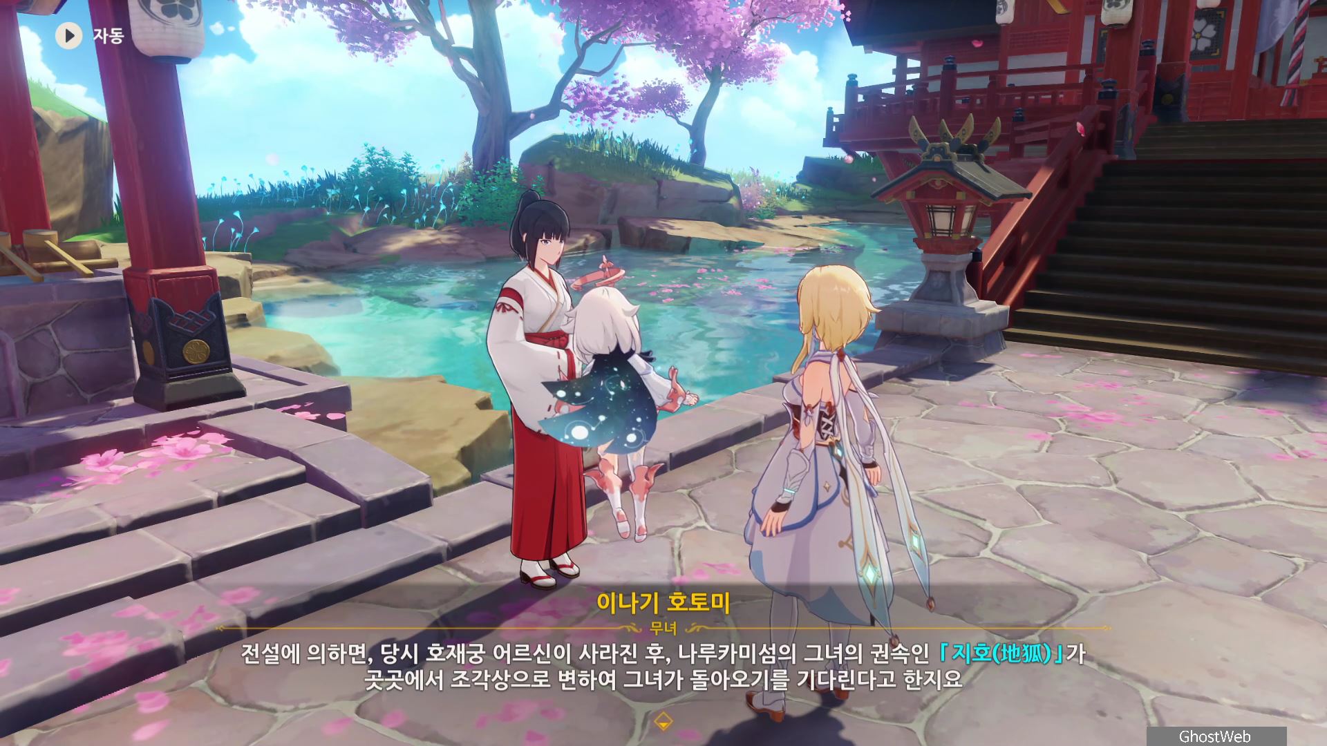 3명의 무녀가 여우 석상 모이면 근처에 보물 상자가 3개가 나타나며 석상 가운데서 <신성한 벚나무 대액막이 개요>를 얻을 수 있는데, 잘 모르는 내용이라 나루카미 다이샤에 있는 무녀인 <이나기 호토미>에게 물어보기로 하고 나루카미 다이샤로 이동해요.