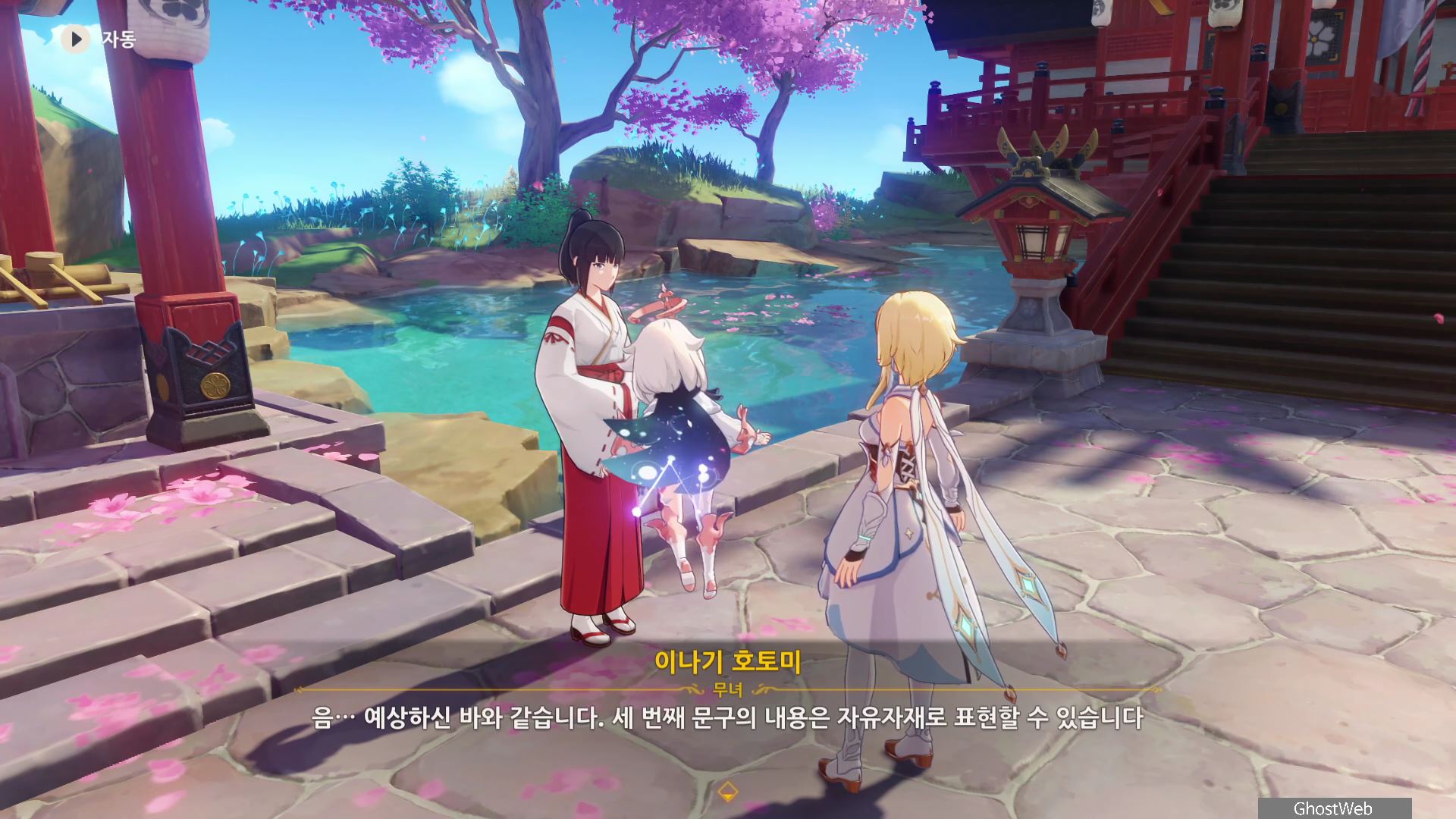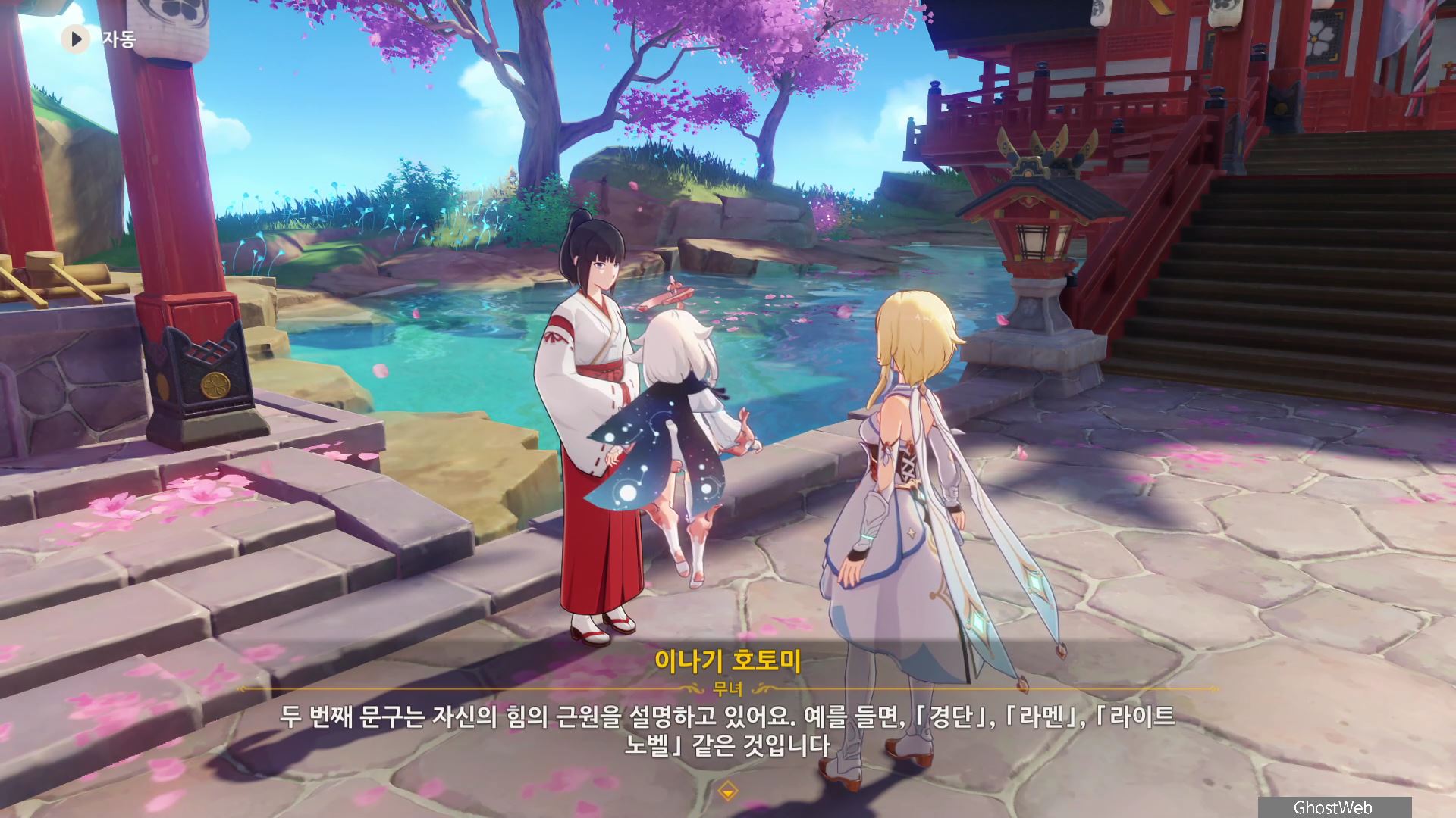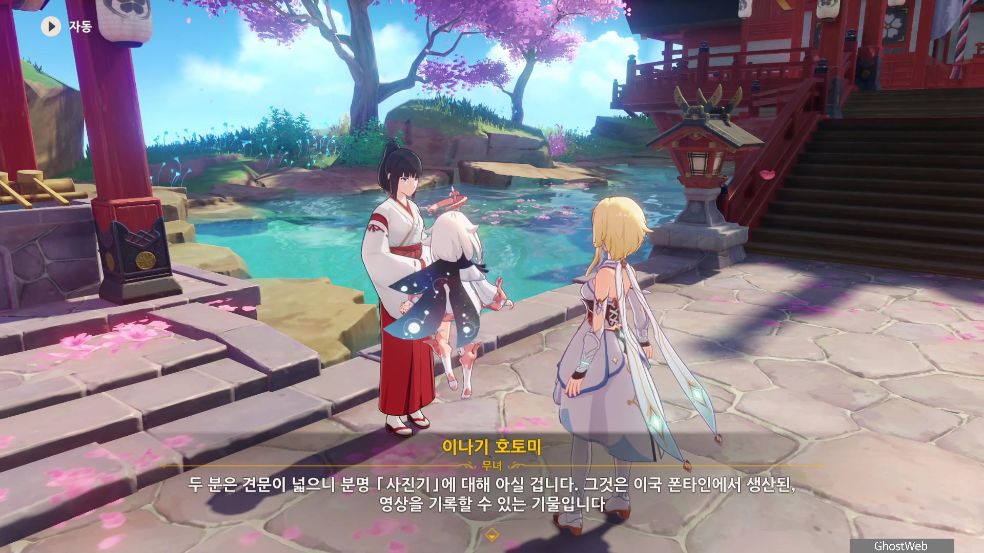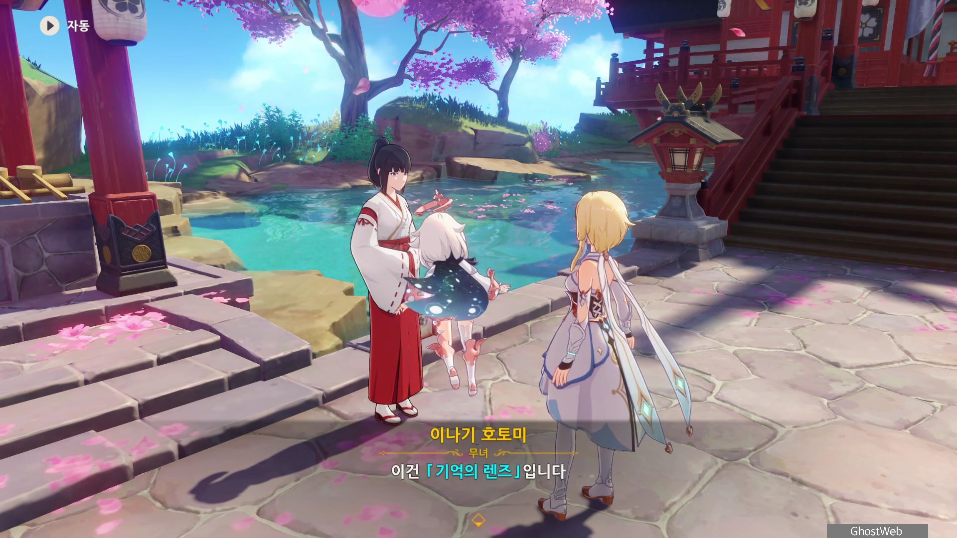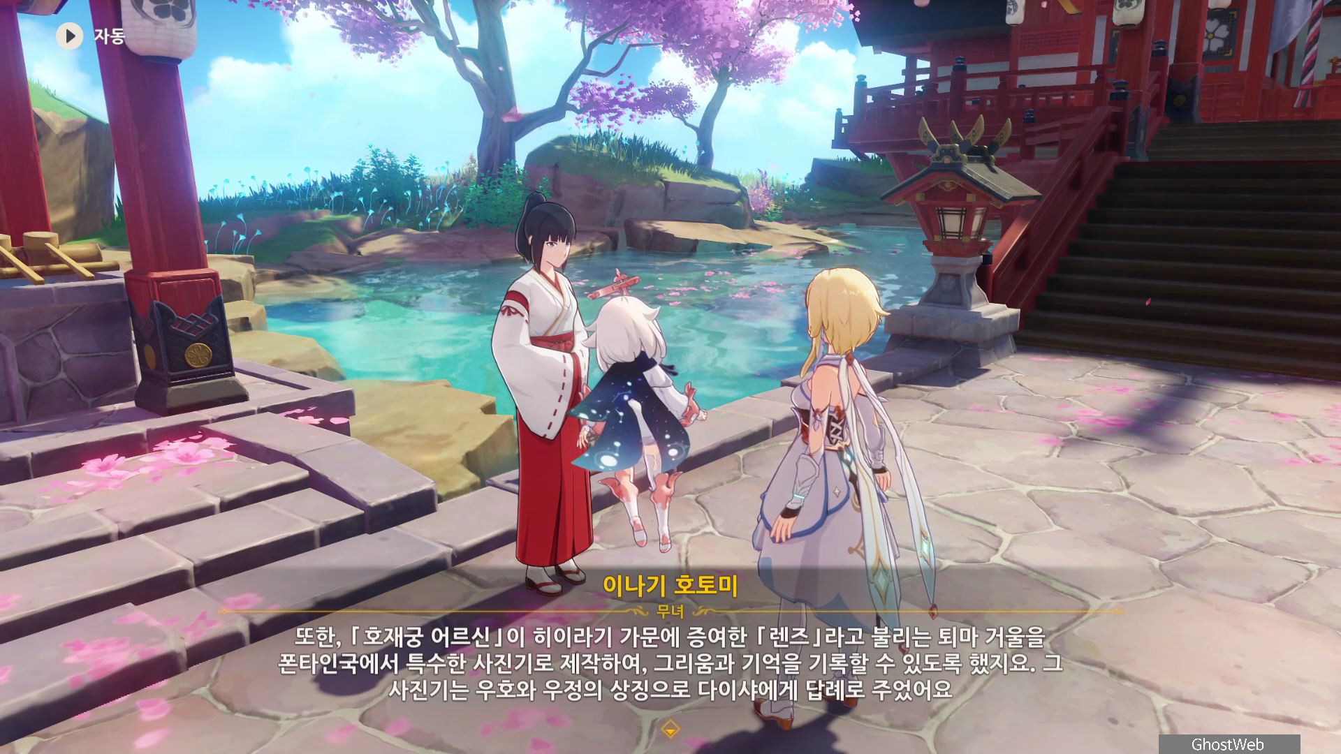 3명의 무녀가 여우 석상 모이면 근처에 보물 상자가 3개가 나타나며 석상 가운데서 <신성한 벚나무 대액막이 개요>를 얻을 수 있는데, 잘 모르는 내용이라 나루카미 다이샤에 있는 무녀인 <이나기 호토미>에게 물어보기로 하고 나루카미 다이샤로 이동해요.