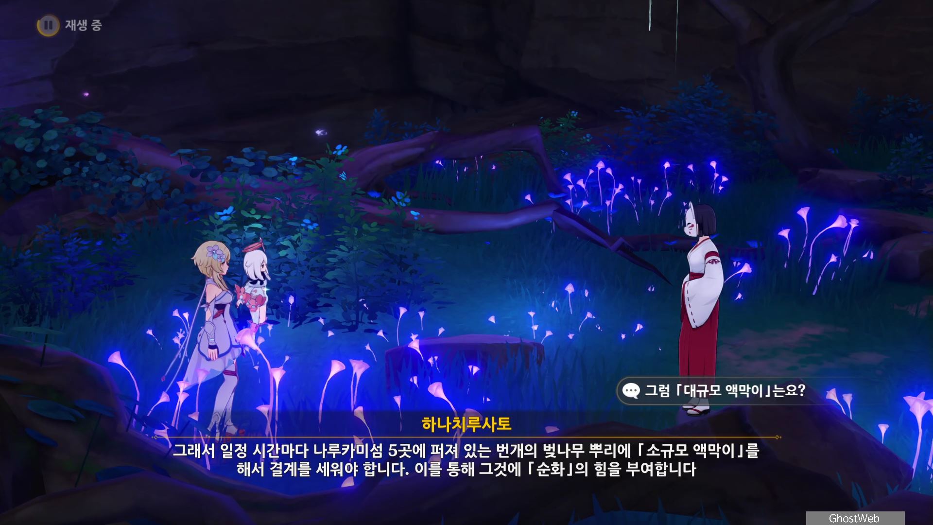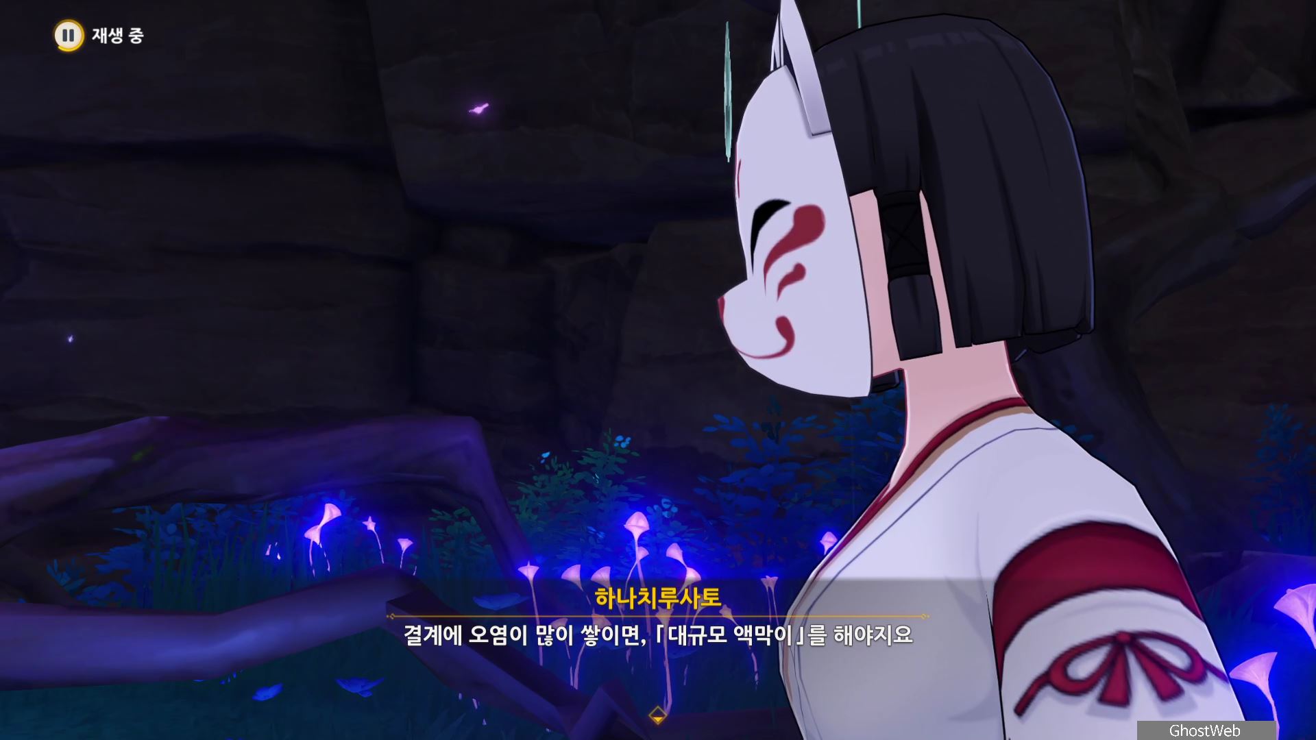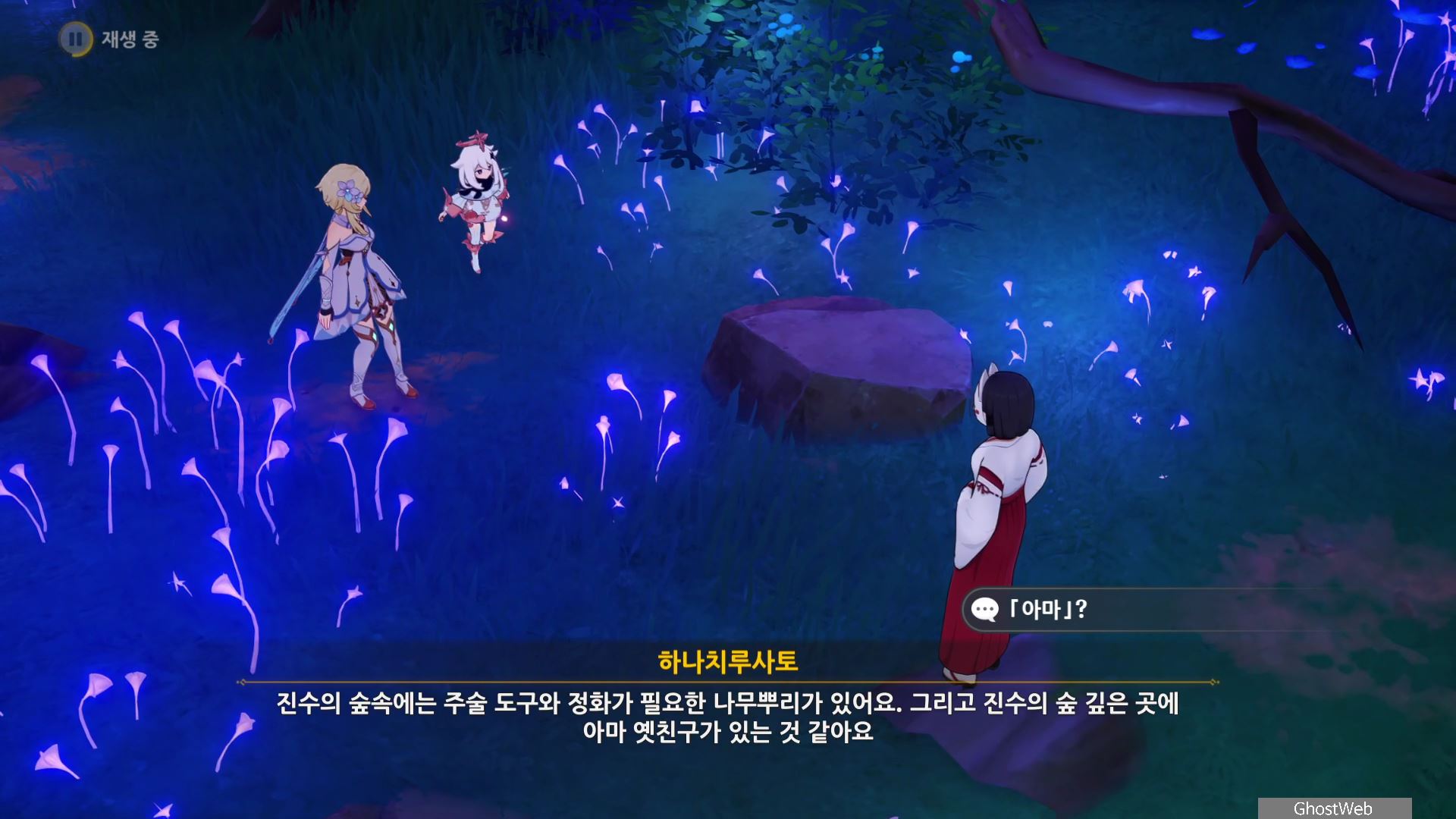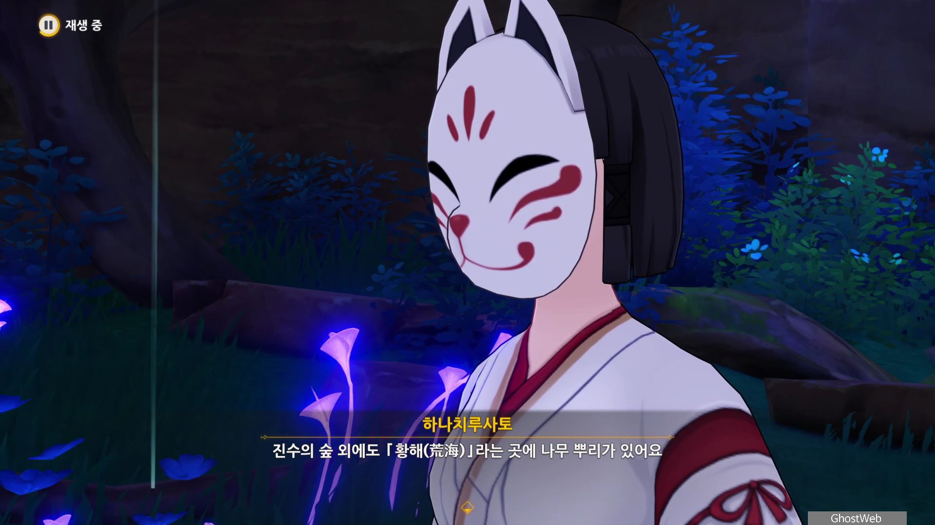 몬스터를 처치 후 하나치루사토와 대화를 통해 진수의 숲 속에 주술 도구와 정화가 필요한 나무뿌리가 있는 정화를 위해 옛 친구의 도움을 받아야 한다고 해요.