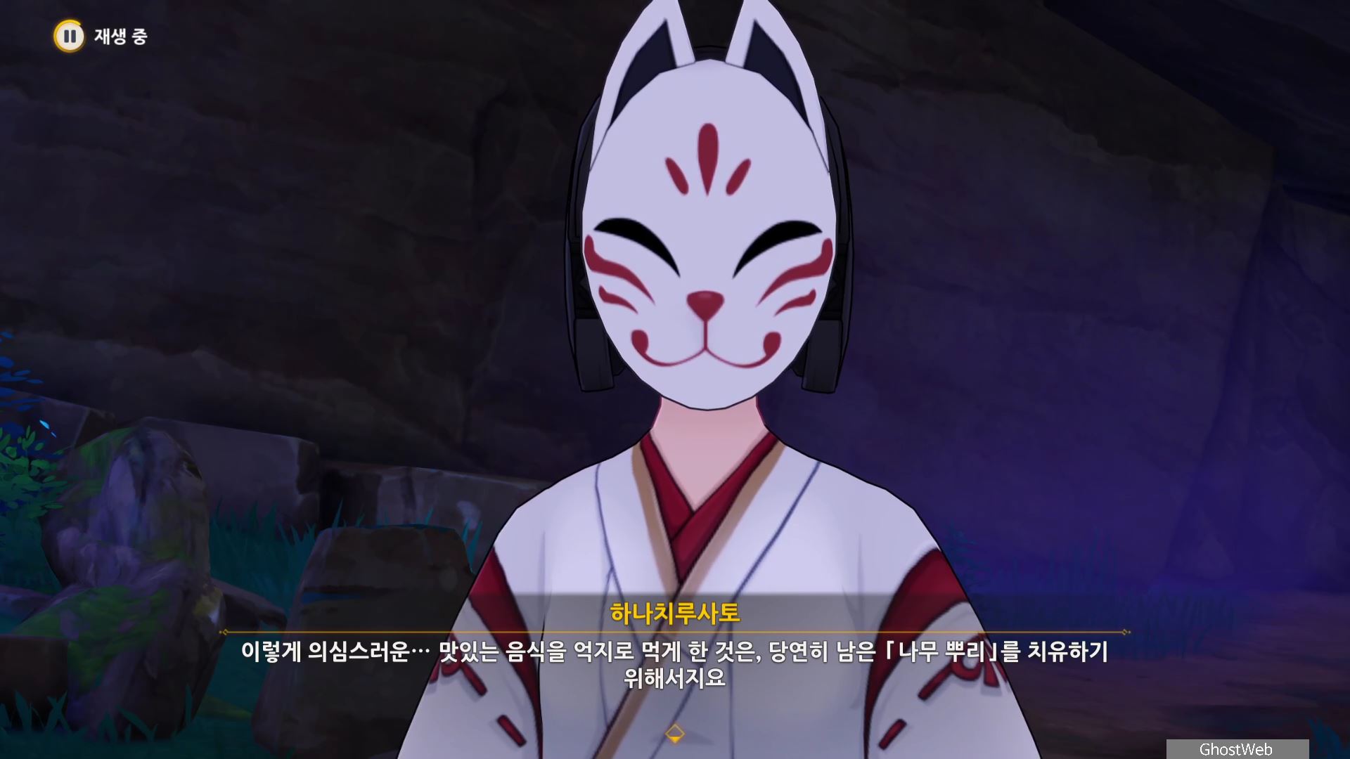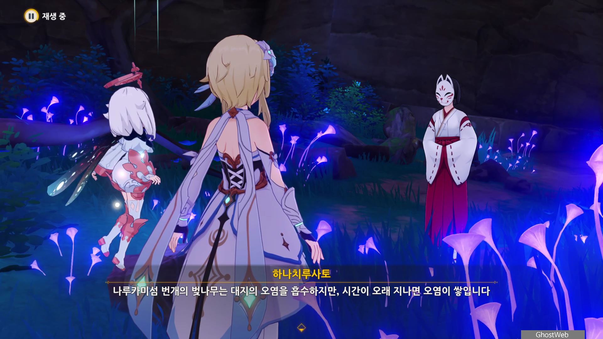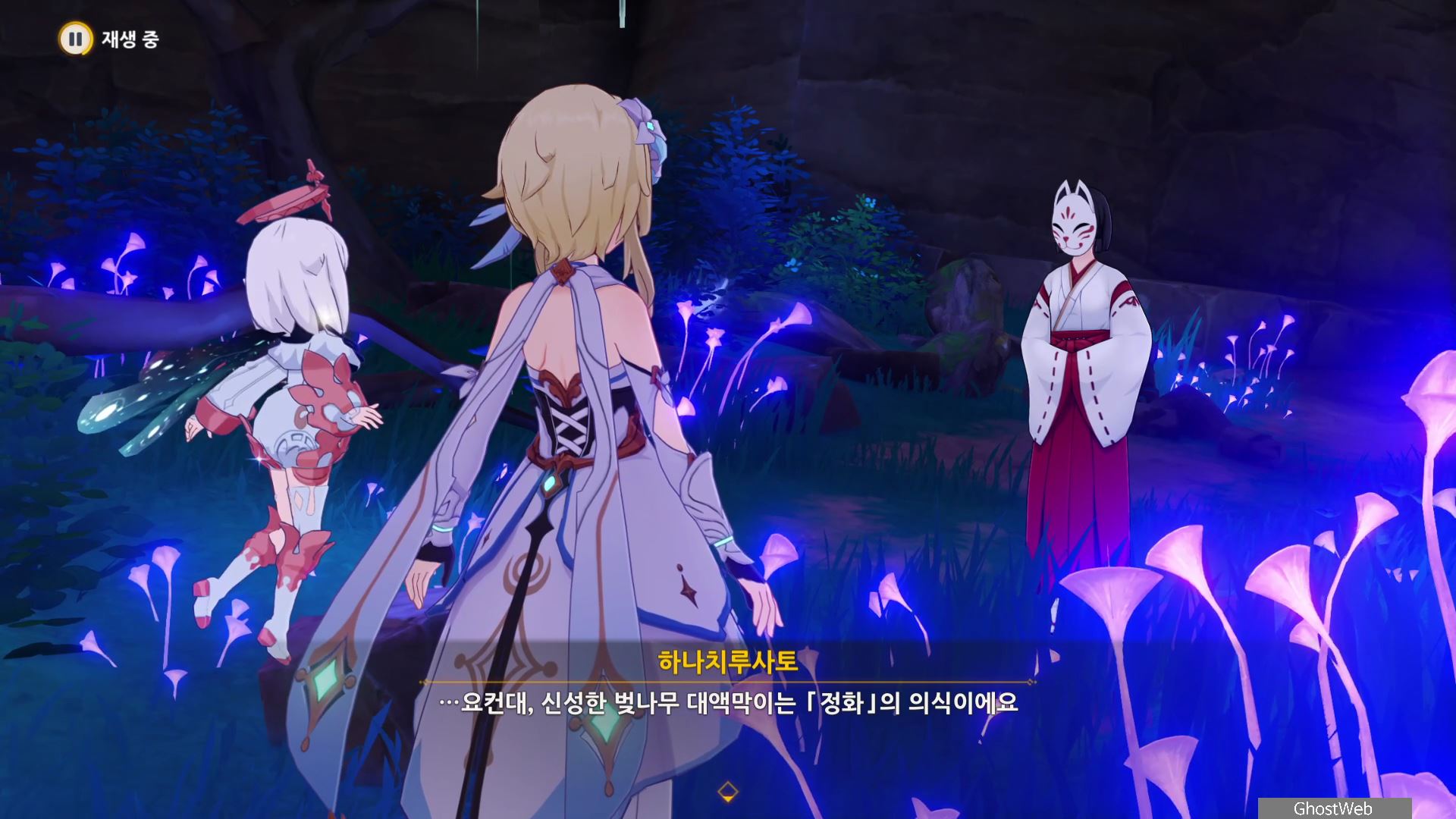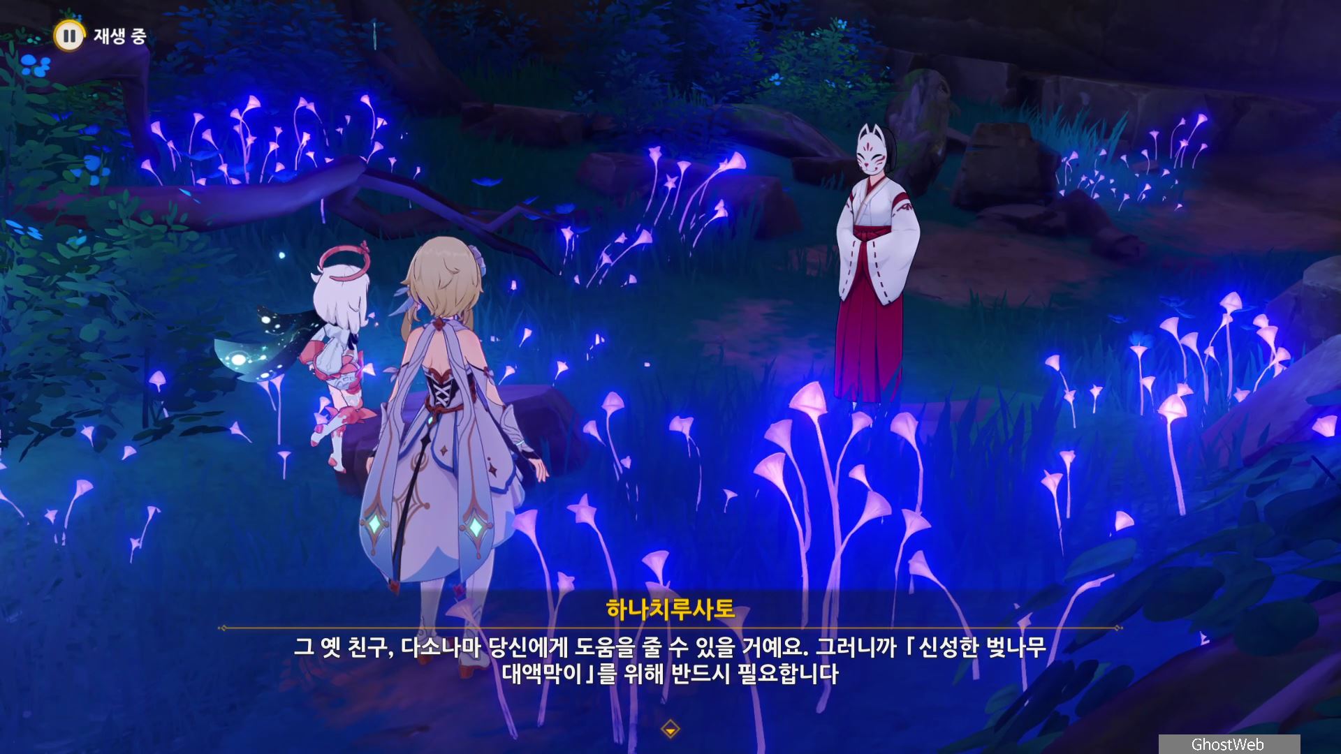 몬스터를 처치 후 하나치루사토와 대화를 통해 진수의 숲 속에 주술 도구와 정화가 필요한 나무뿌리가 있는 정화를 위해 옛 친구의 도움을 받아야 한다고 해요.