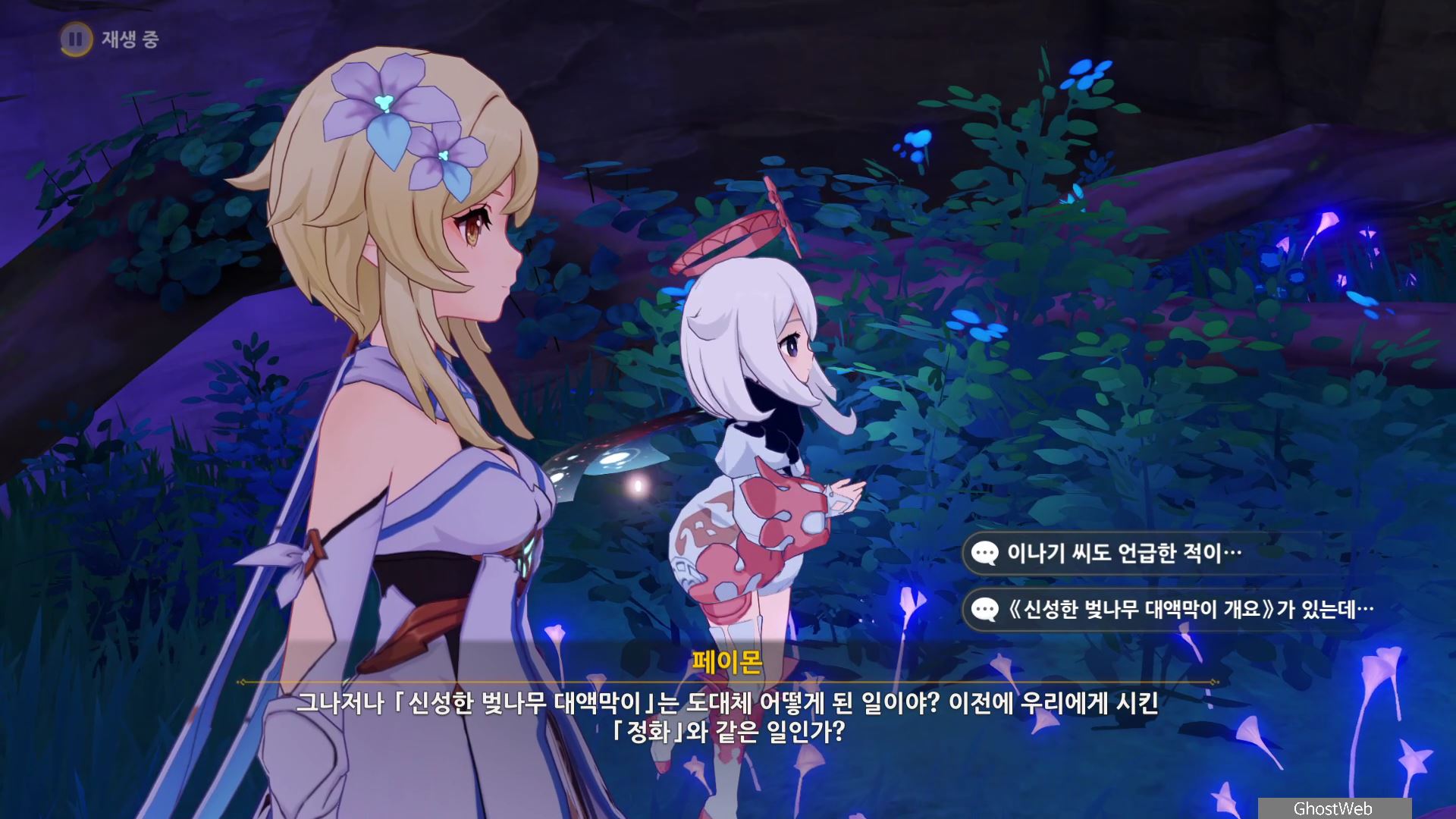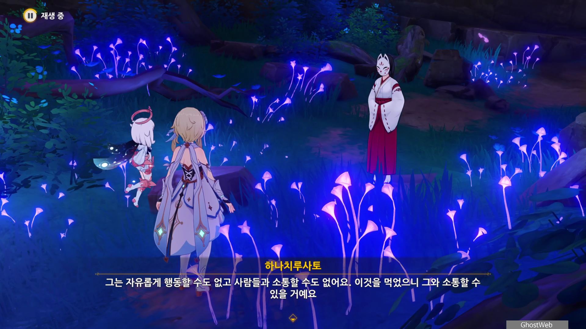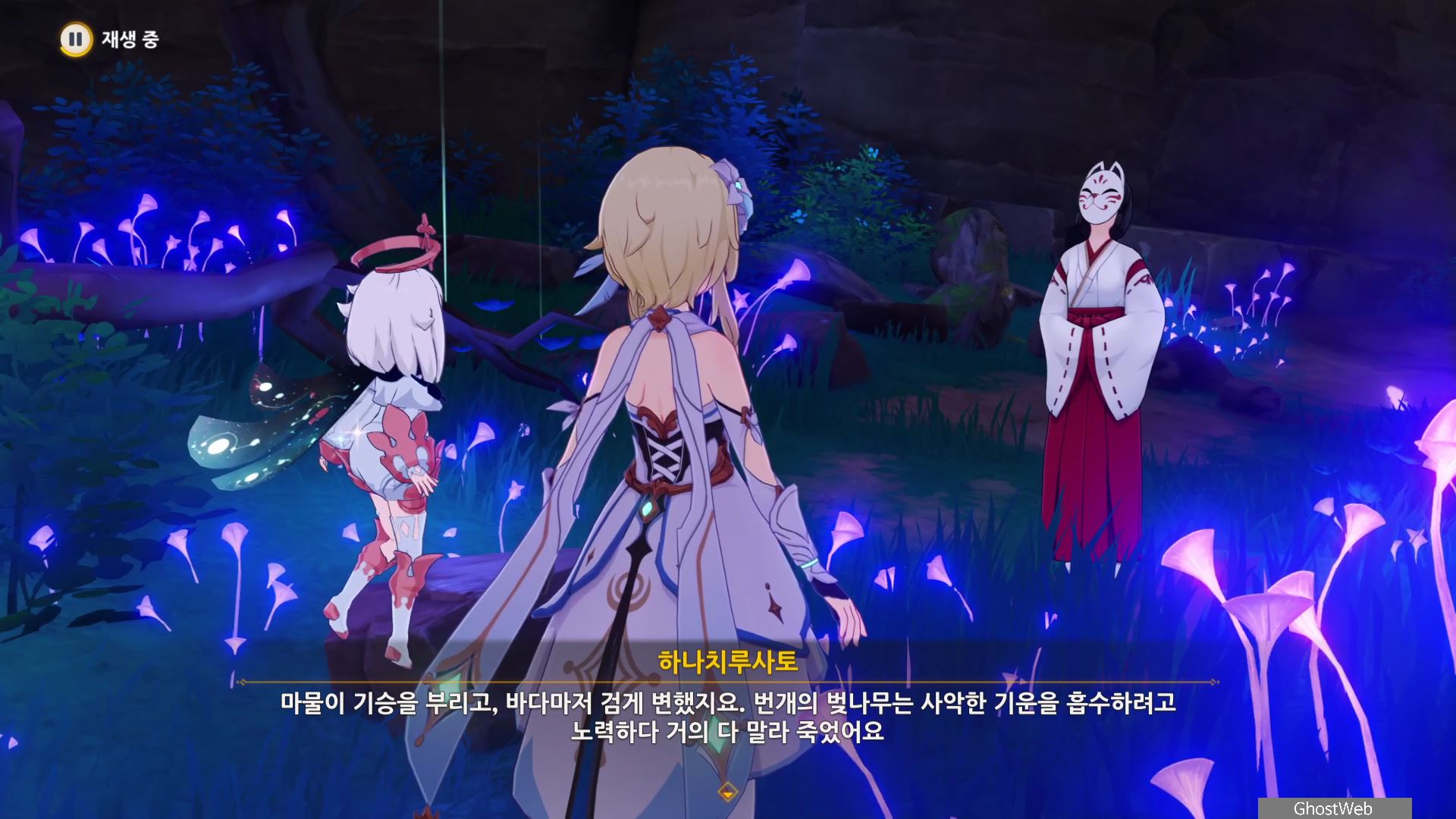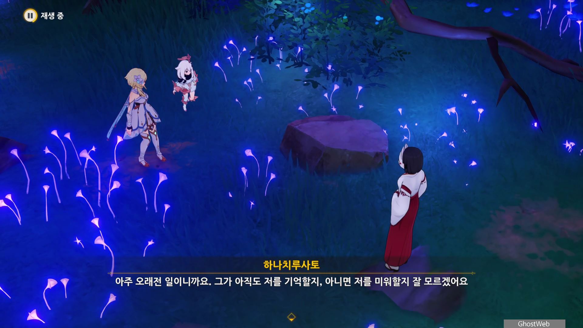 몬스터를 처치 후 하나치루사토와 대화를 통해 진수의 숲 속에 주술 도구와 정화가 필요한 나무뿌리가 있는 정화를 위해 옛 친구의 도움을 받아야 한다고 해요.