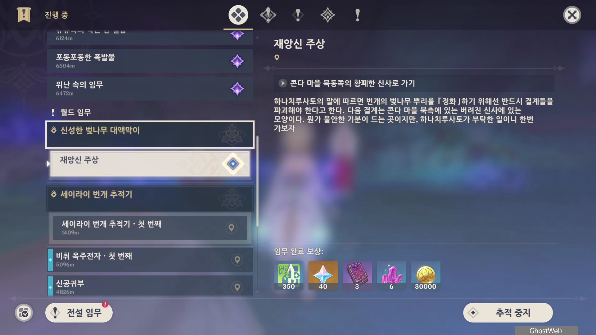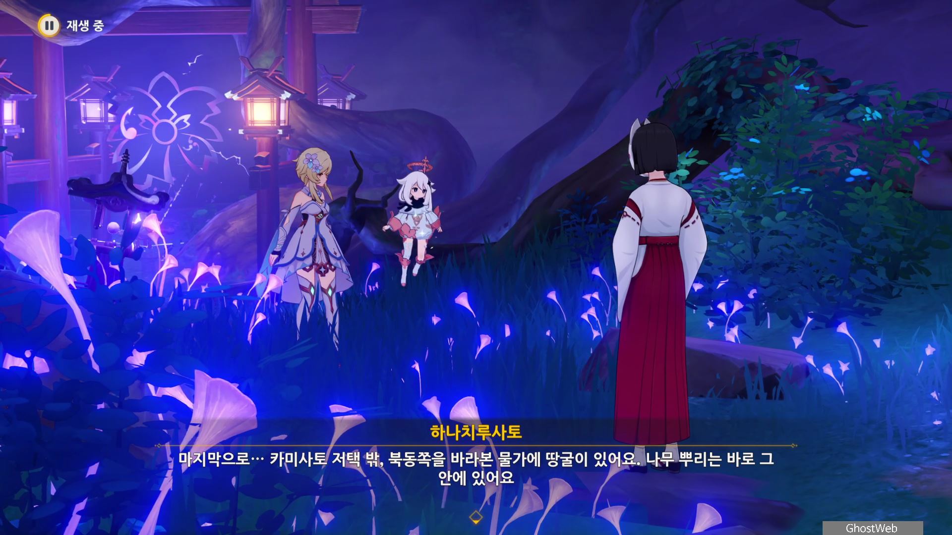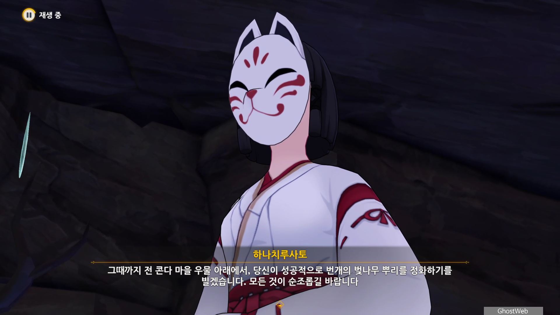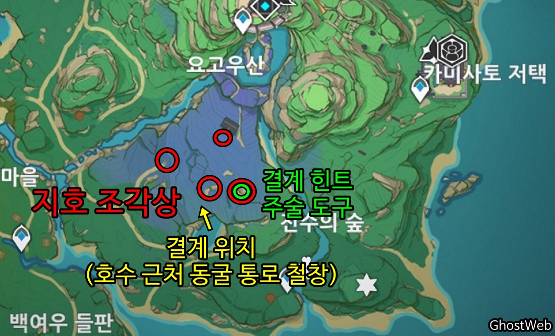 그리고 황해, 카미사토 저택 밖 북동쪽 물가 땅굴 속에 나무 뿌리가 있다는 것을 알려주며 자신은 콘도 마을 우물에서 기다리겠다고 하며, 이제 앞에서 말한 3곳으로 가 <신성한 벚나무 대액막> 임무(결계 파괴)를 진행하시면 돼요.
