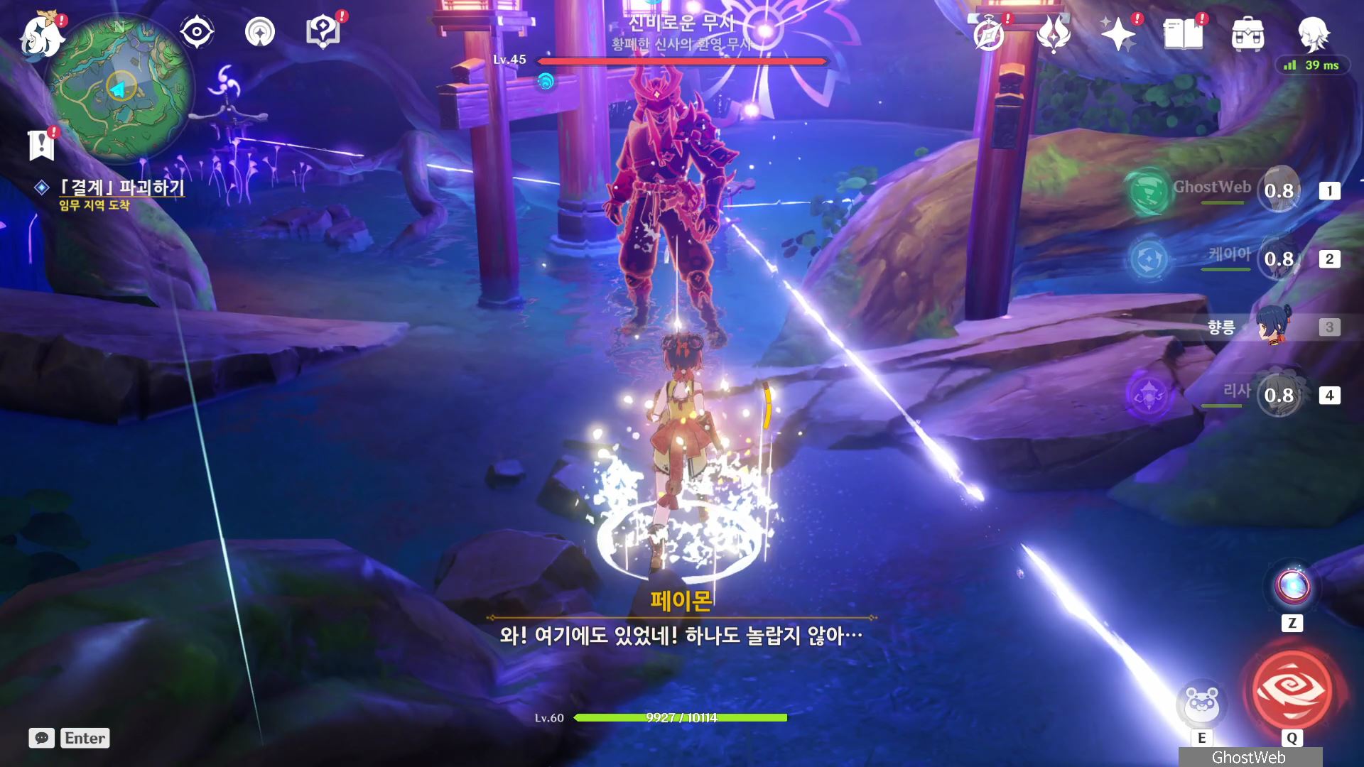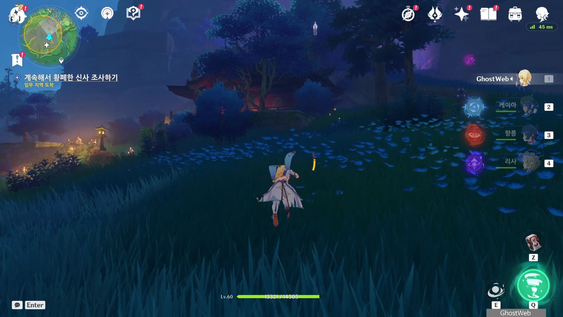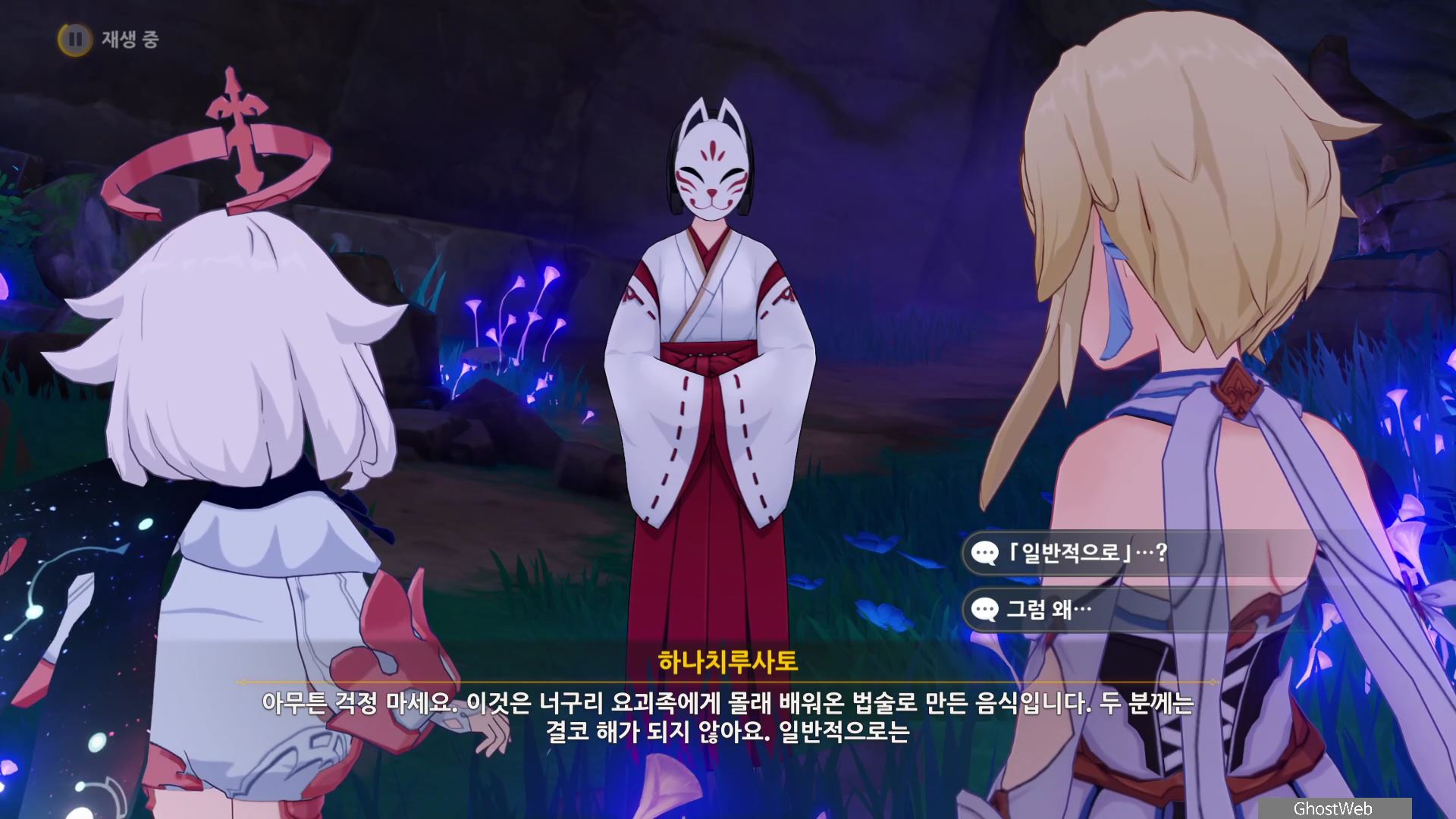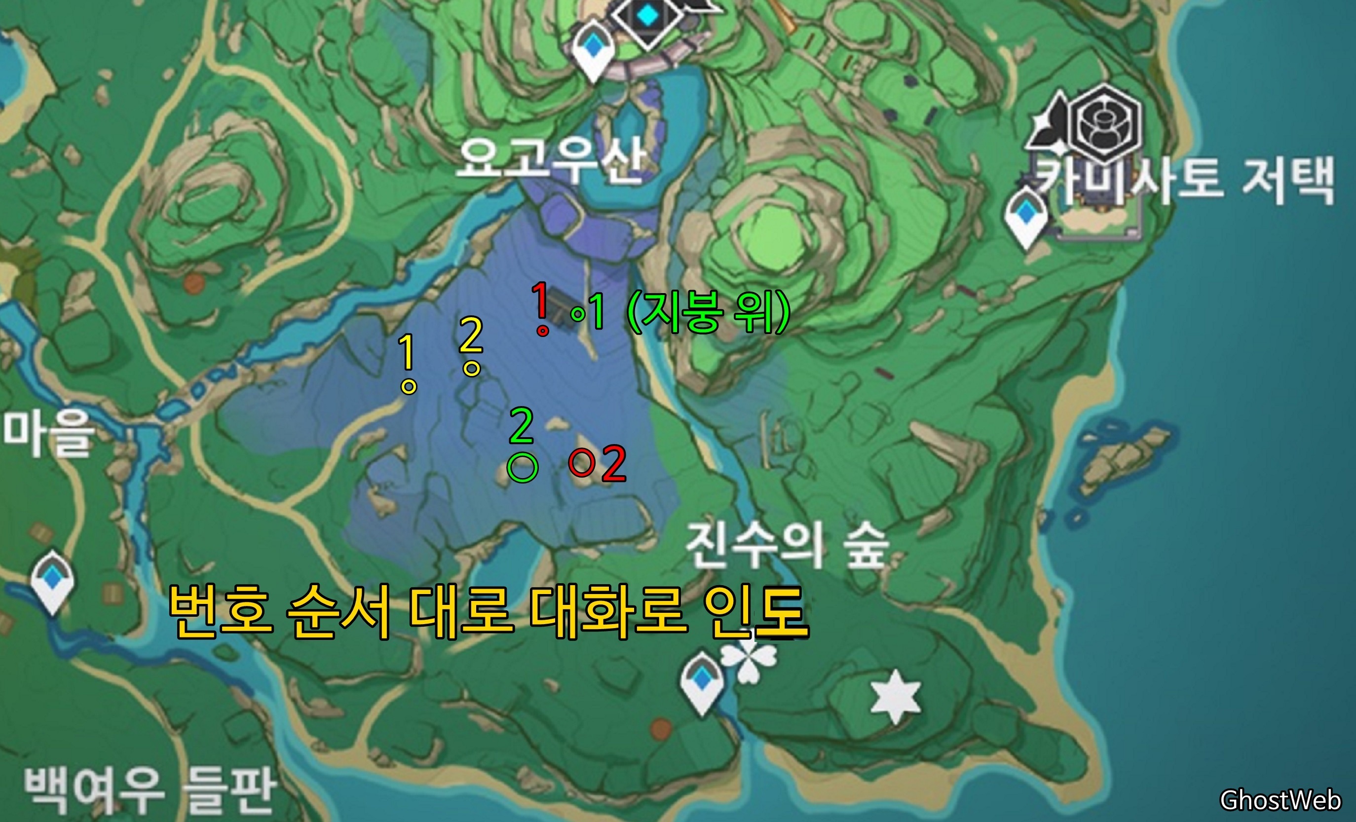 그리고 황해, 카미사토 저택 밖 북동쪽 물가 땅굴 속에 나무 뿌리가 있다는 것을 알려주며 자신은 콘도 마을 우물에서 기다리겠다고 하며, 이제 앞에서 말한 3곳으로 가 <신성한 벚나무 대액막> 임무(결계 파괴)를 진행하시면 돼요.