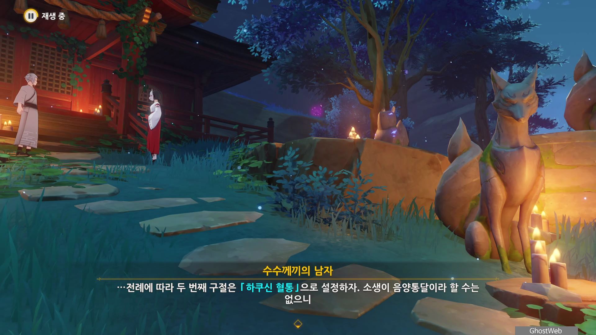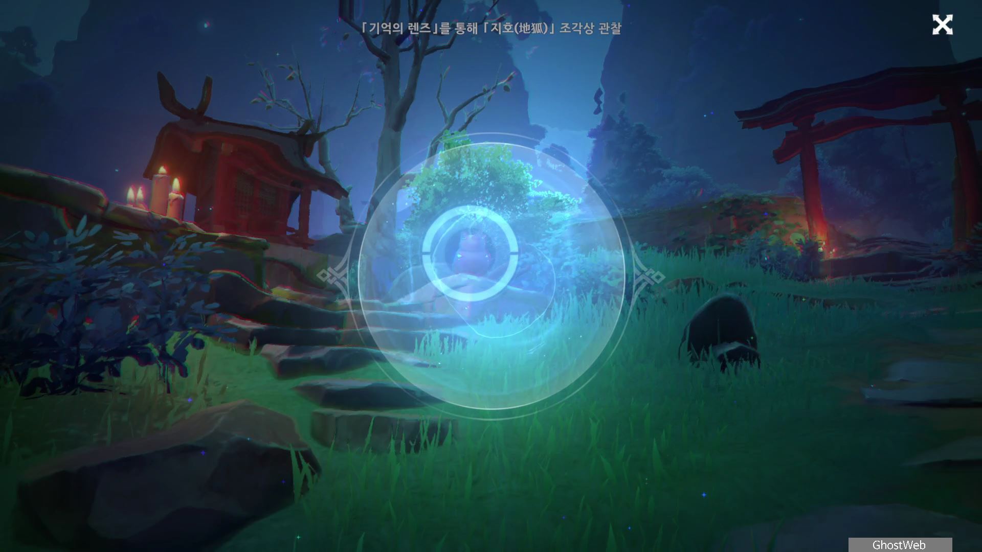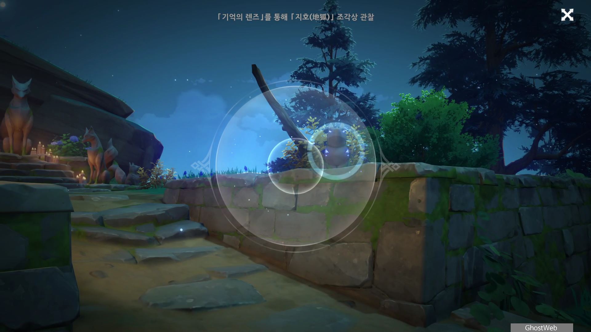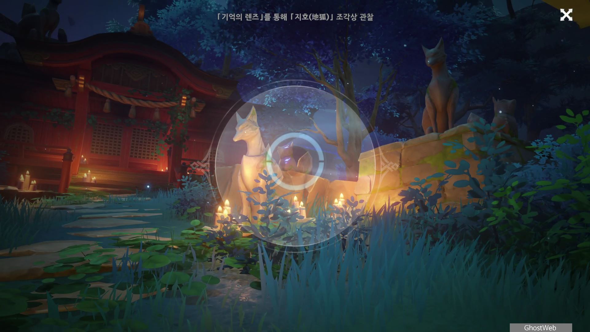 다시 황폐한 신사로 돌아가 입구 쪽에 있는 여우 석상부터 기억의 렌즈로 과거의 일을 볼 수 있으며, 언령과 결계 위치에 대한 힌트를 얻을 수 있어요.