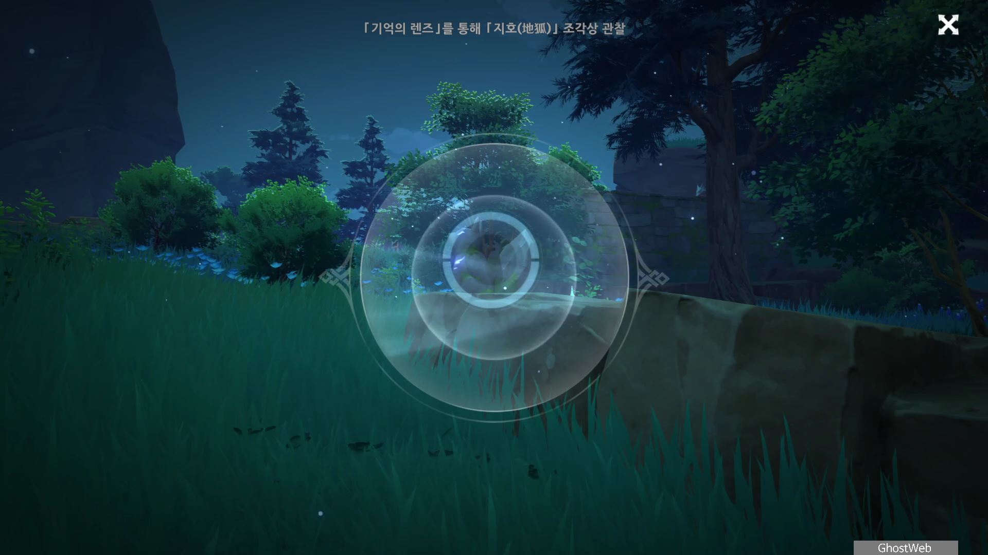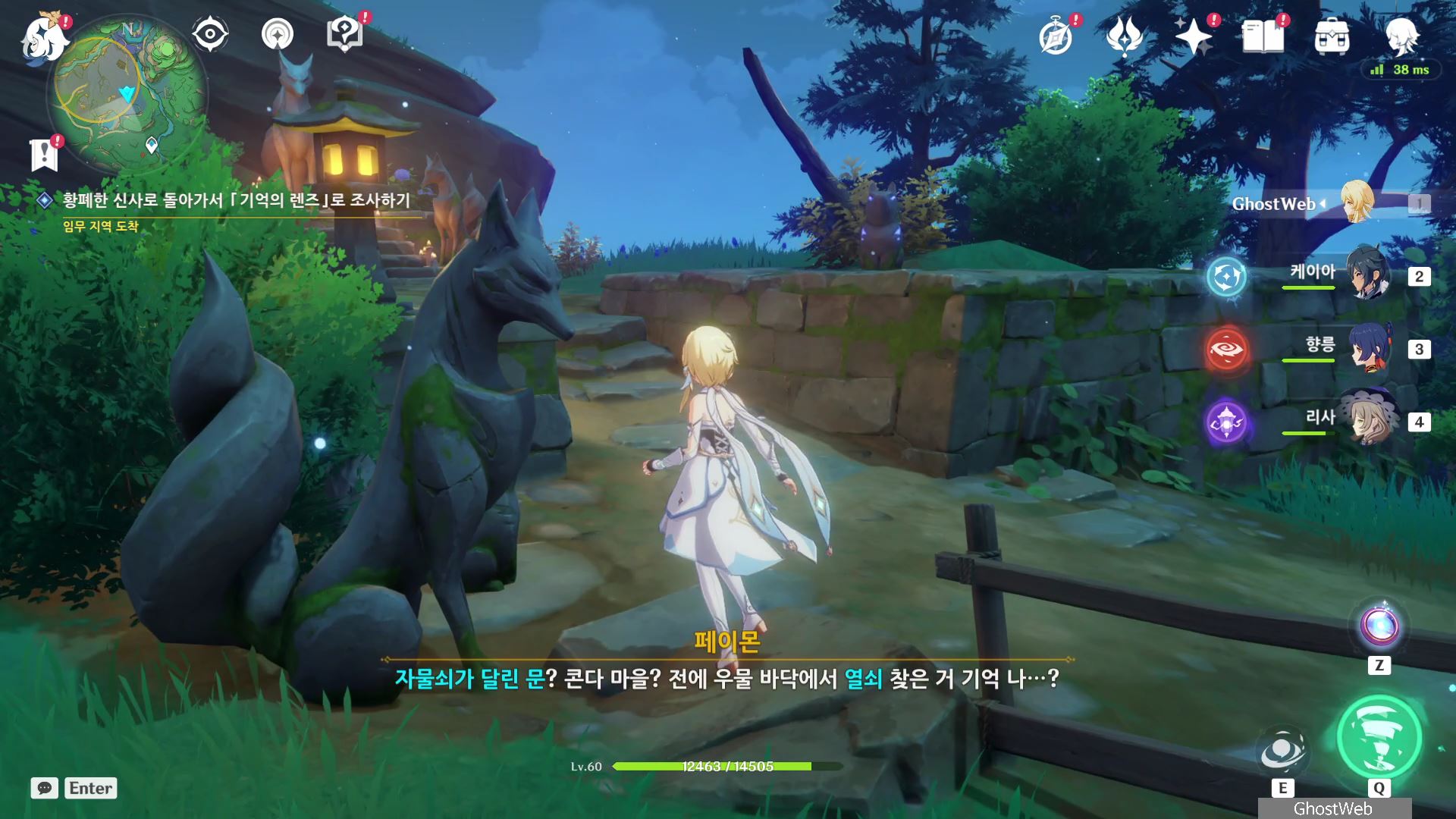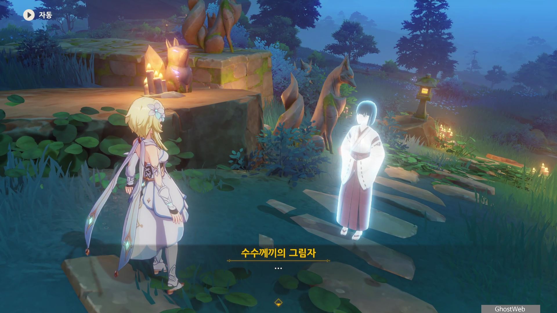 다시 황폐한 신사로 돌아가 입구 쪽에 있는 여우 석상부터 기억의 렌즈로 과거의 일을 볼 수 있으며, 언령과 결계 위치에 대한 힌트를 얻을 수 있어요.