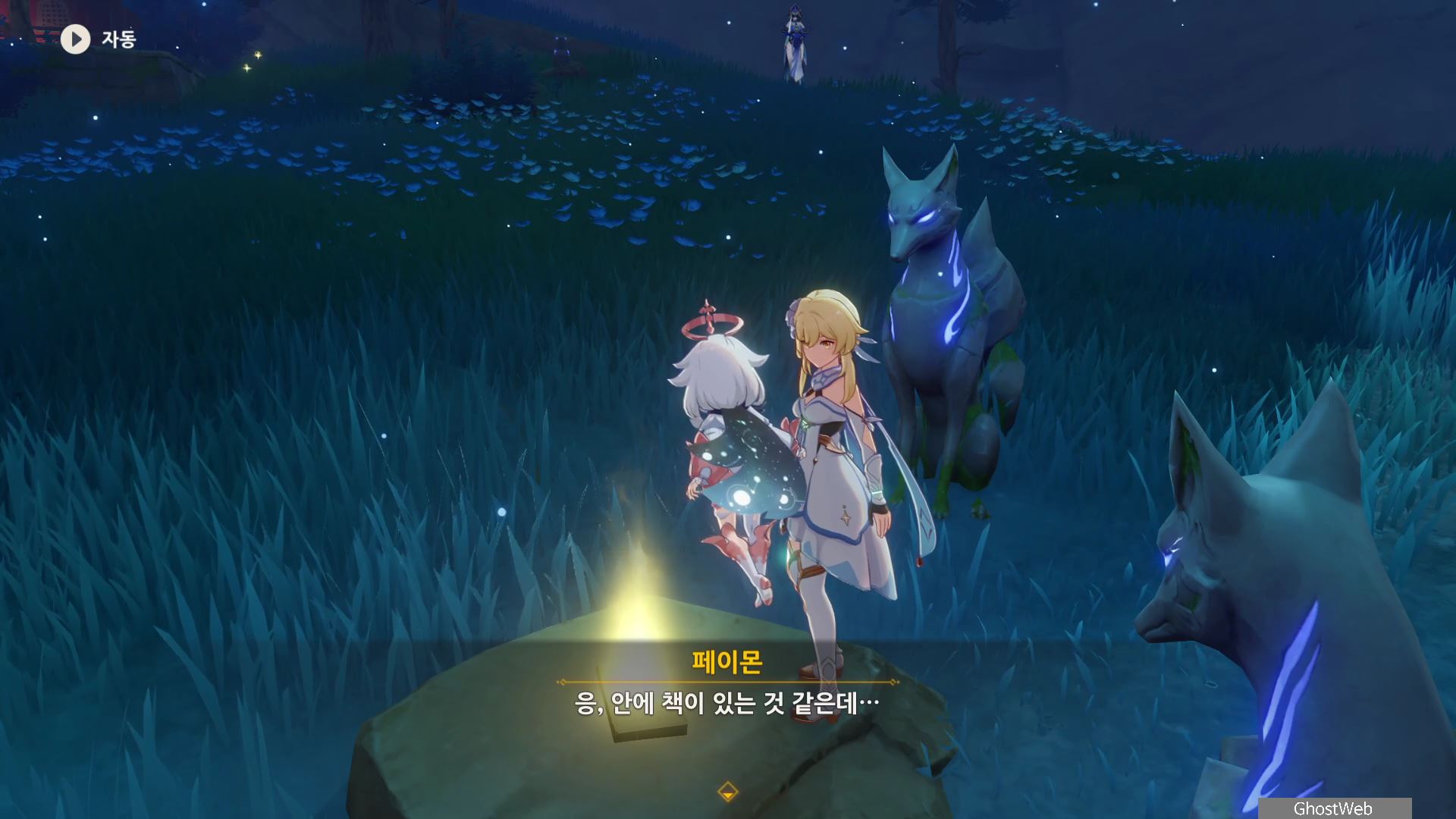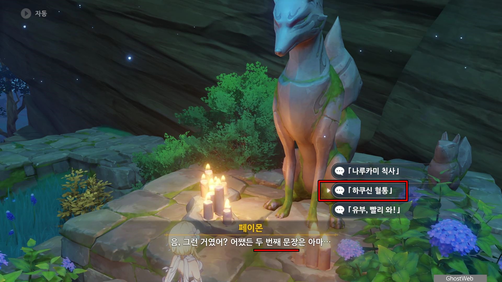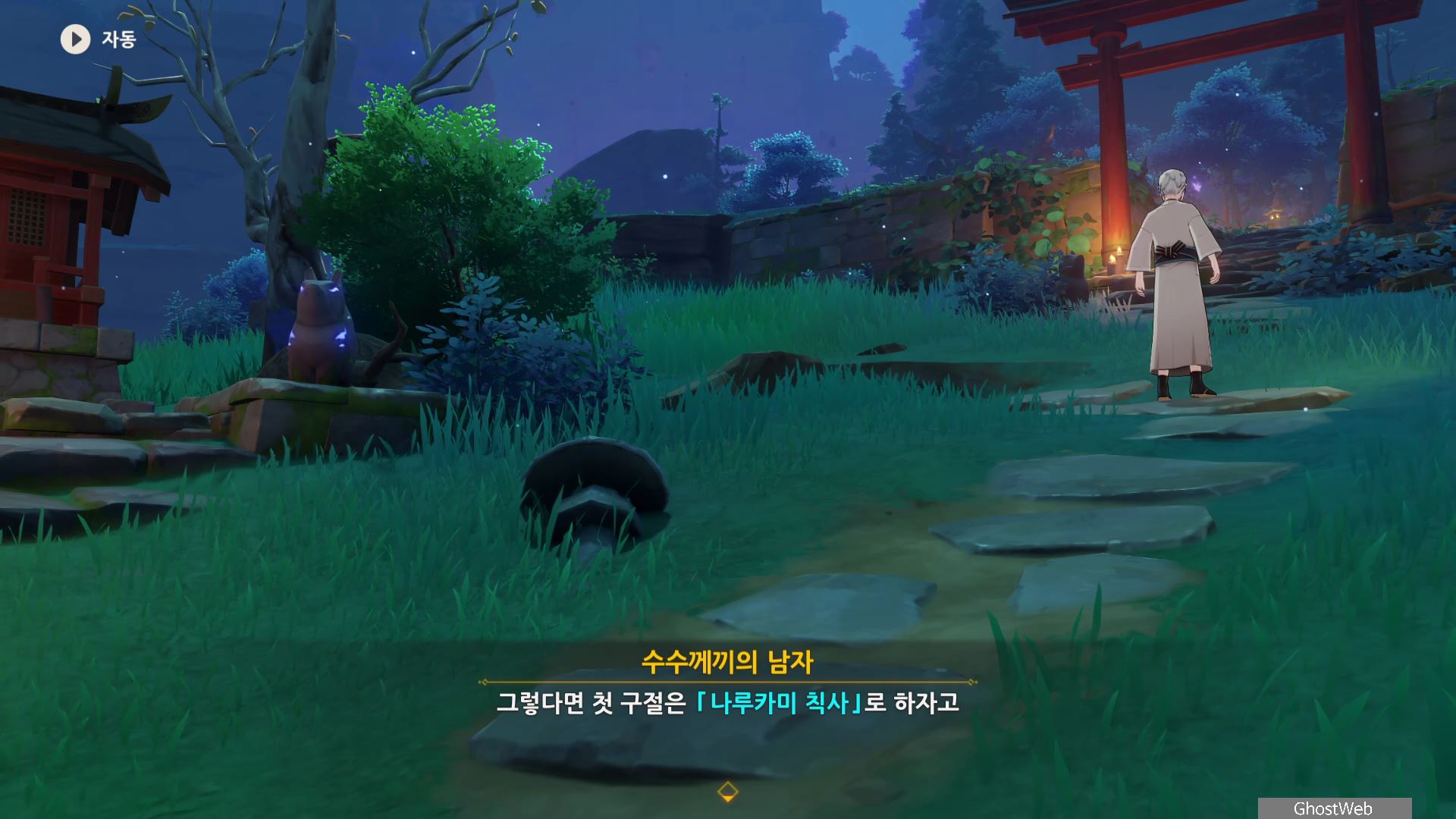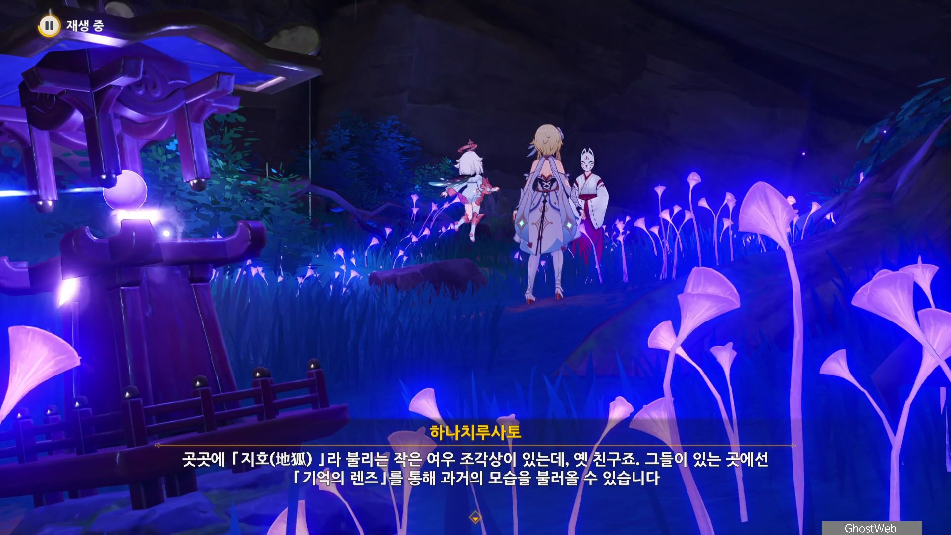 다시 황폐한 신사로 돌아가 입구 쪽에 있는 여우 석상부터 기억의 렌즈로 과거의 일을 볼 수 있으며, 언령과 결계 위치에 대한 힌트를 얻을 수 있어요.