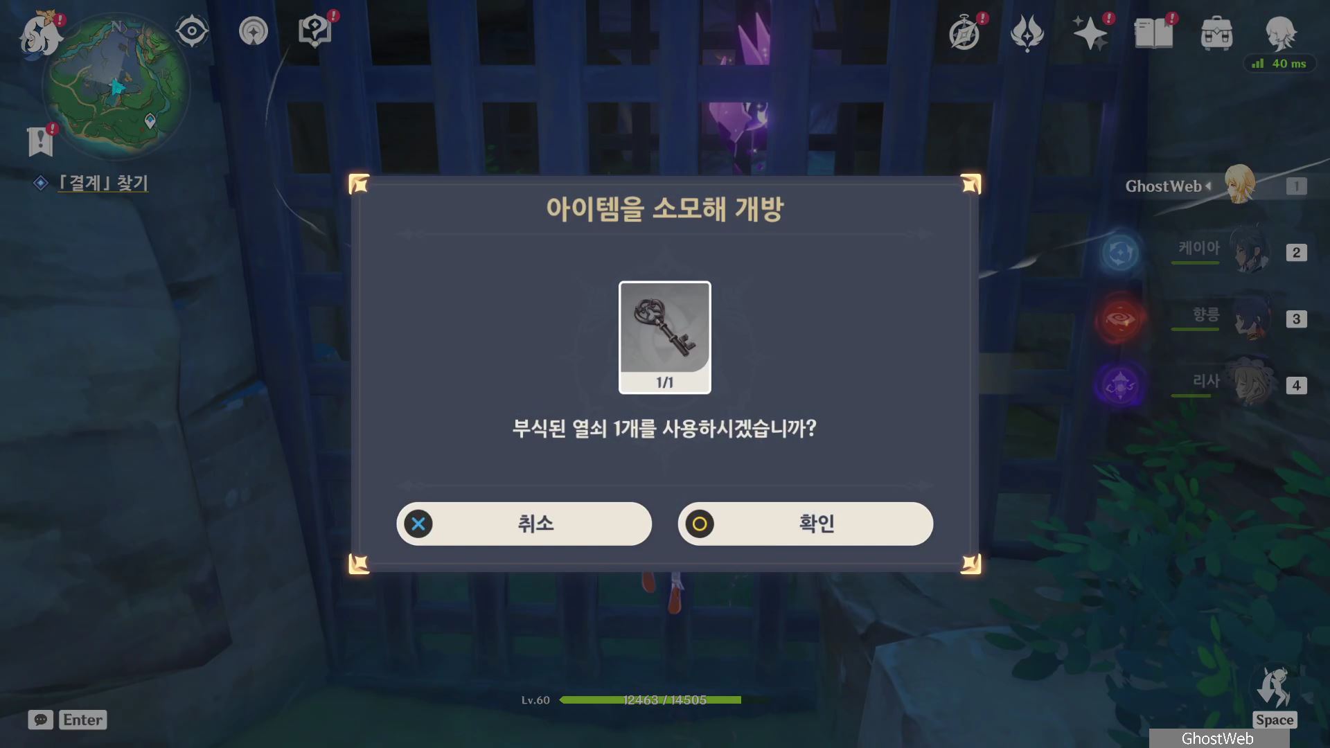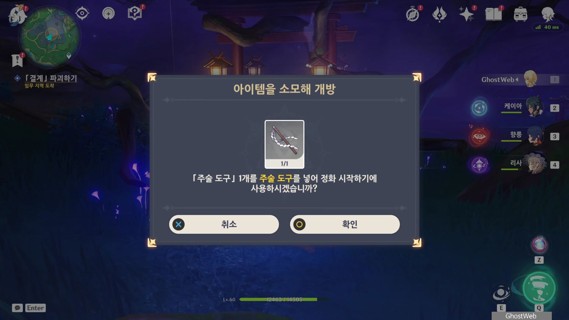 주술 도구를 획득하고 신사에서 남동 쪽아래 있는 호수 한쪽에 있는 동굴 통로에 철창이 있는 문을 <콘다 이야기> 임무를 진행할 때 콘다 우물에서 얻은 열쇠를 사용하여 문을 개방하고 번개 신의 눈동자를 획득하고 결계가 있는 방 안으로 들어가세요.