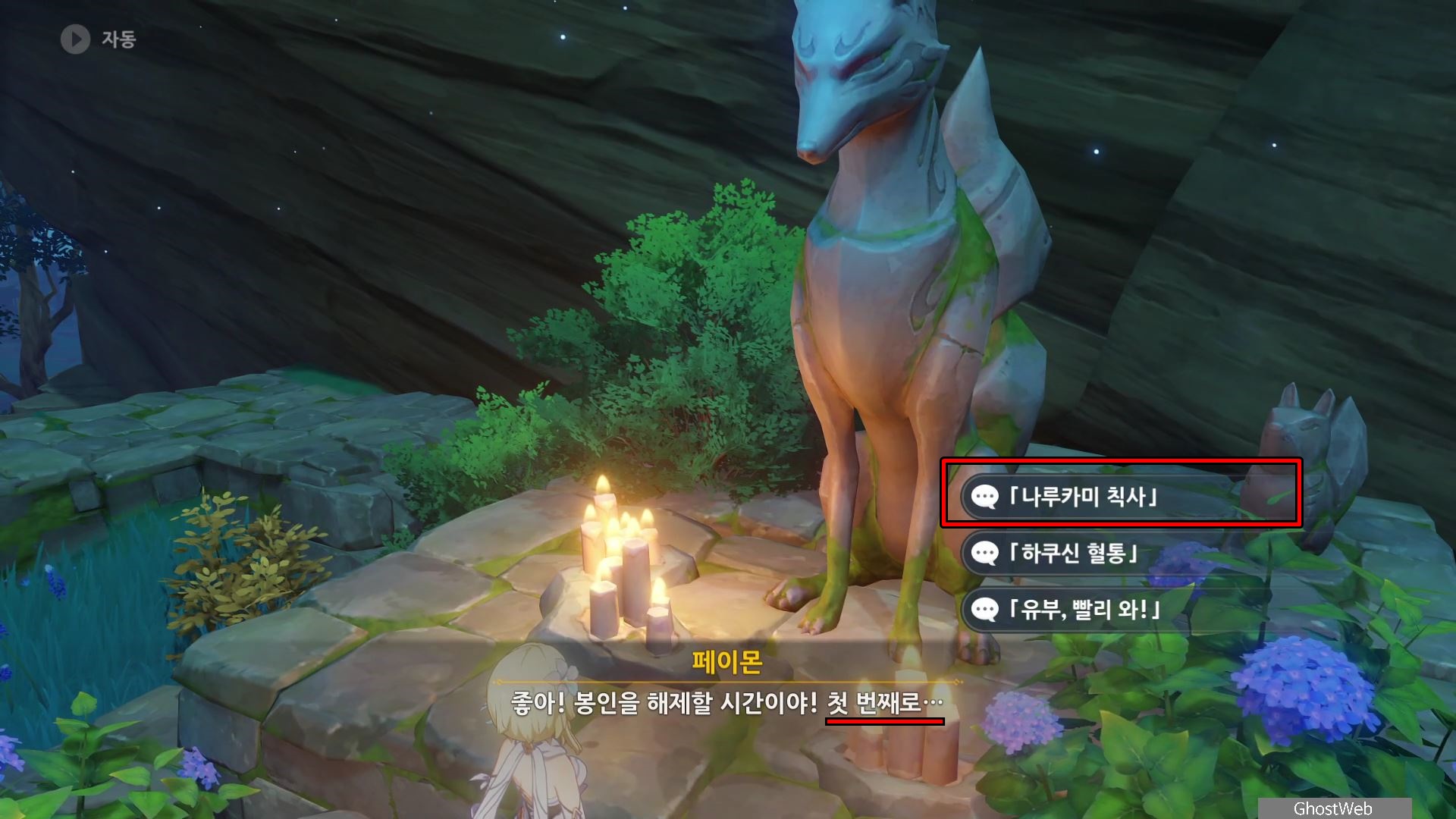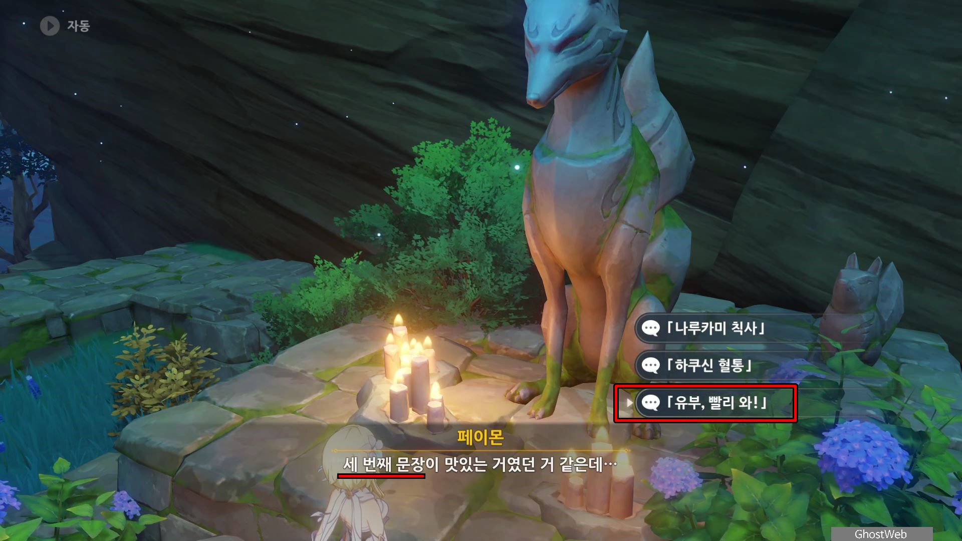 언령 3가지 대한 정보를 모아 신사 동쪽에 있는 여우 석상에 가서 언령을 외쳐 봉인을 해제하면 주술 도구를 얻을 수 있어요. (나루카미 칙사 → 하쿠신 혈통 → 유부, 빨리 와!)
