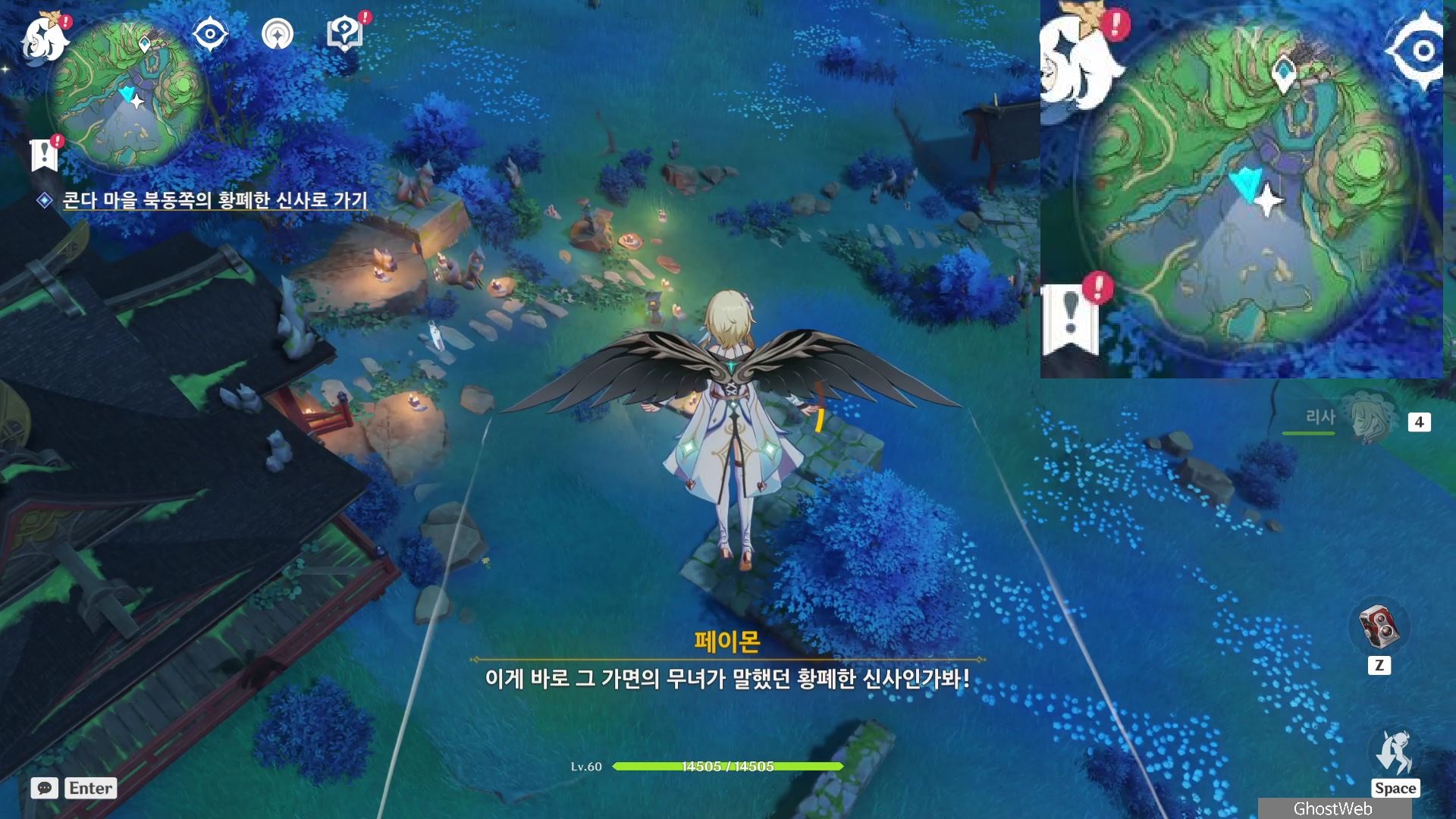 지도에 표시되는 황폐한 신사를 올라가다 보면 무녀 복을 입고 있는 <수수께끼의 그림자>를 볼 수 있는데, 대화를 걸면 사라지며 다음 장소로 이동해요.