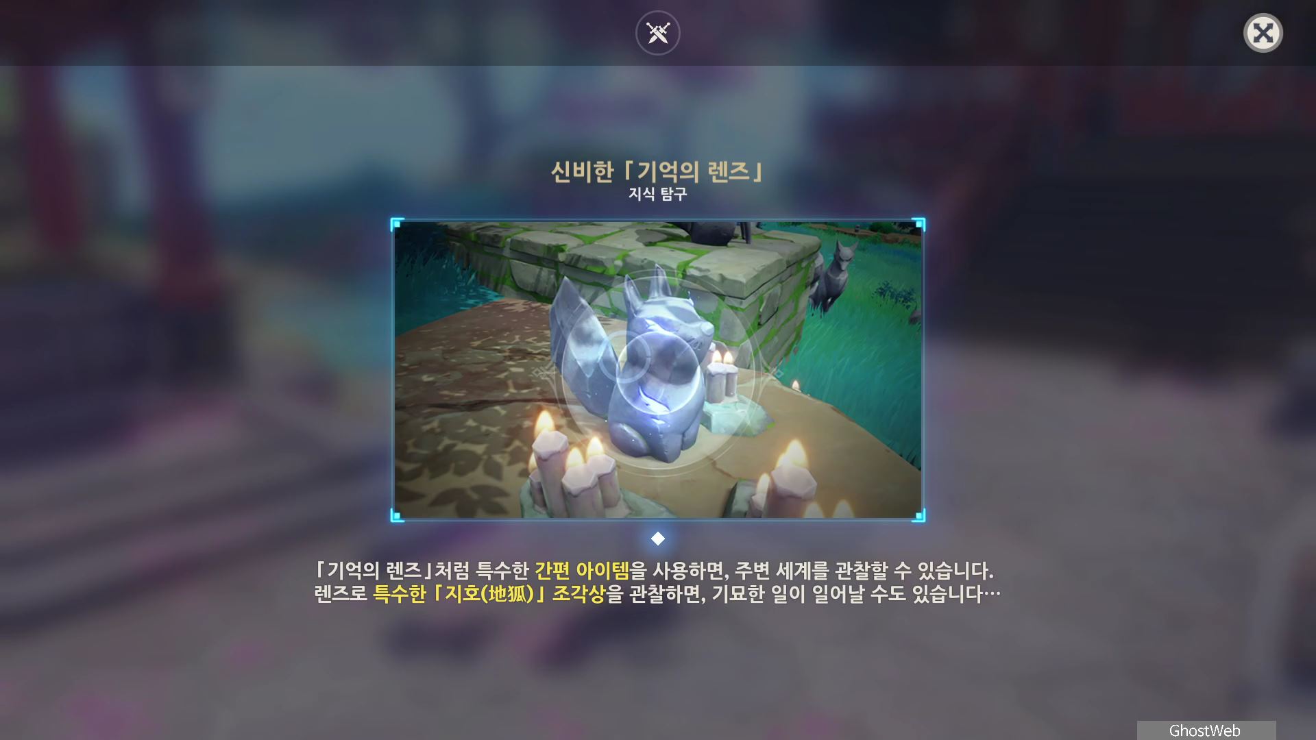 (기억의 렌즈는 가방에서 장비하여 Z키를 눌러 여우 석상(지호)을 관찰하면 숨겨진 것들의 모습을 들어나거나 옛 이야기를 들을 수 있어요.)