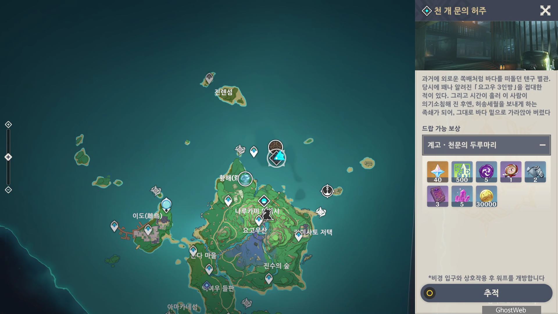 해당 지역에 가기 위해서는 <기억의 렌즈>라는 아이템이 필요한데, 이는 이나즈마 월드 임무 <신성한 벚나무 대액막이 - 재앙신 주상> 임무 진행 시 얻을 수 있기 때문에 기억의 렌즈가 없으신 분은 먼저 아래에 월드 임무 순서대로 임무를 진행하시길 바라며, 해당 임무의 상세 내용은 아래의 별도의 글을 참고하세요.