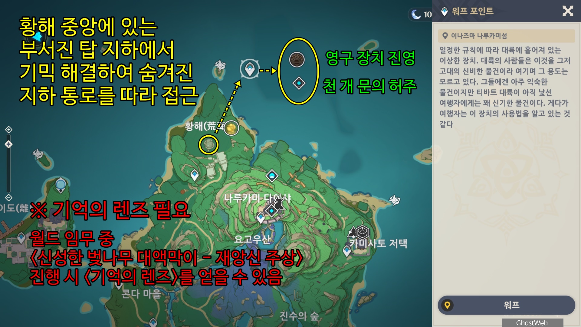 이번에는 이나즈마 나루카미 섬 위쪽(12시 방향)에 있는 황해 앞 바다 지하에 있는 워프 포인트, 영구 장치 진영, 천 개 문의 허주에 가는 방법을 알아보도록 할게요.